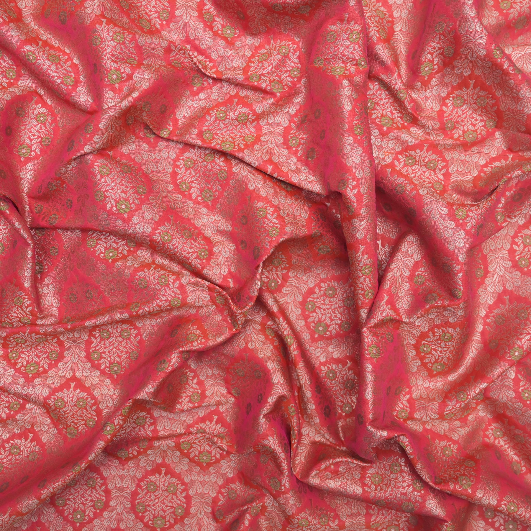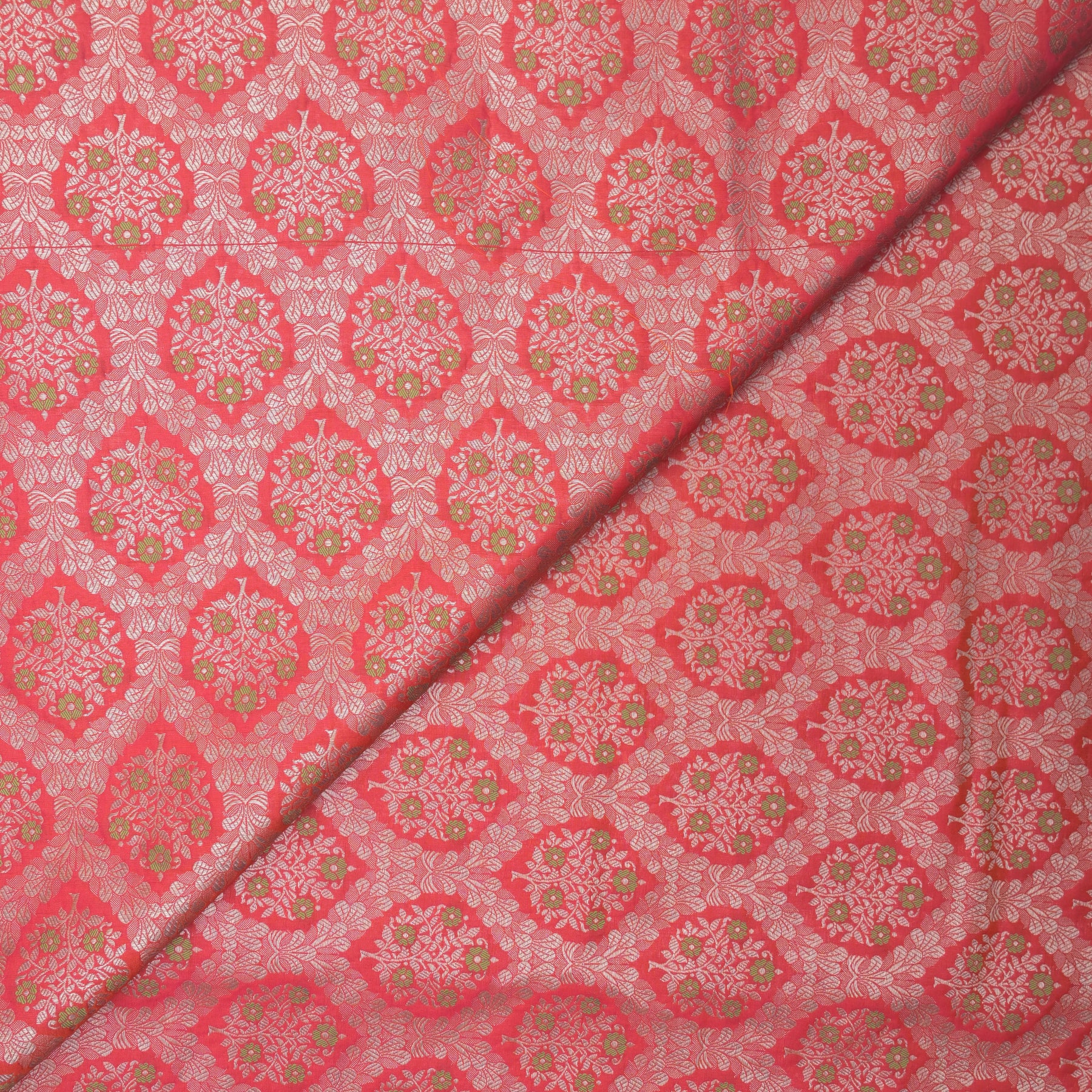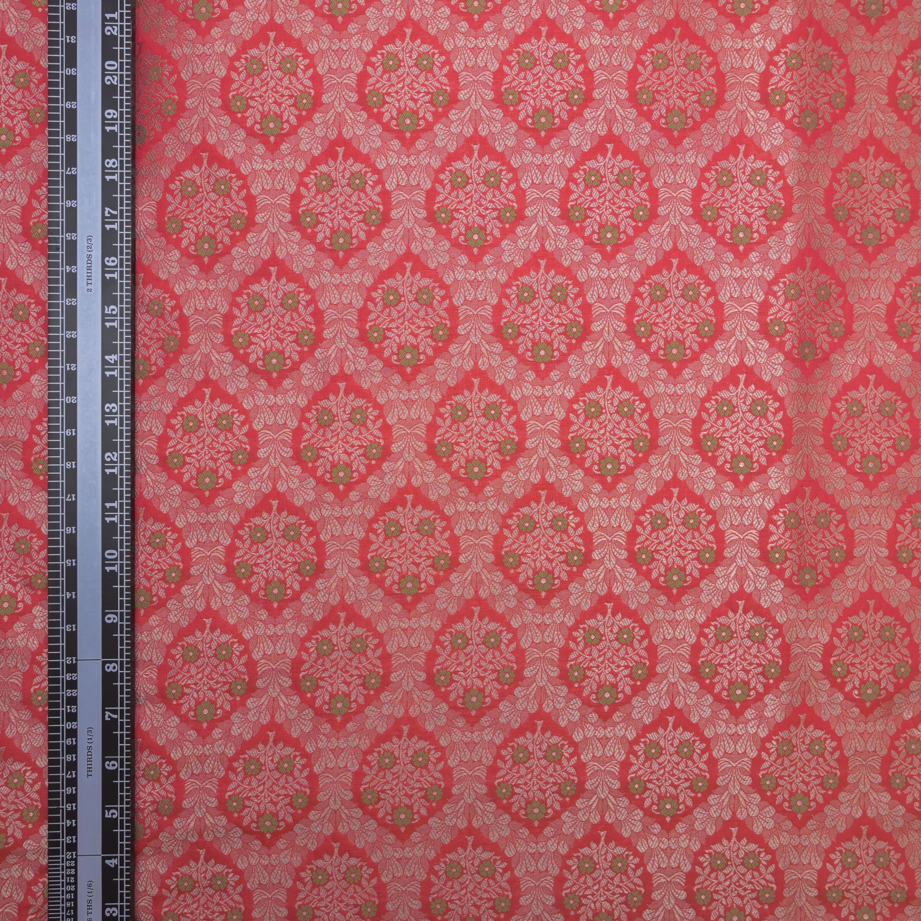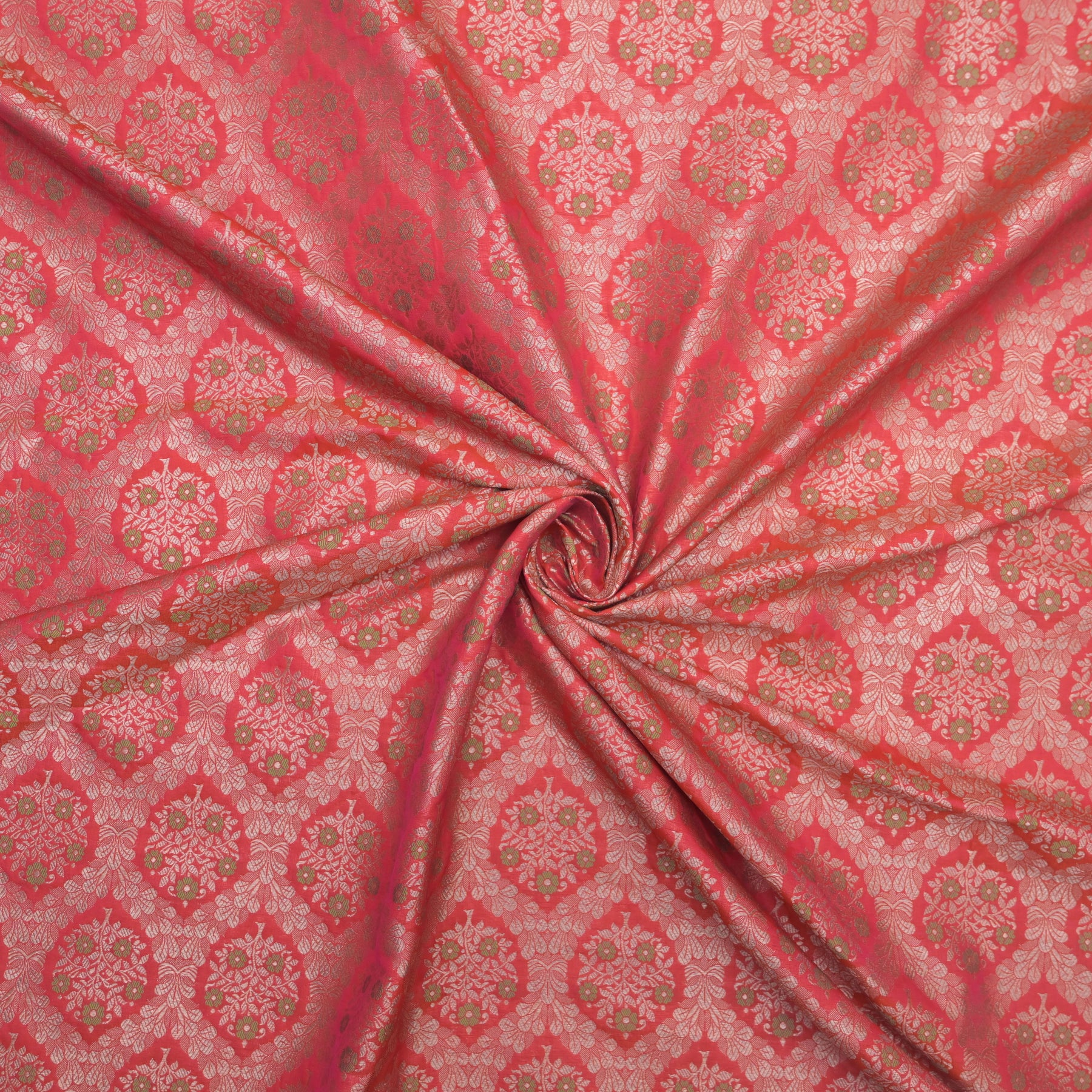 Fabric Name: Coral Red Brocade with allover Meena Zari Emboidery
