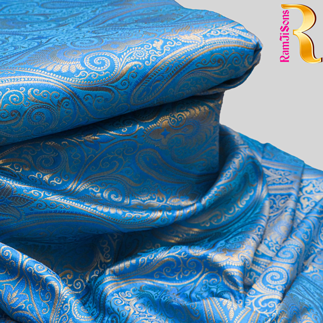 Sky Blue Gold Paisley Brocade Fabric.| 100-23-117