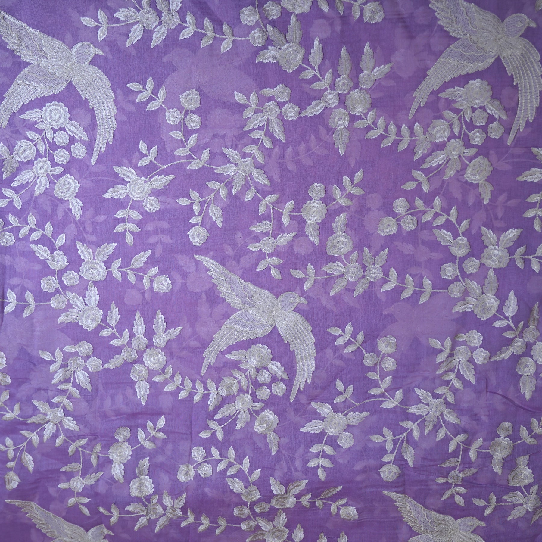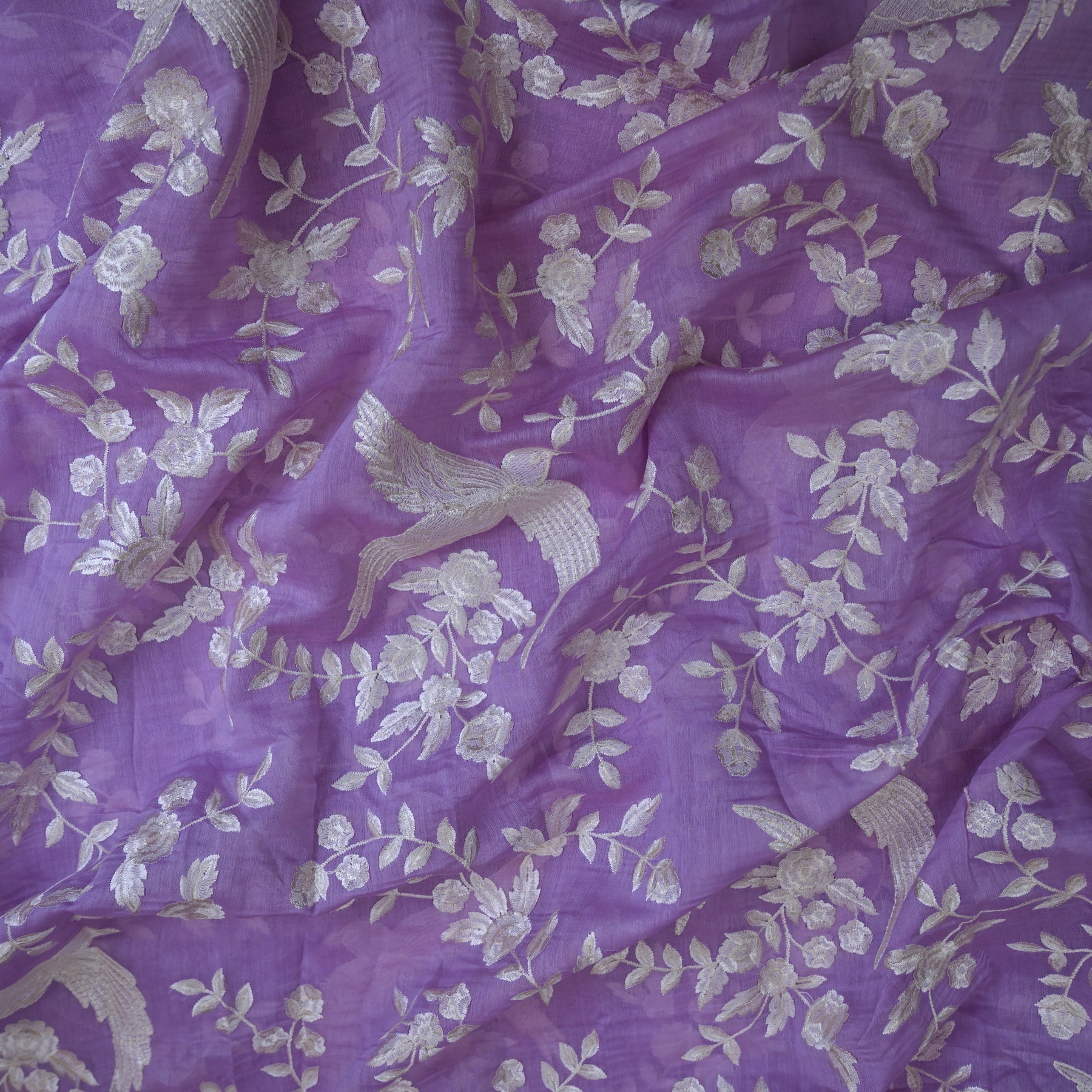 Delicate floral and bird-inspired embroidery motifs are finely detailed, creating a harmonious blend of tradition and contemporary charm. The subtle contrast of white embroidery against the lavender base enhances the fabric’s sophistication while maintaining an understated appeal.