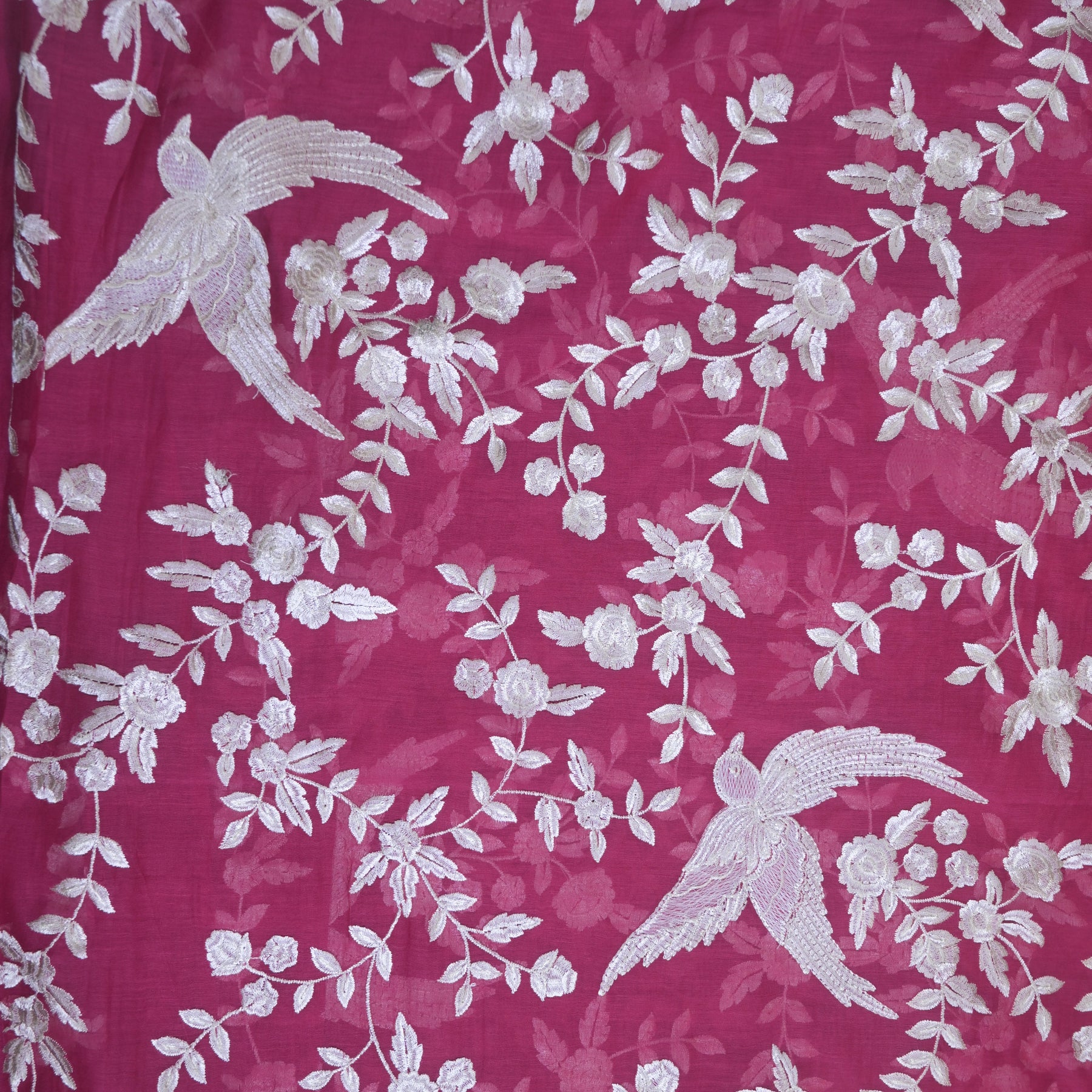 Intricate floral and bird-inspired motifs are meticulously embroidered in white thread, creating a striking contrast against the rich magenta base. The vibrant yet sophisticated tone makes this fabric ideal for festive wear, special occasions, and elegant ethnic ensembles.