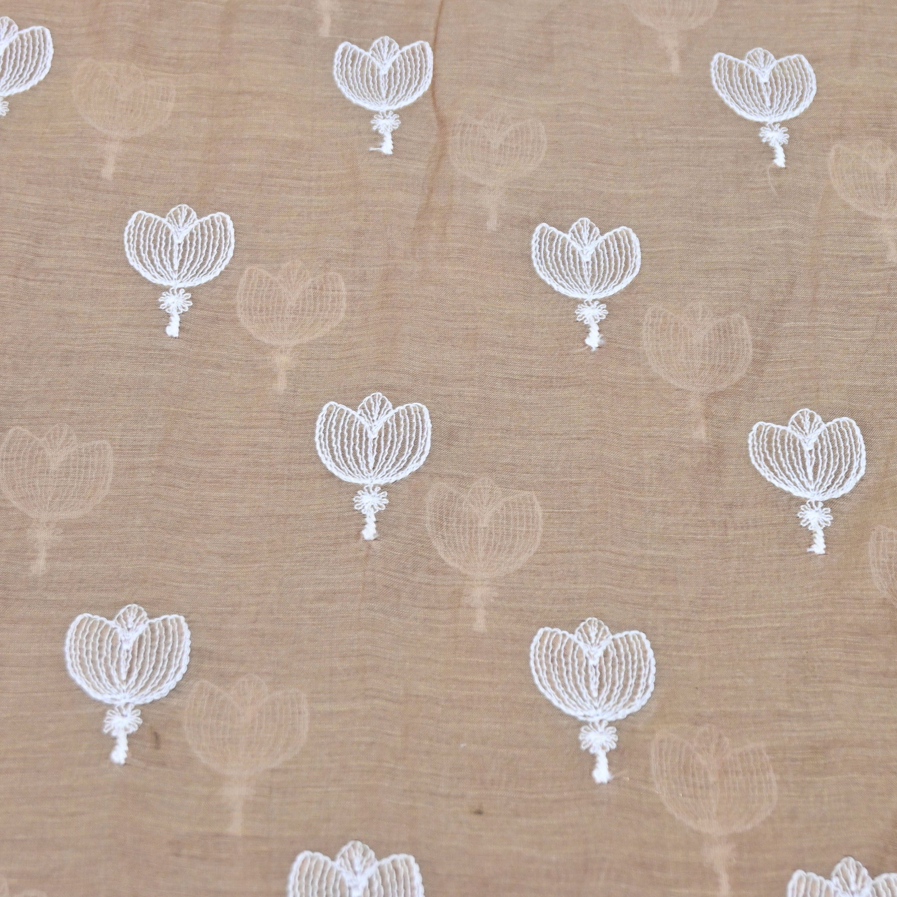 Adorned with delicate white floral thread embroidery and minimal dotted detailing, the design reflects understated elegance and timeless charm. The fine craftsmanship enhances the fabric without overpowering its airy beauty, making it ideal for sophisticated ethnic and contemporary silhouettes.
