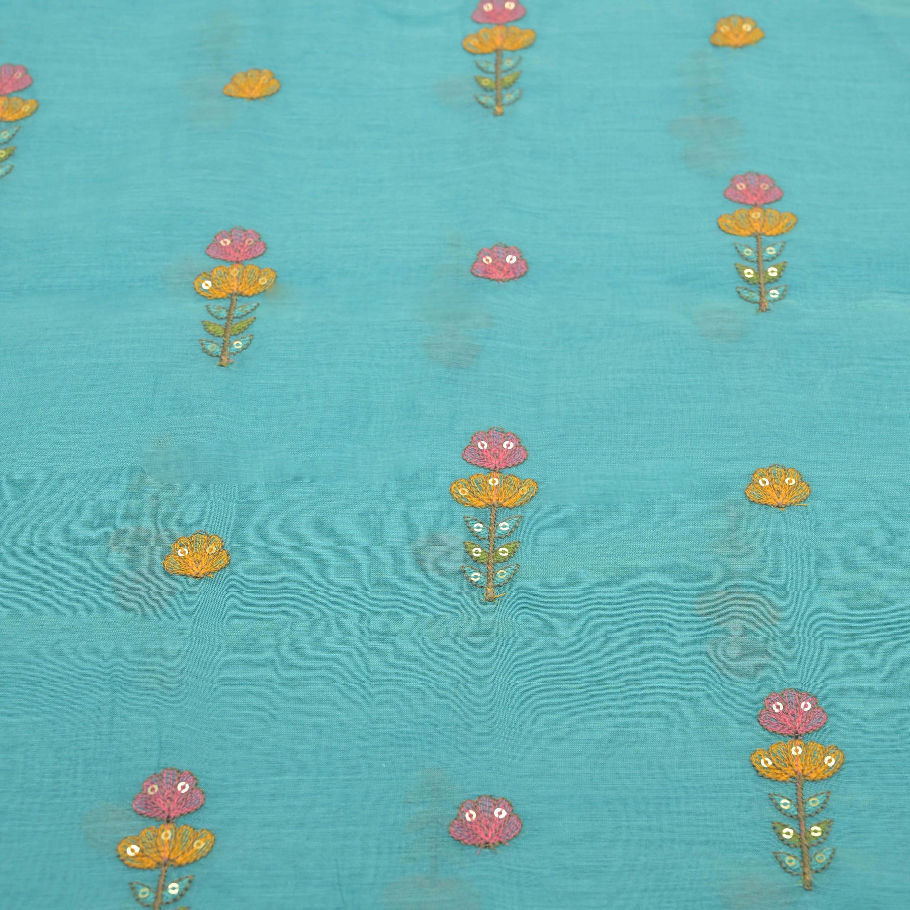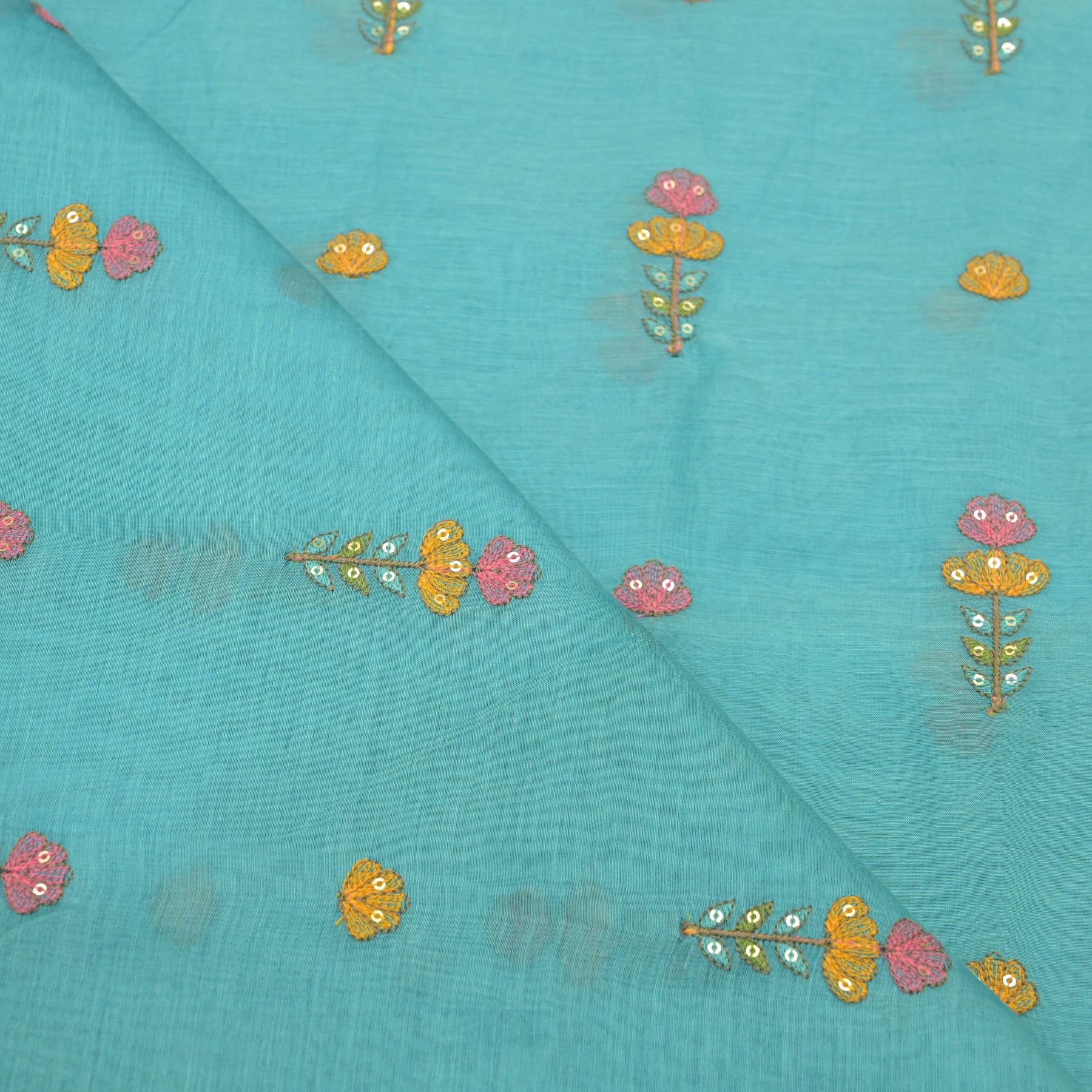 Sky blue mul chanderi Embroidered Floral Buti Fabric.