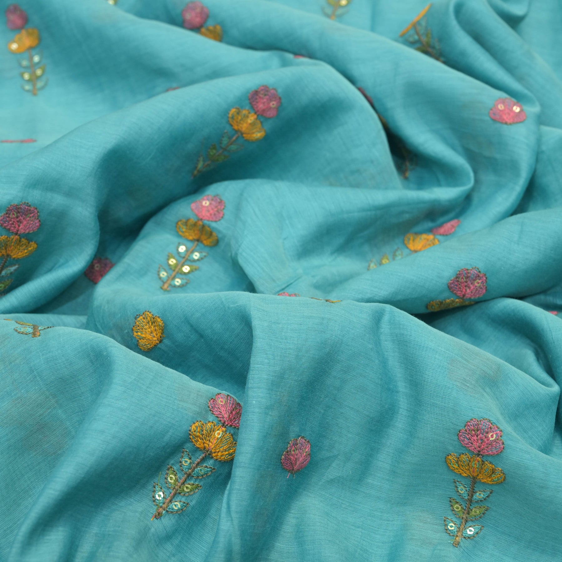 Sky blue mul chanderi Embroidered Floral Buti Fabric