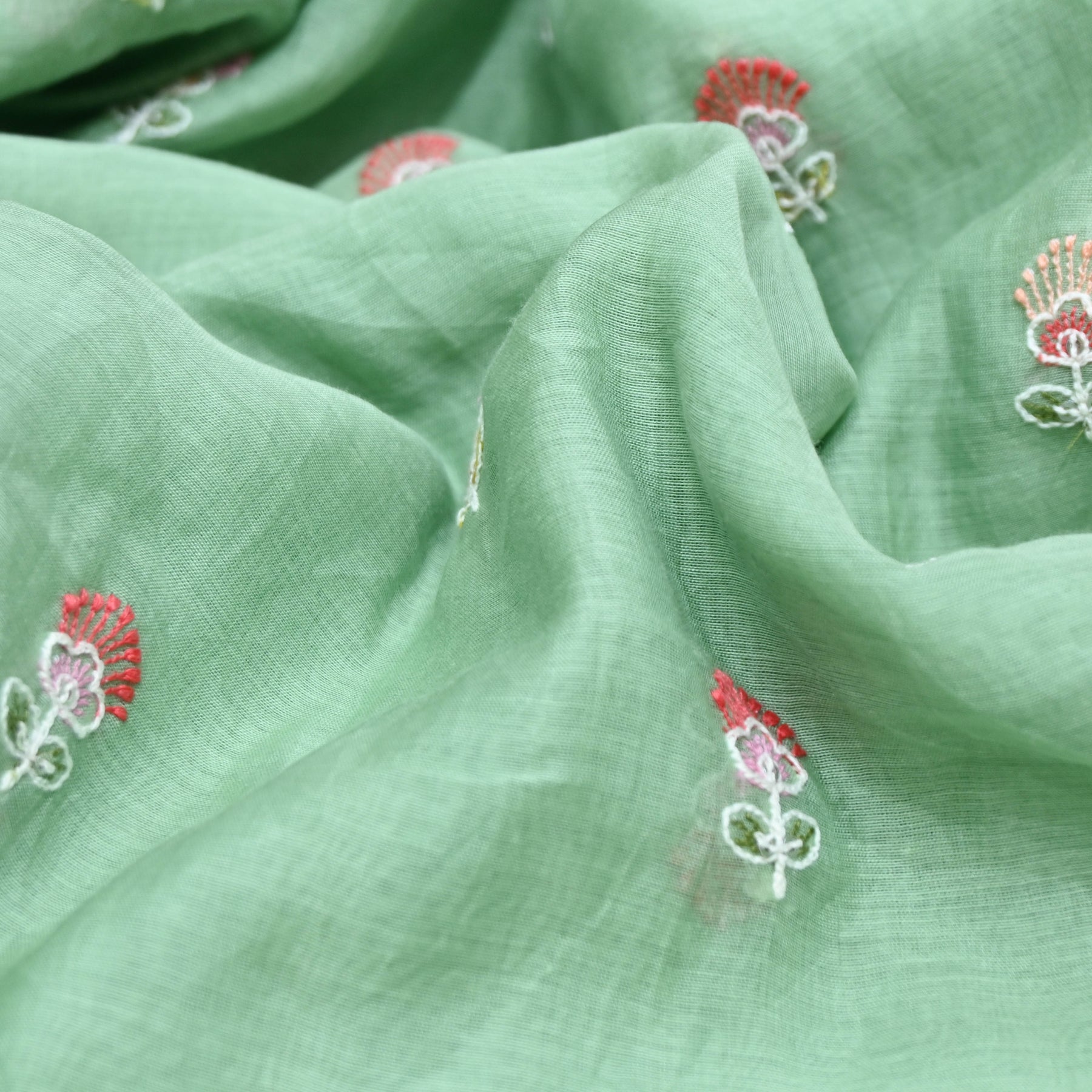 Elevate your summer collection with this graceful Mul Chanderi Sequins Thread Embroidery Fabric in a soothing shade. The soft, lightweight Mul Chanderi base offers a sheer texture with a subtle natural sheen, giving it an effortlessly refined appeal.