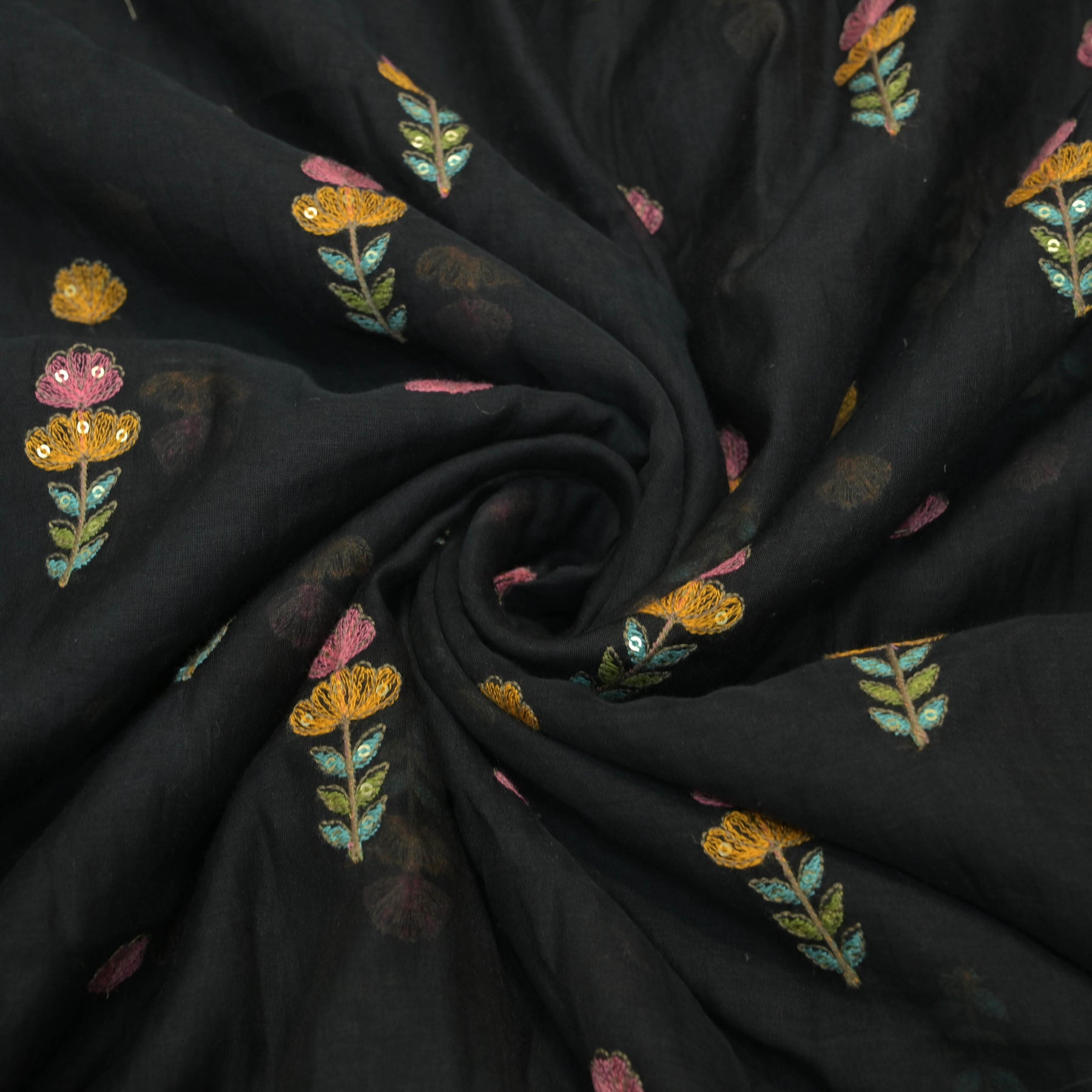 Graceful and timeless, this Black fabric is beautifully adorned with delicate floral buti embroidery spread evenly across the surface. The soft pink base is enhanced with multicolor threadwork featuring mustard, coral, and green tones, creating a charming handcrafted appeal.