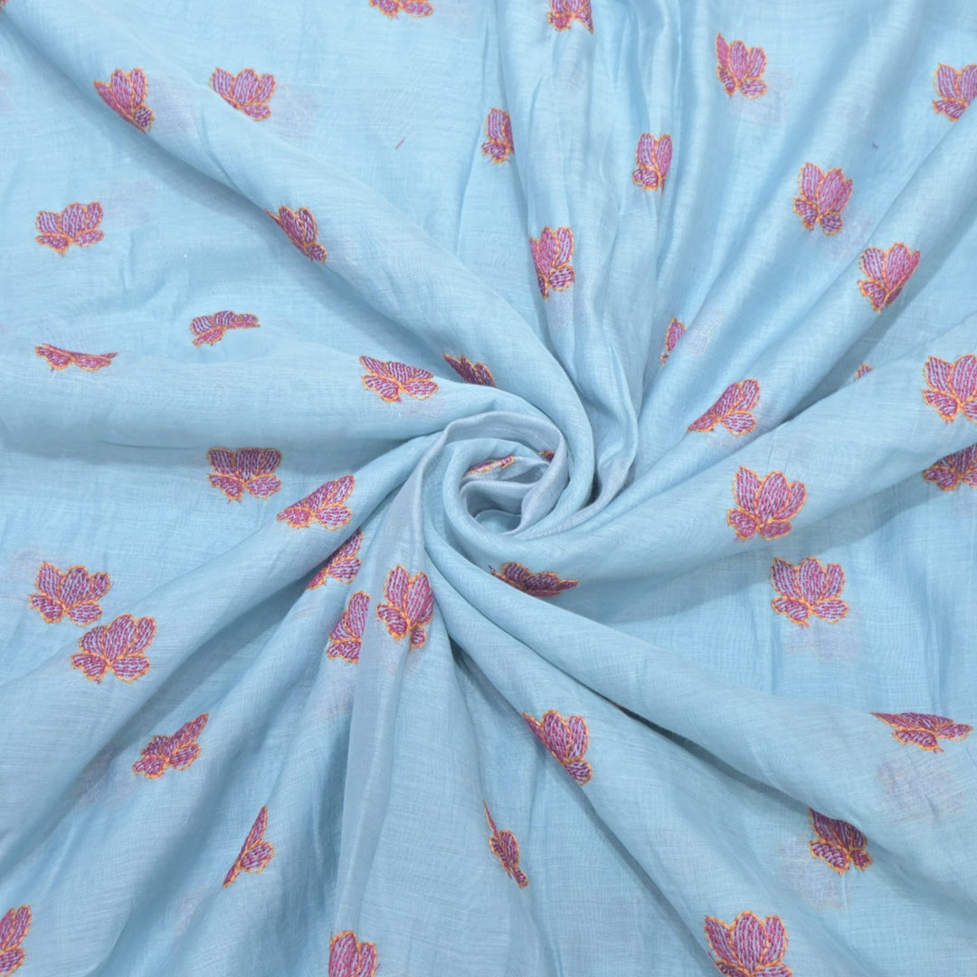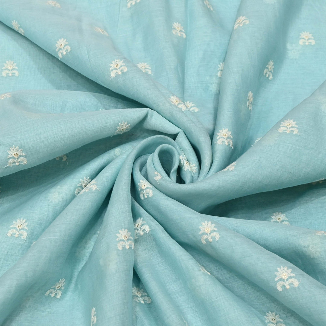 Sky blue mul chanderi Embroidered Floral Buti Fabric.