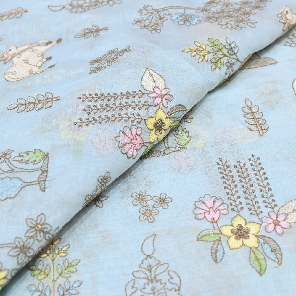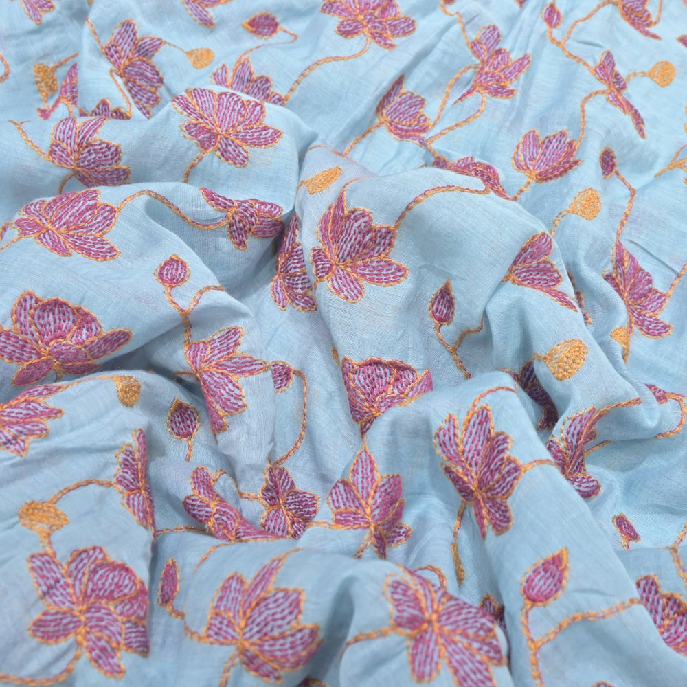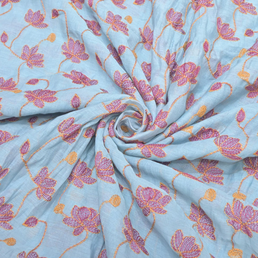 Sky Blue Mul Chanderi Fabric with Threadwork Embroidery
