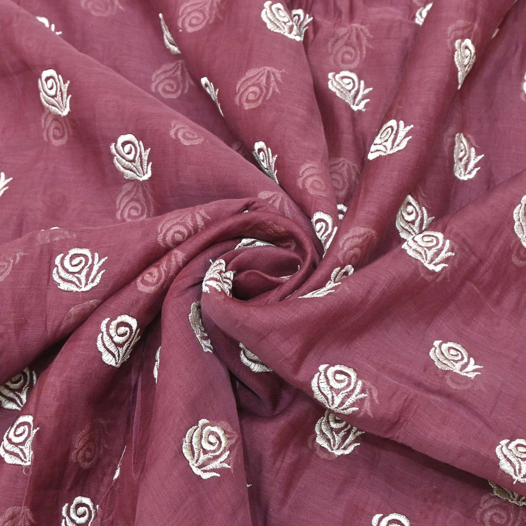 Wine Berry Color Mul Chanderi Floral Buti Embroidery Fabric