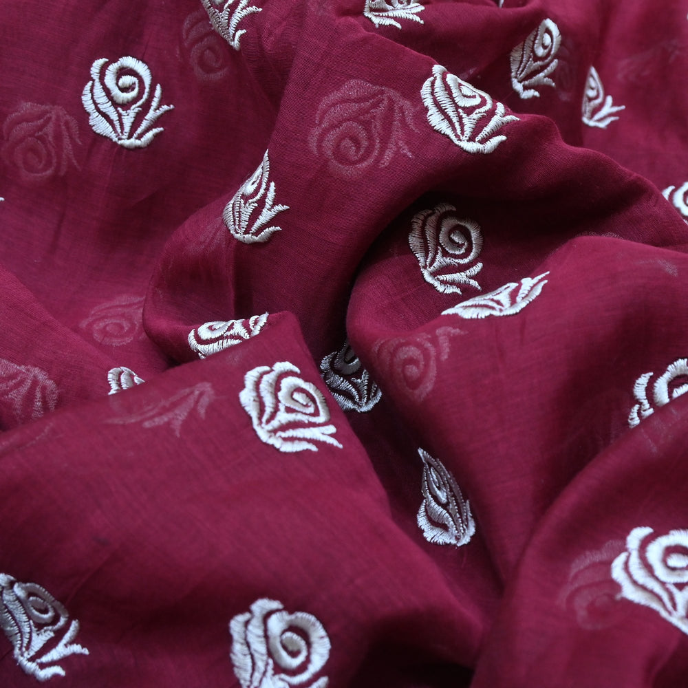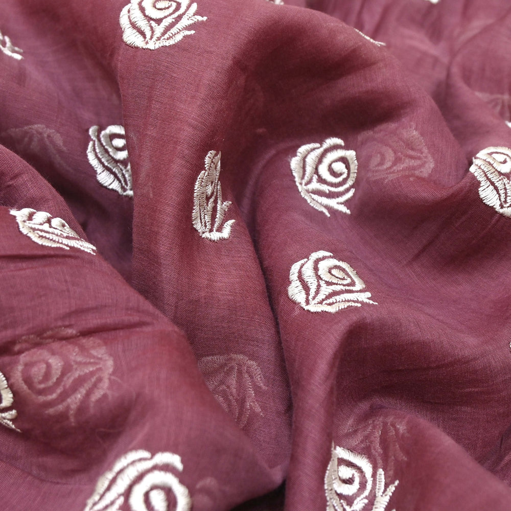 Wine Berry Color Mul Chanderi Thread Embroidery Fabric