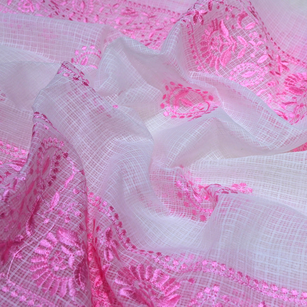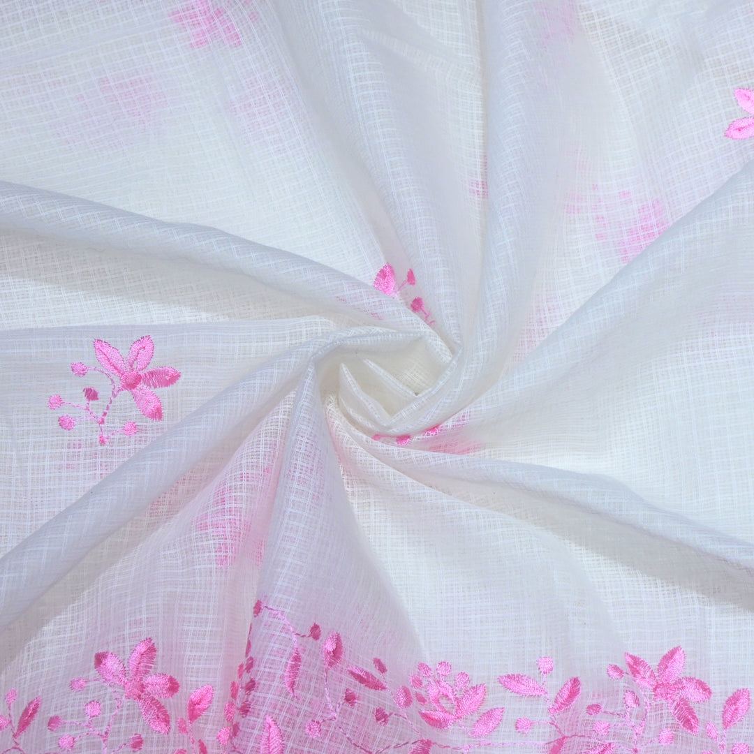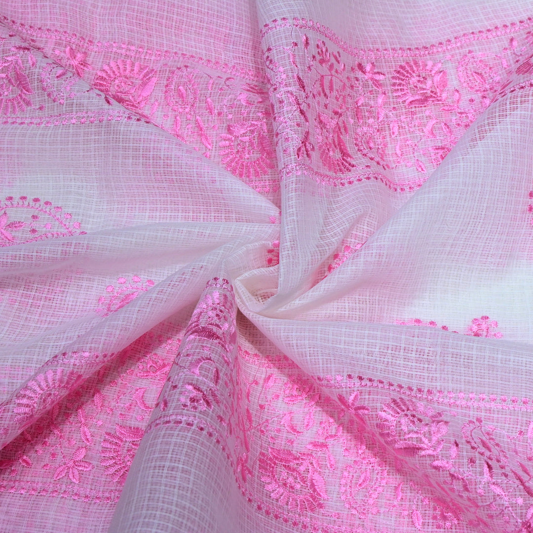 Off White with Pink Color Cotton Kota Thread Embroidery Fabric