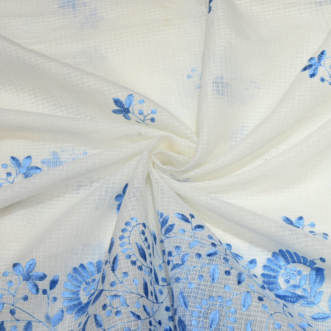Off White with Blue Color Cotton Kota Thread Embroidery Fabric