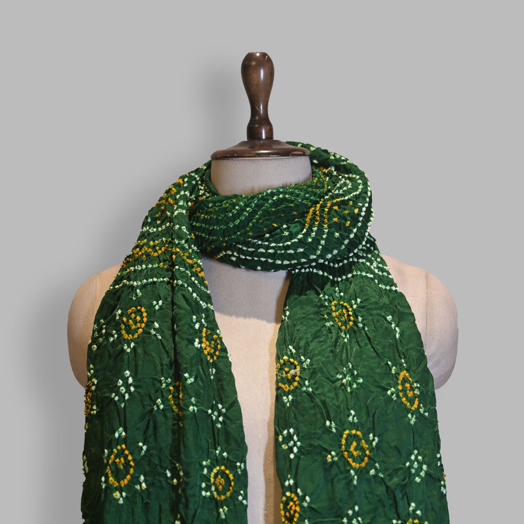 Embrace the Timeless Elegance of Tradition Add a vibrant splash of culture to your wardrobe with our exquisite Green Bandhani Dupatta. Handcrafted by skilled artisans using the ancient Bandhej (tie-dye) technique, this dupatta features intricate white and yellow dot patterns that create a mesmerizing visual rhythm.