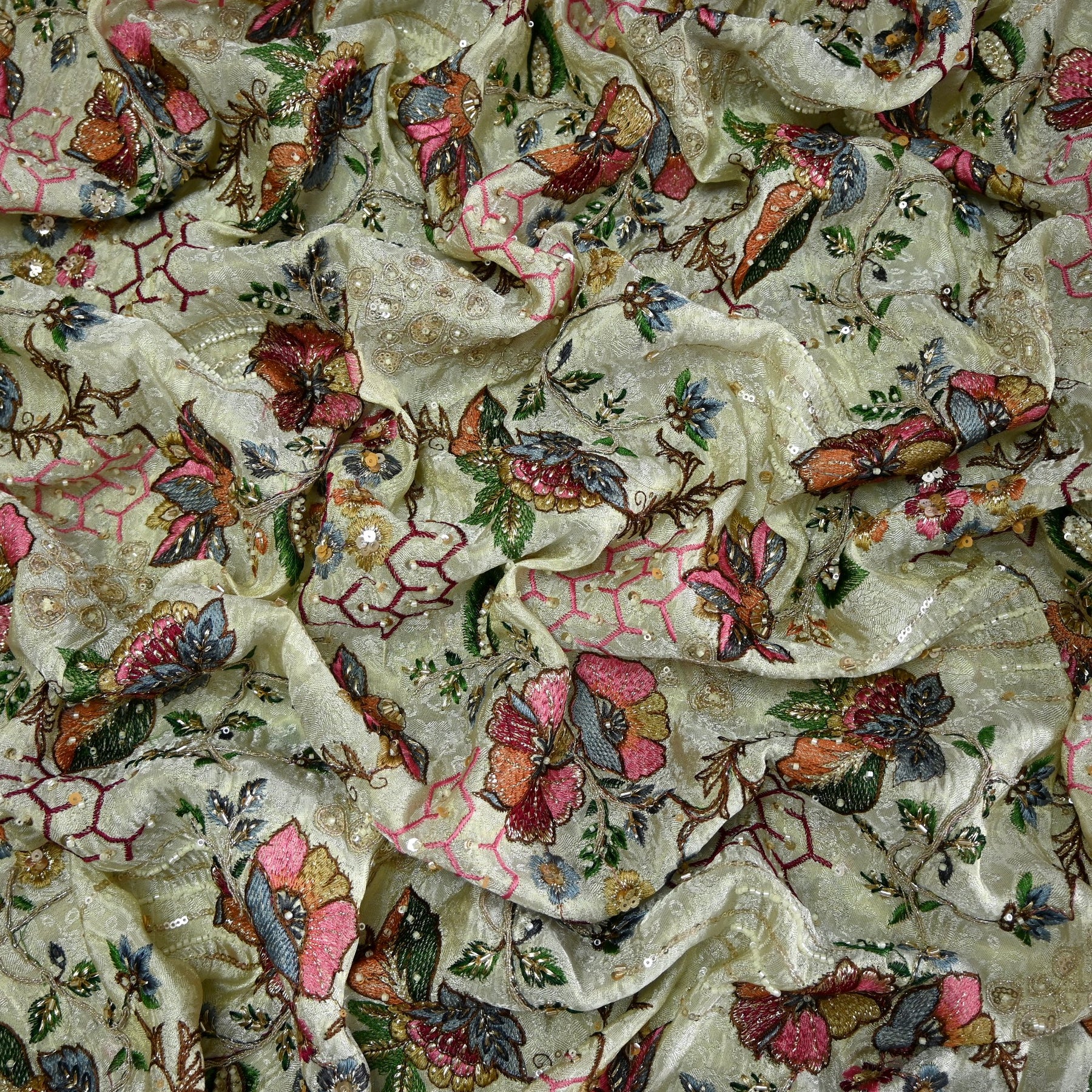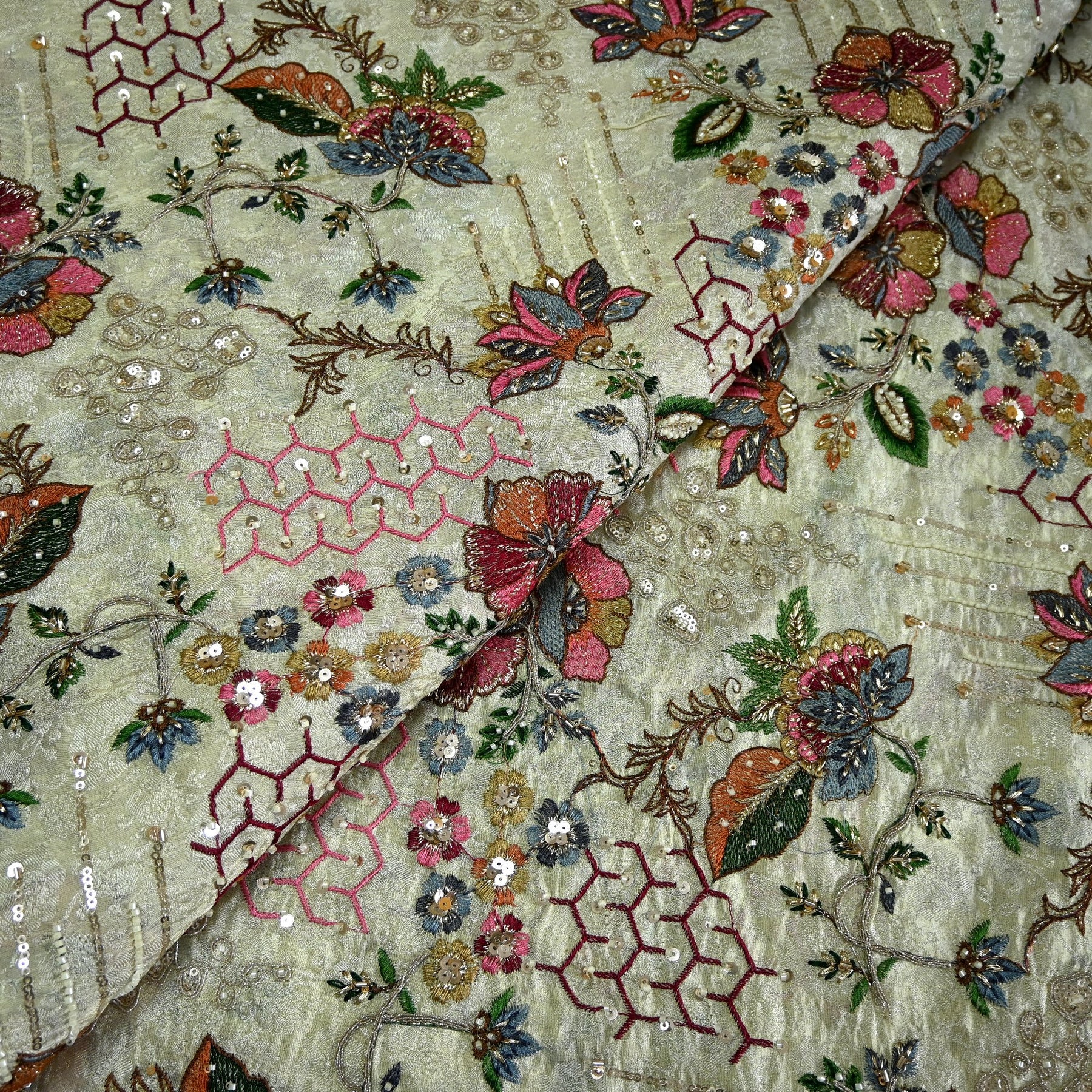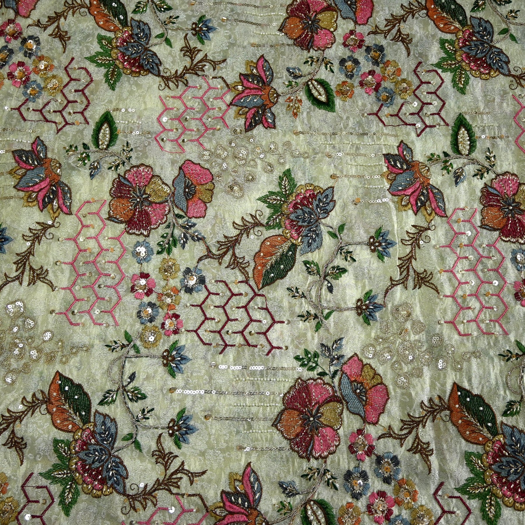 Experience pure elegance with this Dyeable Tissue Multi-Thread Embroidered Fabric, beautifully crafted with vibrant multi-colour thread work and artistically highlighted using Cut Dana and Sequins. The rich detailing creates a shimmering, eye-catching look that elevates any design with effortless grace.