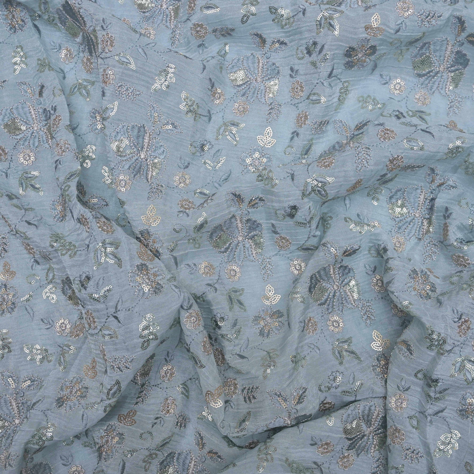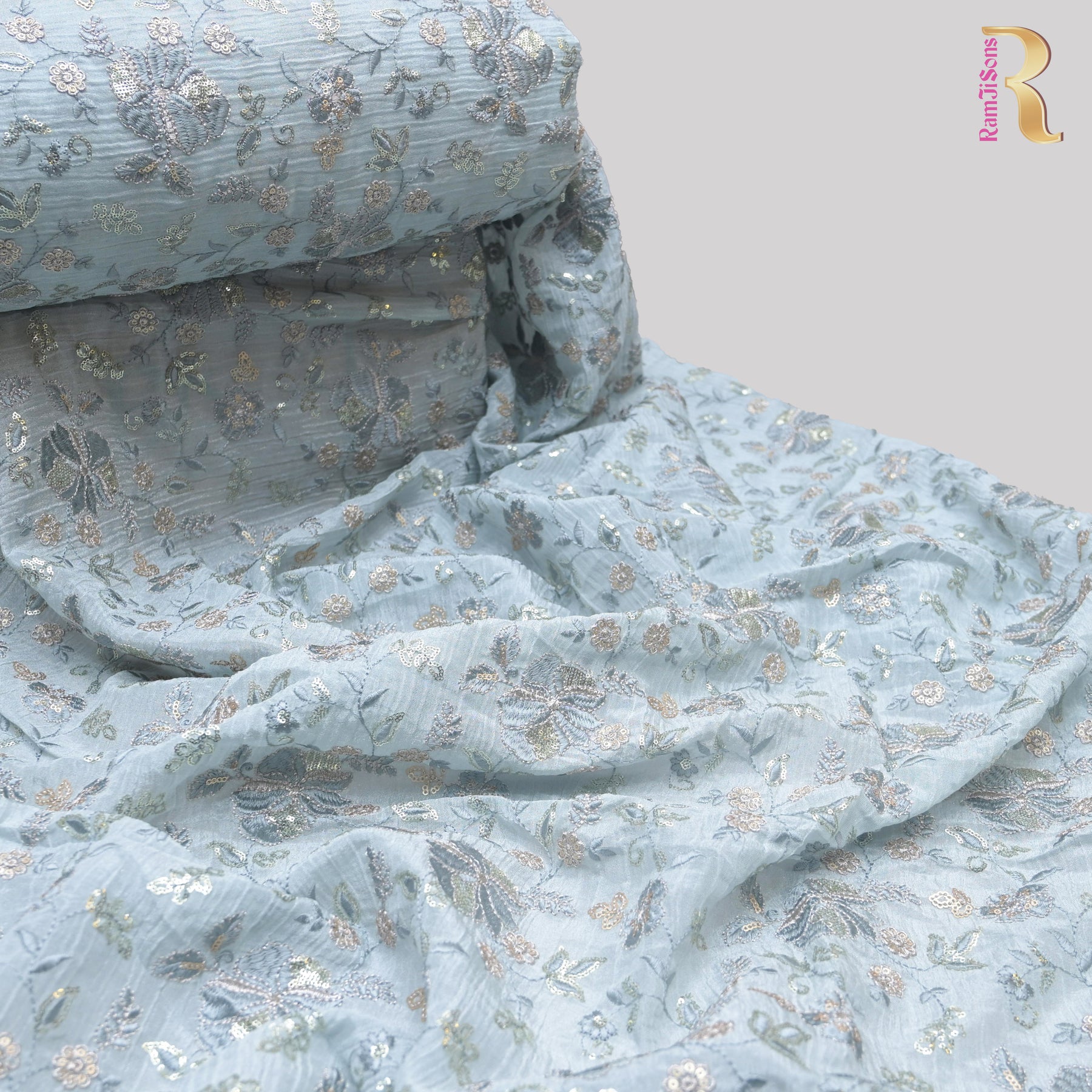 This elegant crush tissue embroidery fabric features a soft, luminous base with a graceful crushed texture that adds depth and movement to the surface. Delicately embroidered floral and leafy motifs are enhanced with fine threadwork and subtle sequin detailing, creating a refined shimmer without overpowering the fabricās natural sheen. The pastel tone lends a fresh, soothing appeal, making the embroidery appear light and airy.