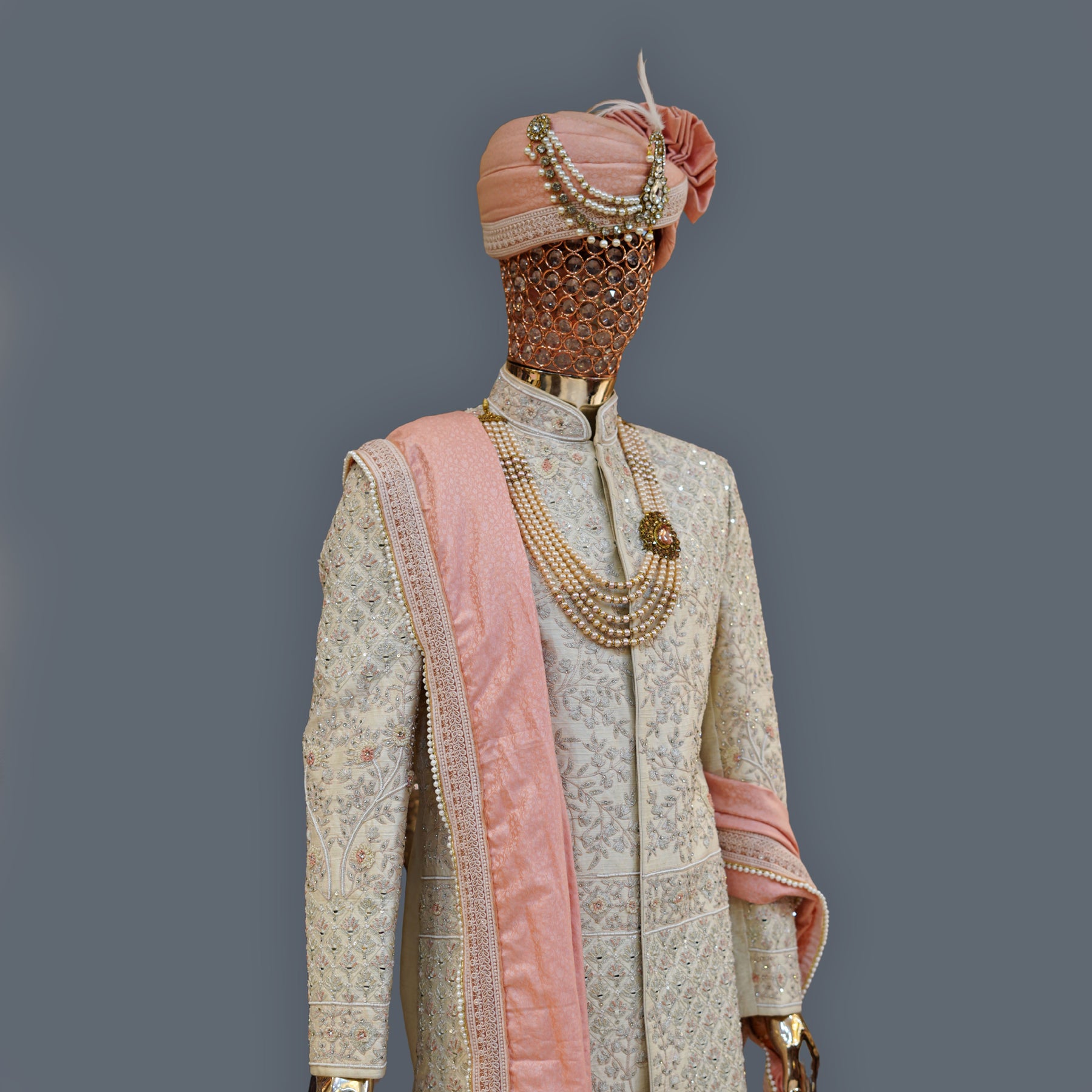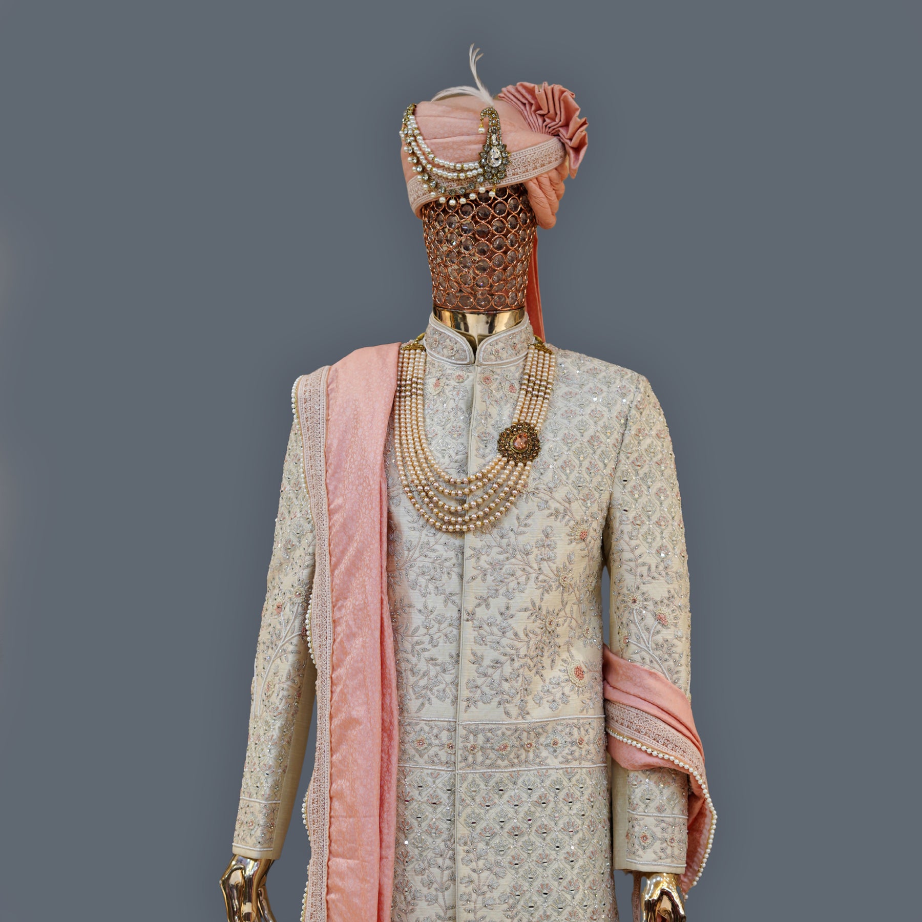 Exude a sense of timeless royalty on your big day with our Ivory Raw Silk Sherwani Set. This masterpiece sherwani features intricate, allover Cutdana embroidery, meticulously handcrafted to create a rich, textured finish that dances in the light. Designed specifically for the groom who appreciates the finer things in life.