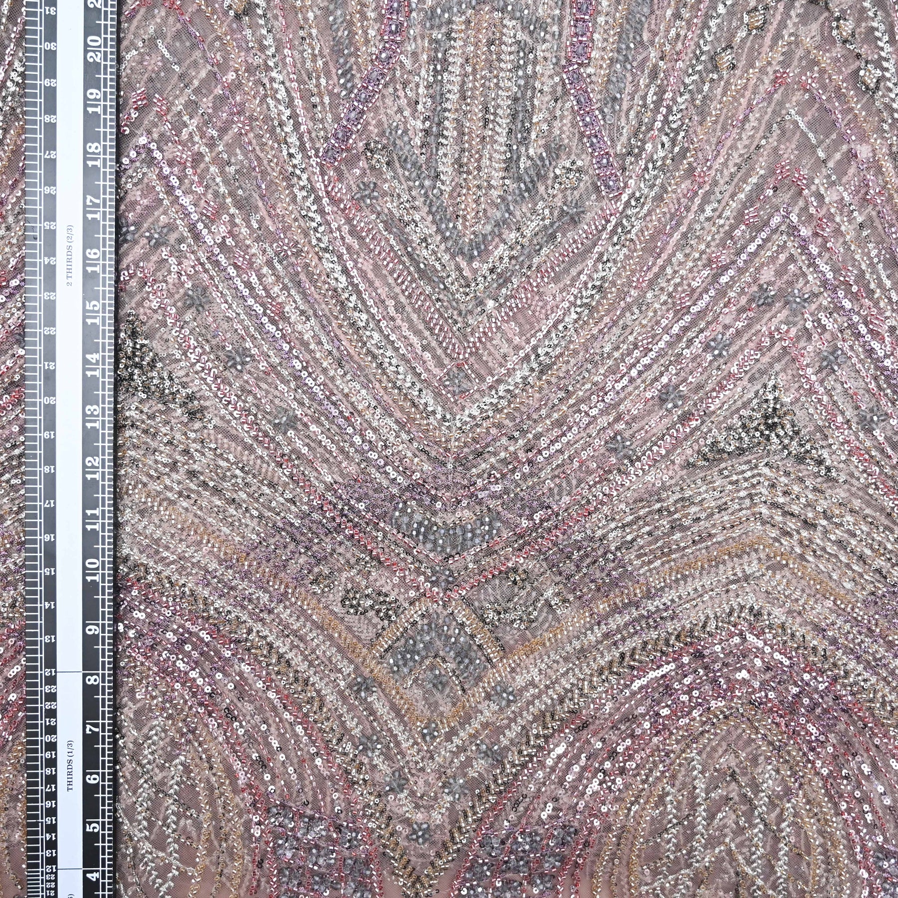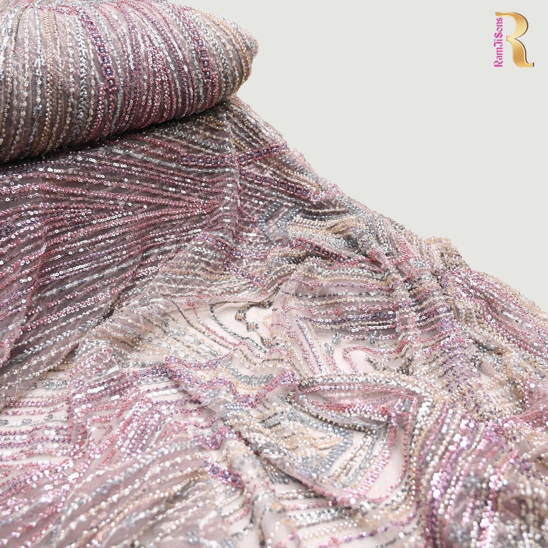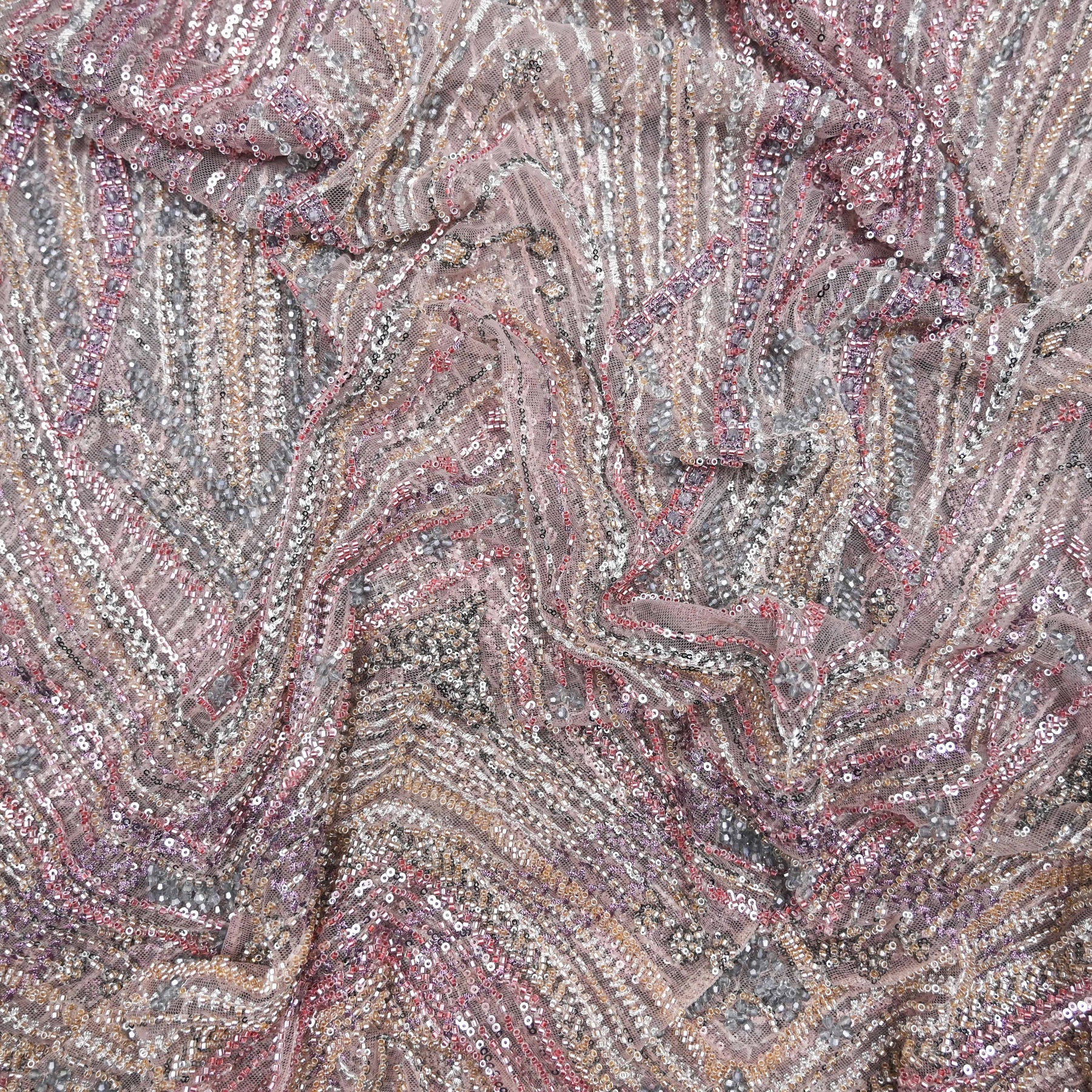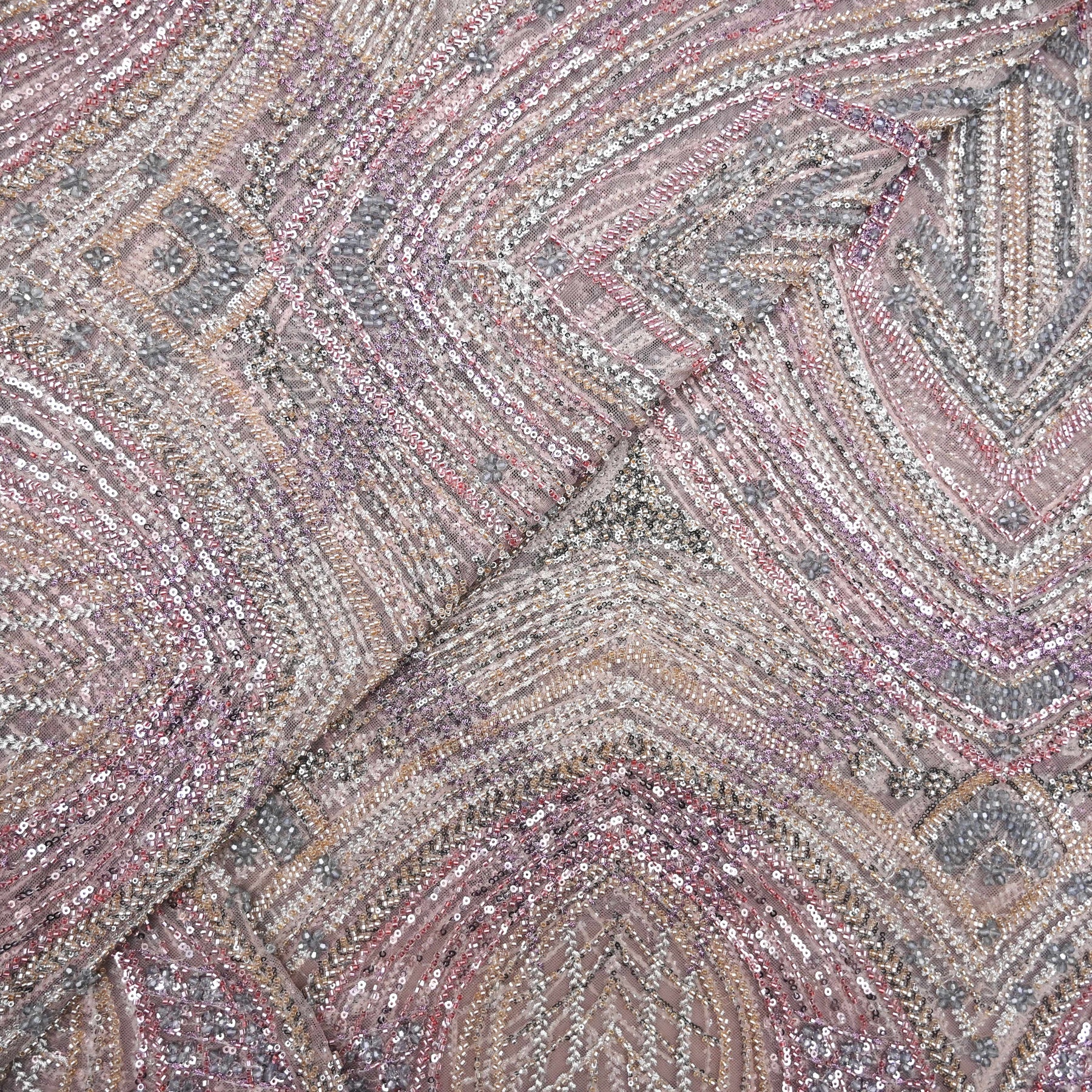 Elegant floral net embroidery fabric crafted on a soft sheer base, highlighted with intricate threadwork, tonal sequins, and delicate bead embellishments. The graceful Soft Mauve Pink tones and all-over embroidered motifs create a luxurious, lightweight drape. Ideal for designing bridal wear, evening gowns, lehengas, sarees, and couture blouses, this fabric adds a refined sparkle and timeless charm to any occasion-wear ensemble.