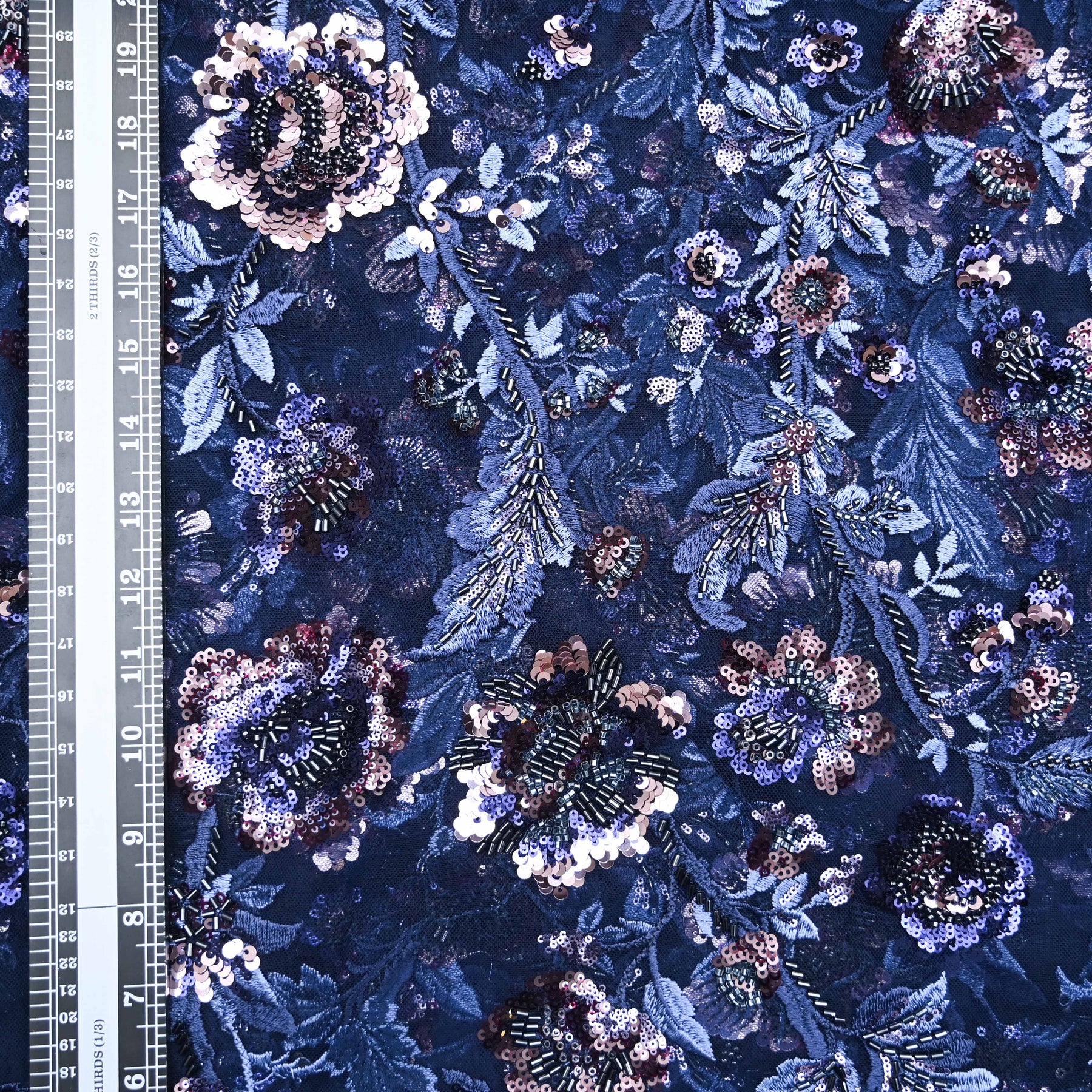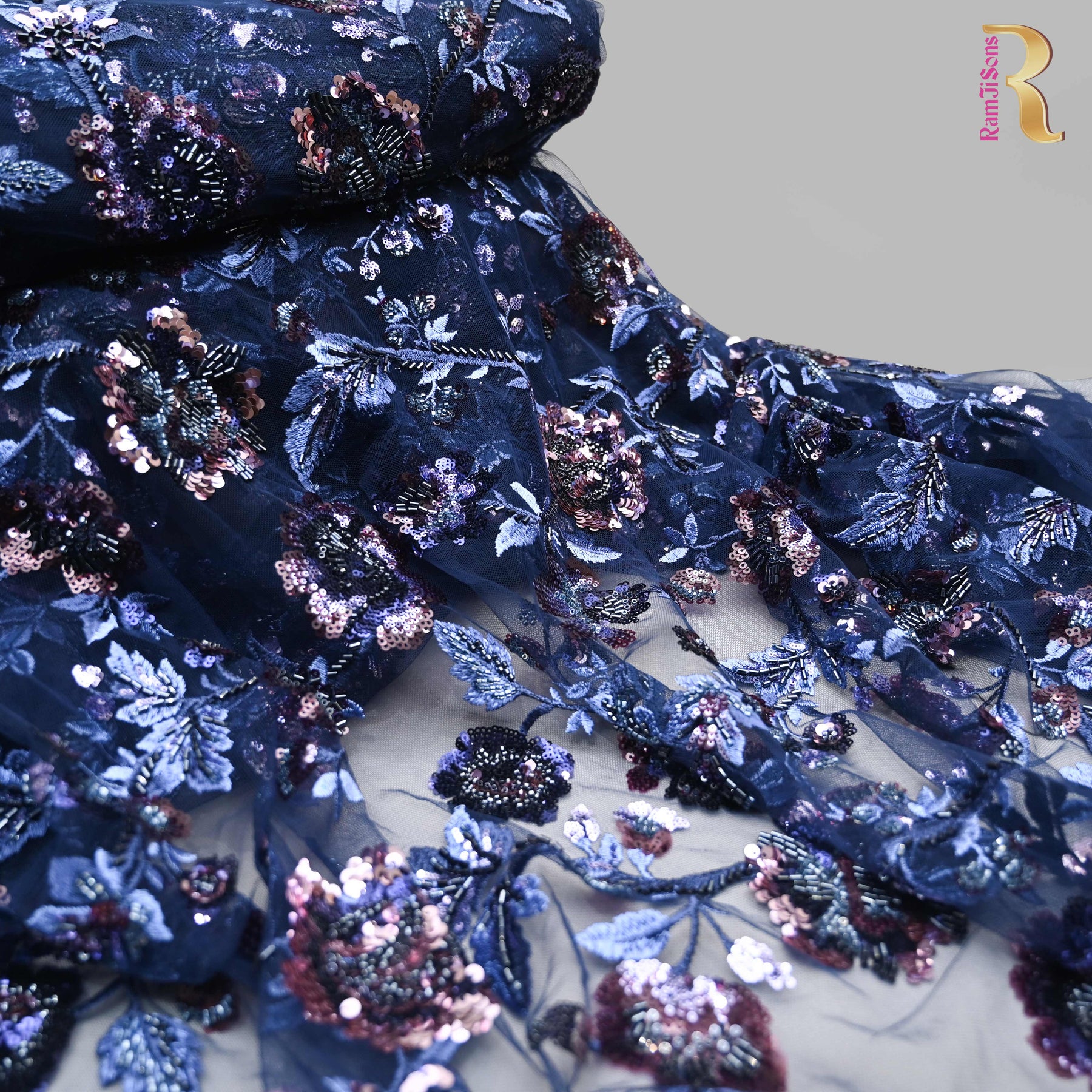 Elegant floral net embroidery fabric crafted on a soft sheer base, highlighted with intricate threadwork, tonal sequins, and delicate bead embellishments. The graceful navy blue net tones and all-over embroidered motifs create a luxurious, lightweight drape. Ideal for designing bridal wear, evening gowns, lehengas, sarees, and couture blouses, this fabric adds a refined sparkle and timeless charm to any occasion-wear ensemble.
