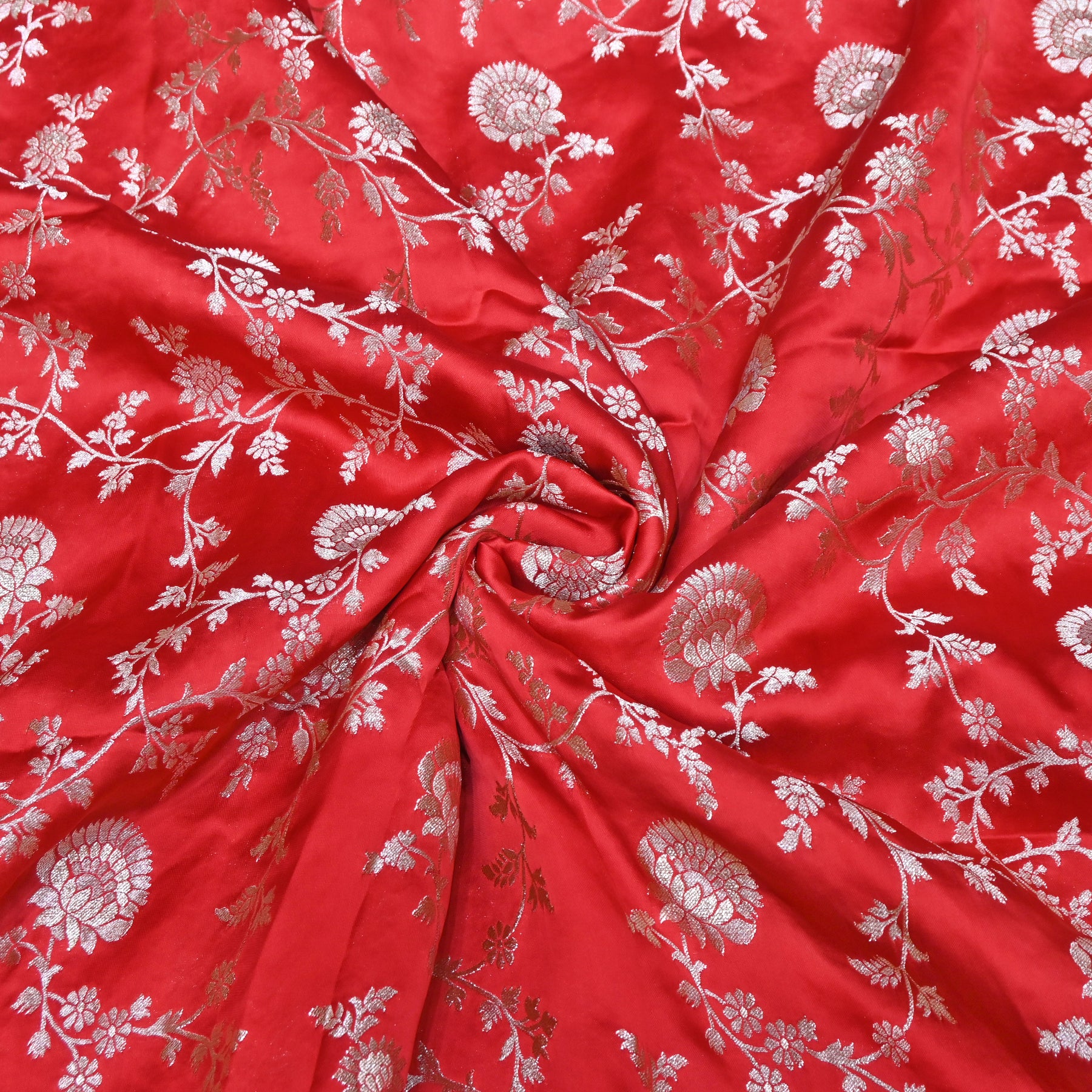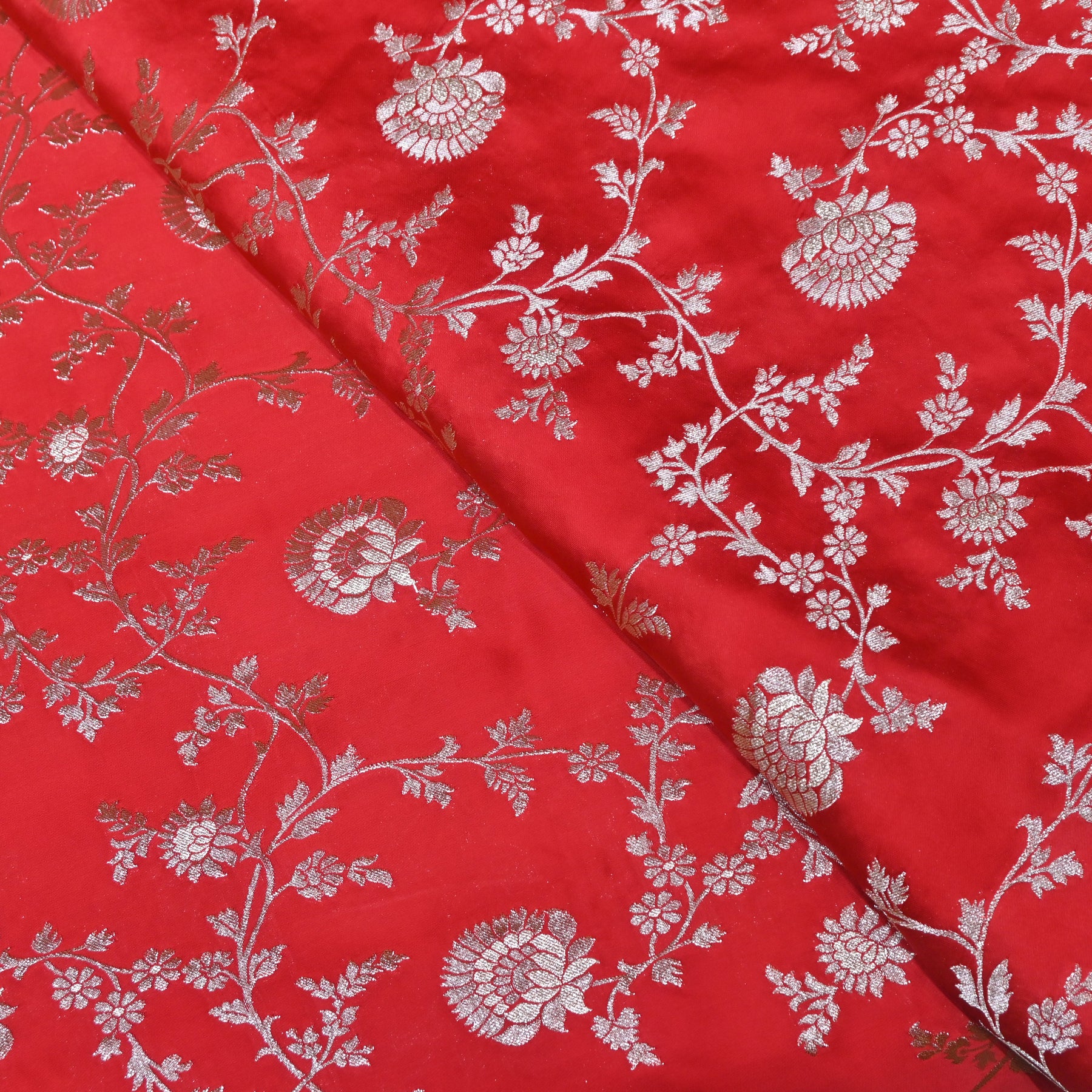 Elevate your ethnic collection with our Scarlet Red Satin Georgette Brocade with Zari Jacquard Jaal Fabric. Designed with intricate zari jacquard jaal weaving, this luxurious fabric showcases a beautifully detailed brocade pattern that adds richness and elegance to every outfit. The vibrant scarlet red tone paired with delicate zari work creates a regal shine, making it perfect for festive and designer wear.