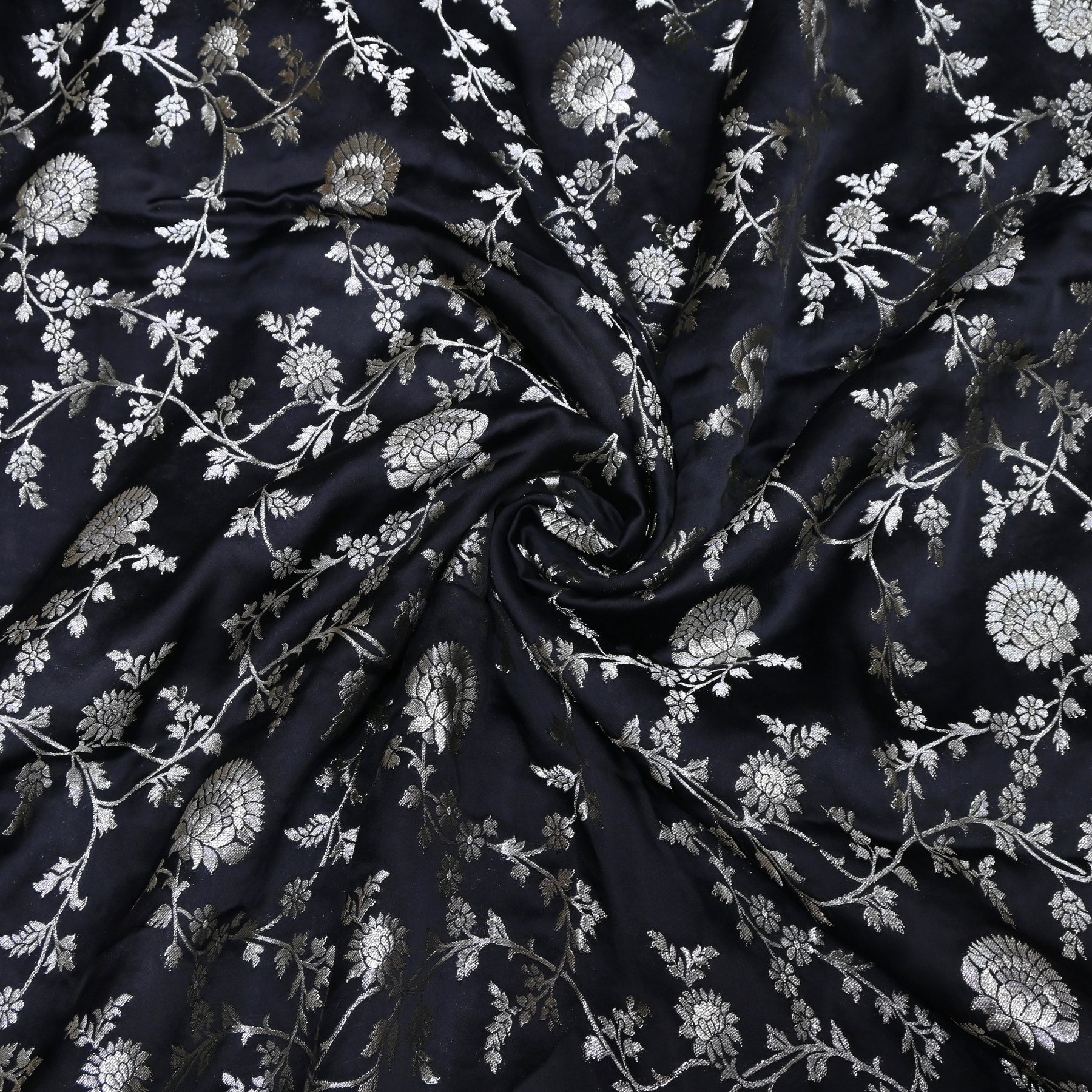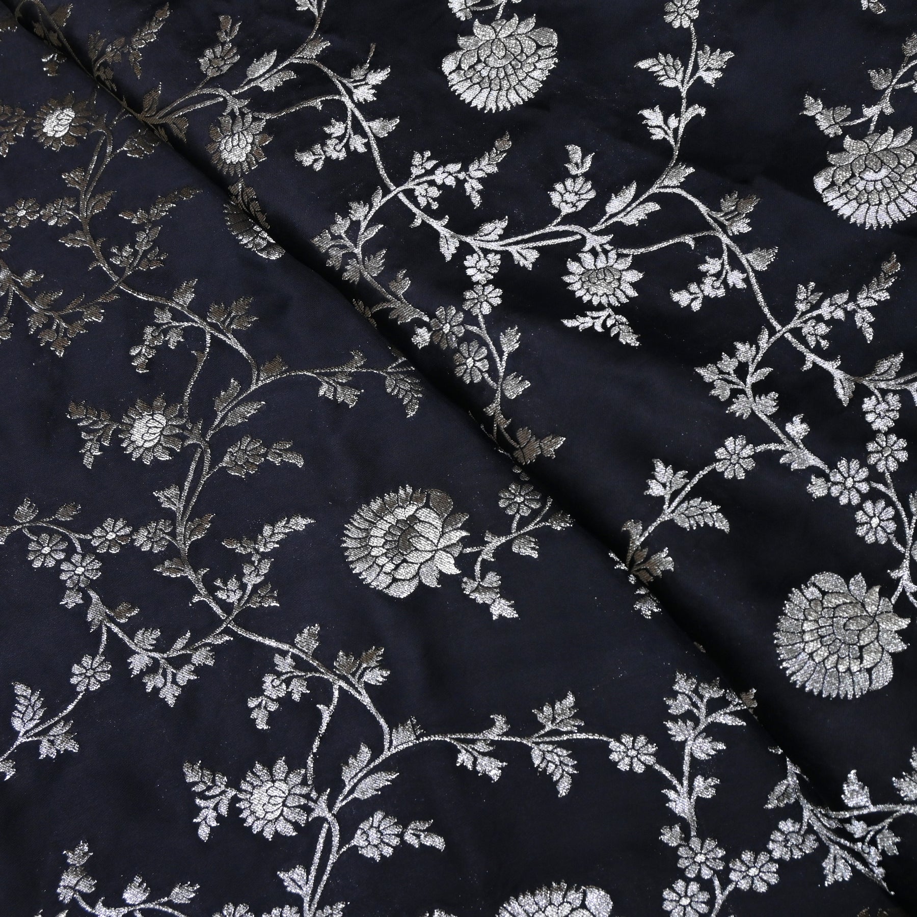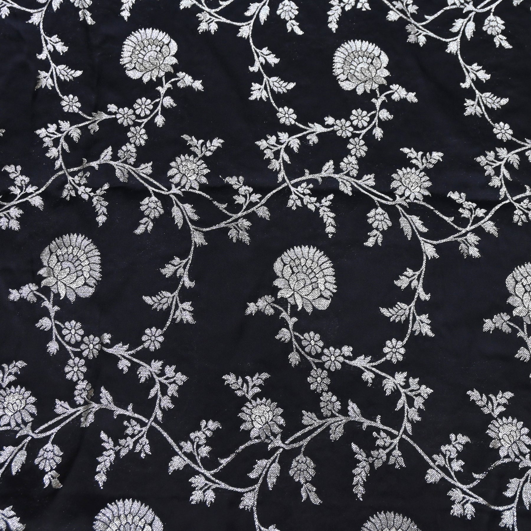 Product Name: Black Satin Georgette Brocade with Zari Jacquard Jaal Fabric