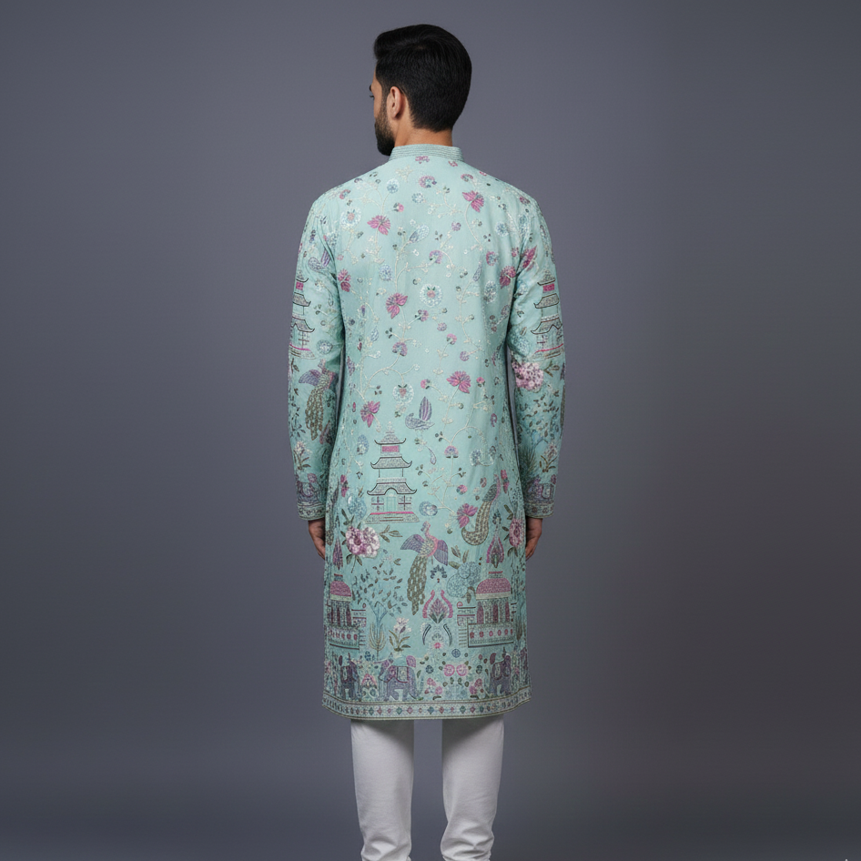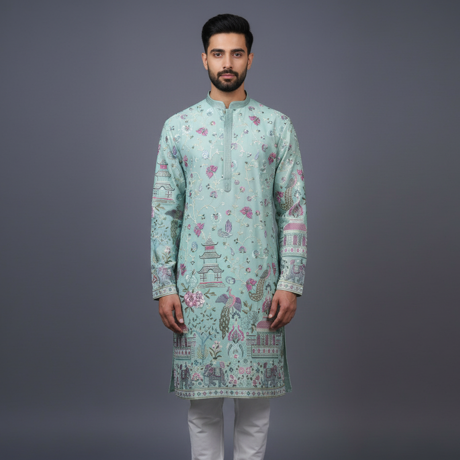 Bright, festive, and effortlessly elegant, the Light Blue allover Resham Dhaga Georgette Kurta Set is designed to make a graceful style statement. Crafted to blend refined craftsmanship with graceful comfort. Made from premium Crepe georgette, the kurta features allover intricate embroidery that adds rich texture and artisanal charm while maintaining a light, flowy silhouette.