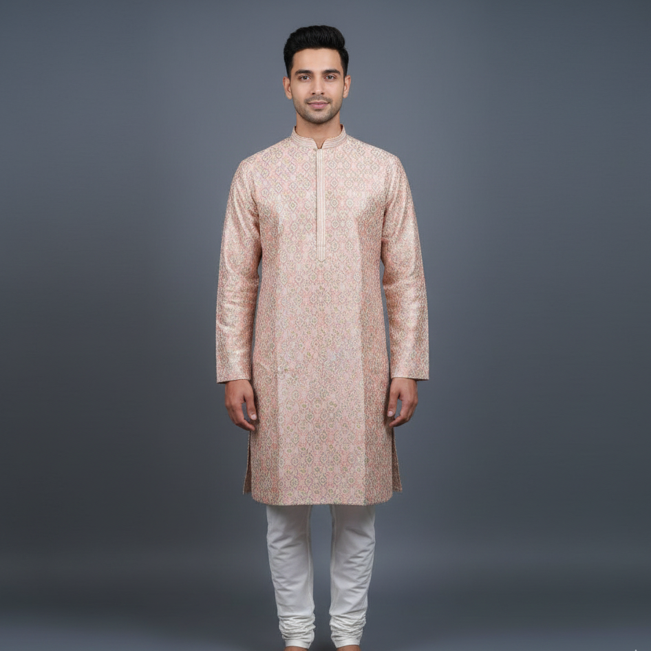 Soft, graceful, and effortlessly elegant, the Peach Satin Silk Kurta Set is designed for refined festive and occasion wear. Crafted from premium satin silk, this kurta set features a smooth, lustrous finish that drapes beautifully, giving a rich and polished look.
