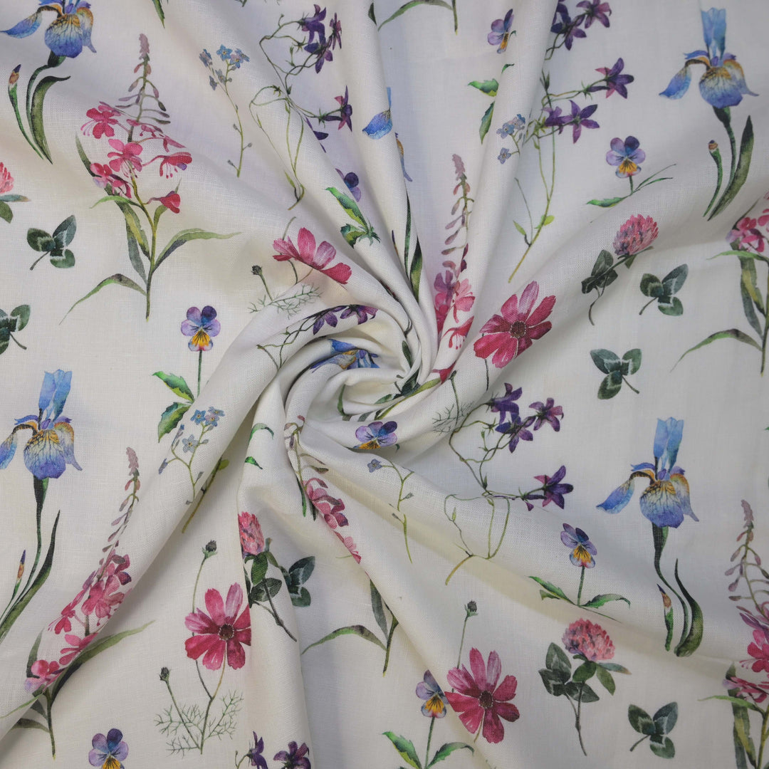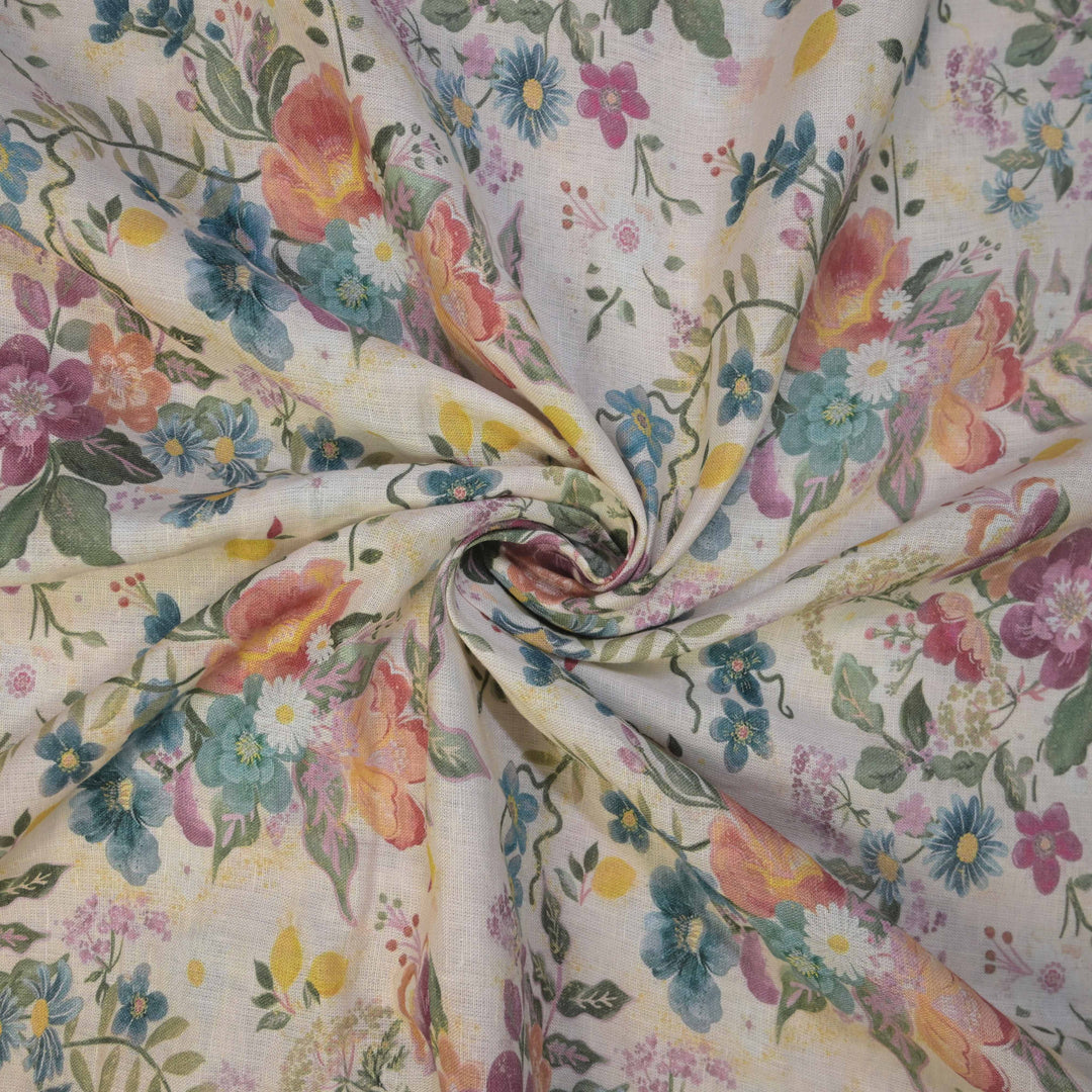 Off-White Traditional Floral Printed Pure Linen Fabric