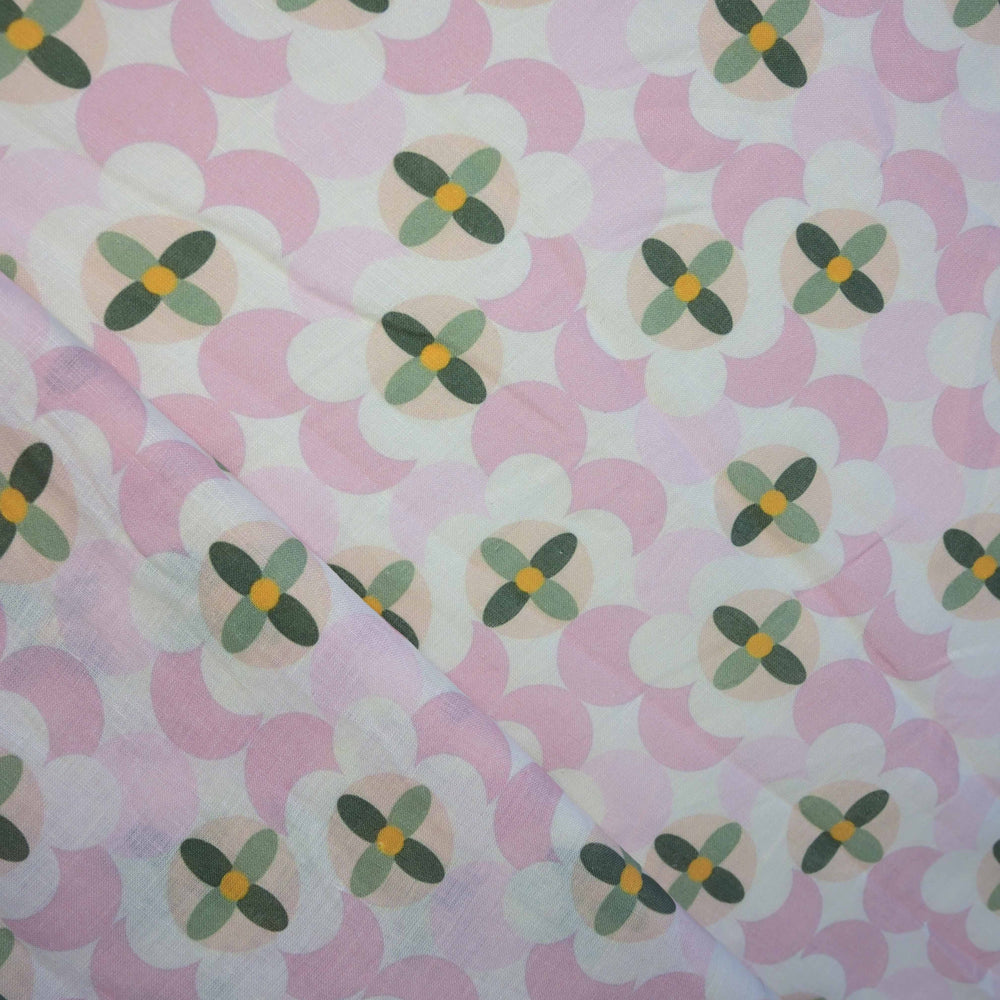 Baby Pink Floral Leafy Printed Pure Linen Fabric