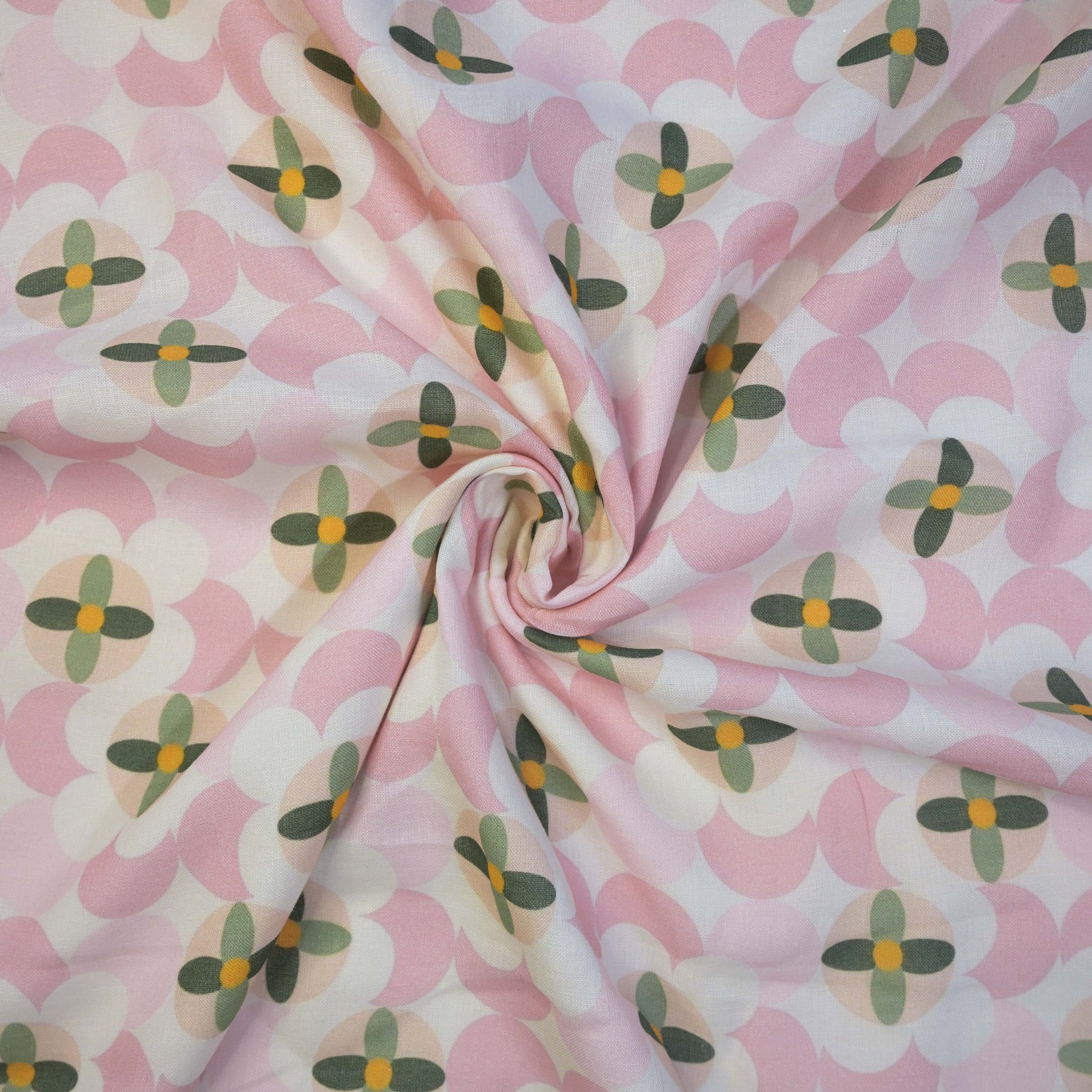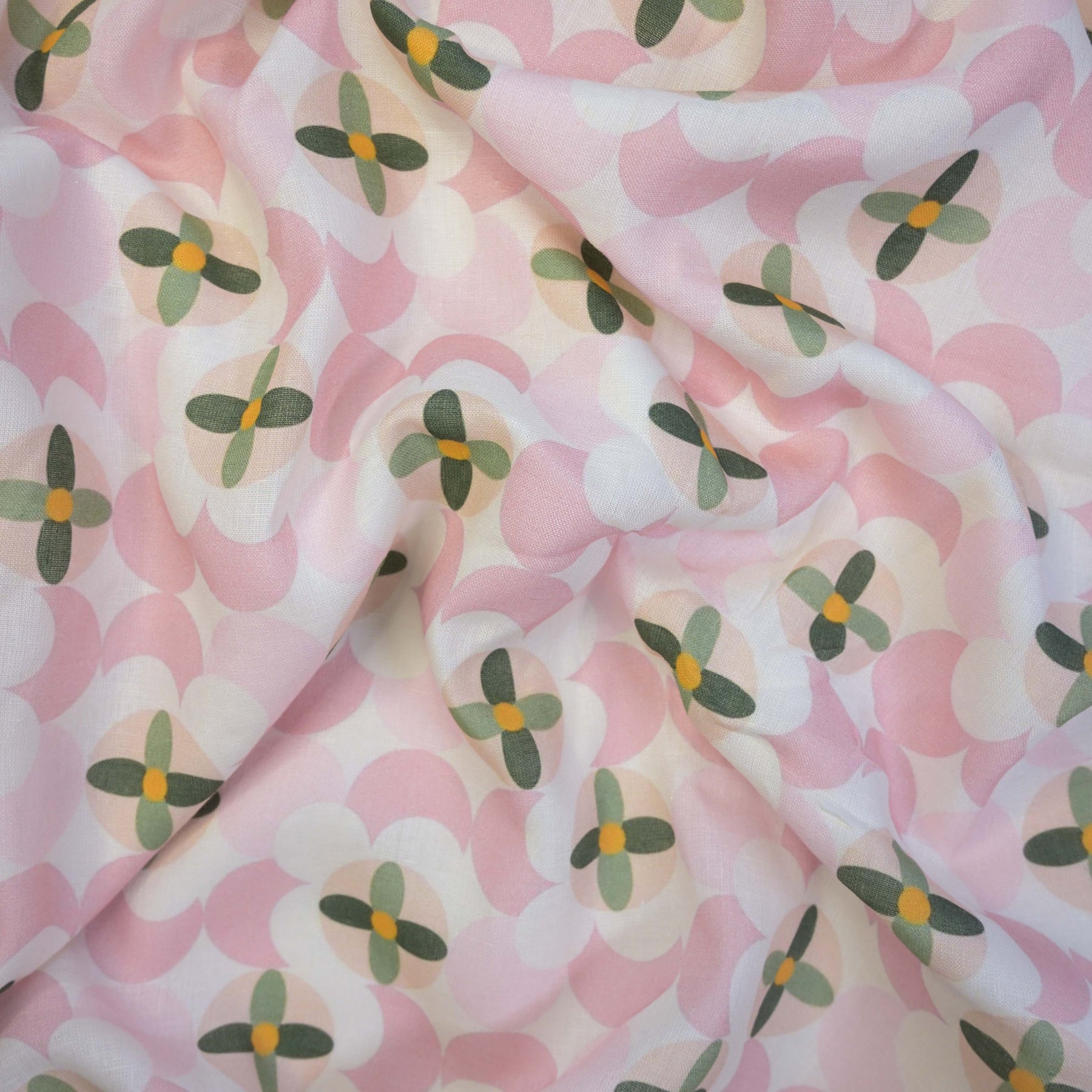 Elevate your ethnic and fusion creations with this exquisite Baby Pink Floral Leafy Printed Pure Linen Fabric, featuring floral & leafy framework. Rendered in serene shades of pastel pink and green over an white base, the design reflects a refined contemporary appeal.