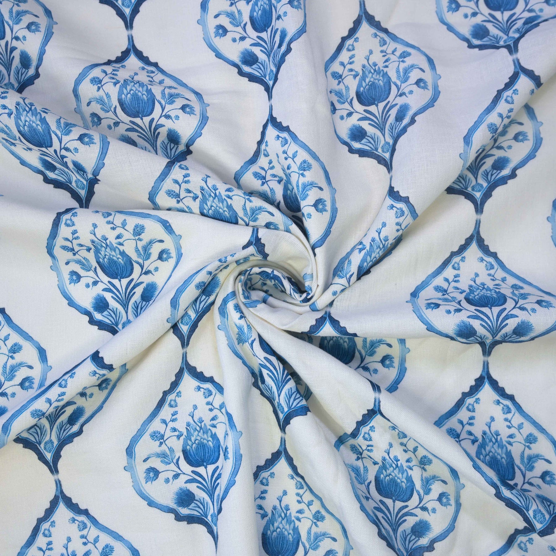 Elevate your ethnic and fusion creations with this exquisite Indigo Blue Floral Buta Printed Pure Linen Fabric, featuring intricate Mughal-style floral buta motifs enclosed within a traditional jaal framework. Rendered in serene shades of royal blue and indigo over an ivory base, the design reflects timeless Rajasthani artistry with a refined contemporary appeal.