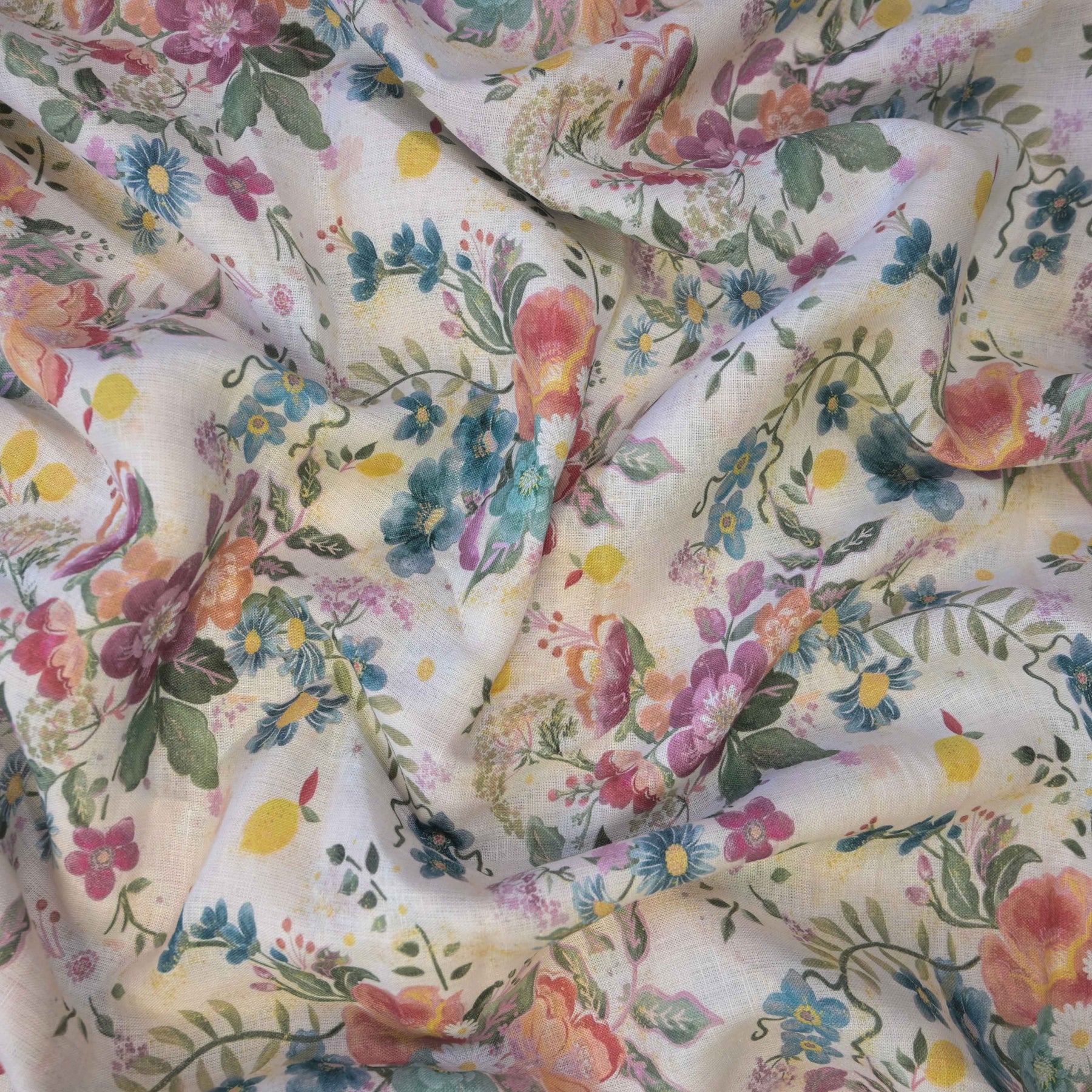 A beautifully balanced Spring Floral Printed Pure Linen Fabric featuring botanical floral pattern in soft green, red and pink tone over an ivory base. The traditional floral design creates a modern yet traditional aesthetic, making it a versatile choice for everyday ethnic and fusion wear.