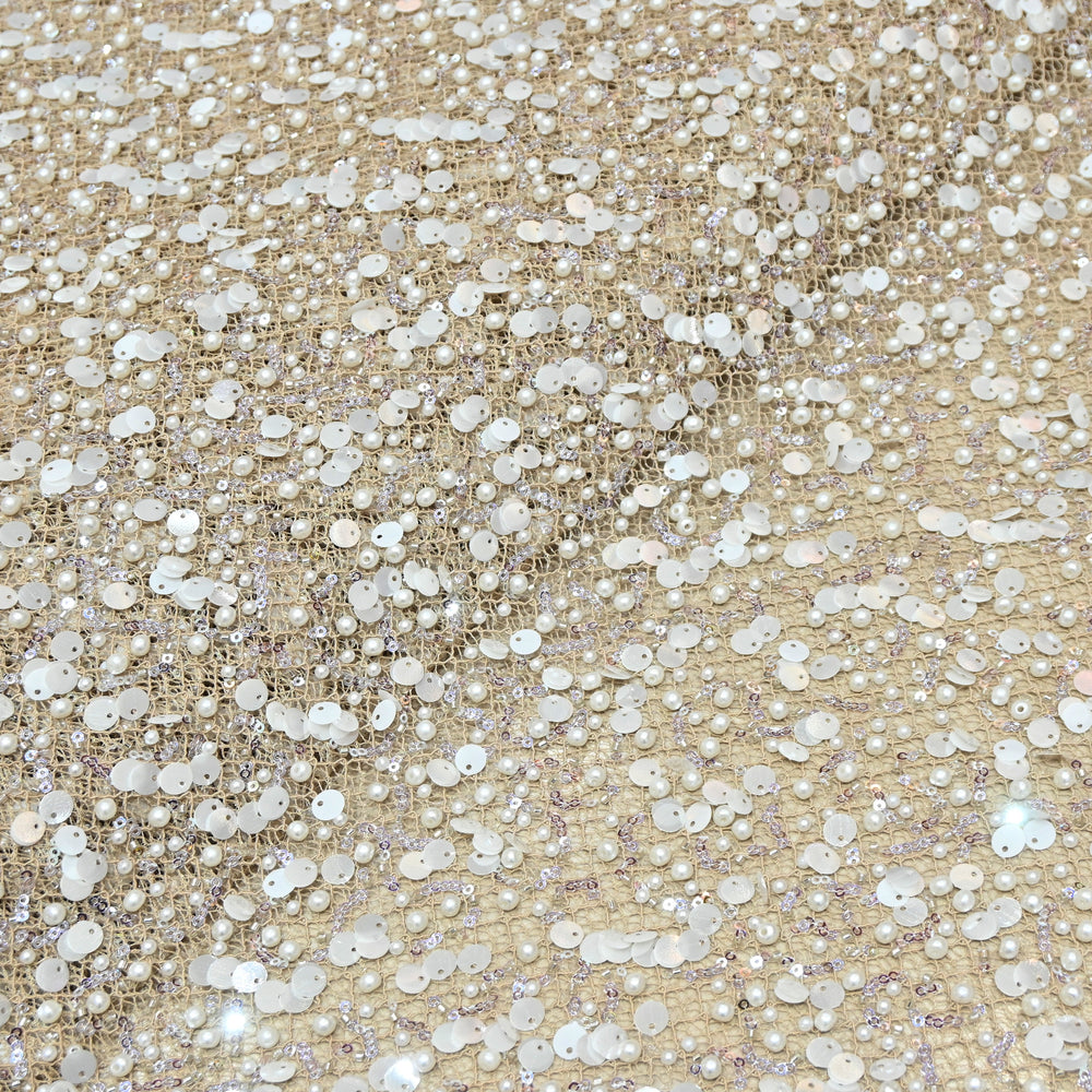 Beige Color Luxury Imported Heavy Pearl & Sequins Embroidered Net Designer Fabric ED1596-1