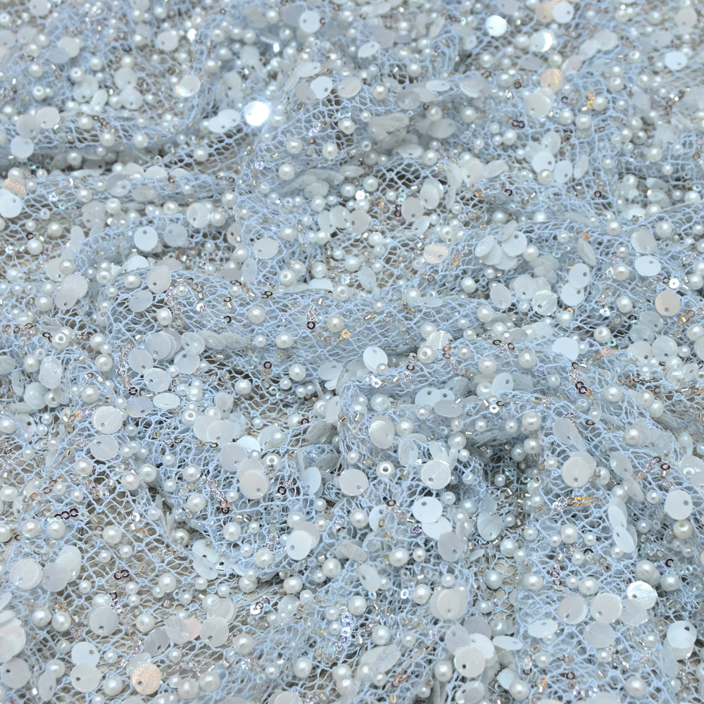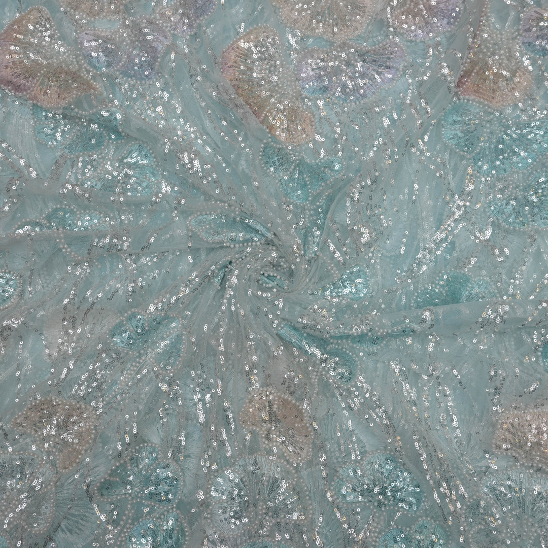 Designer powder blue Net Embroidery Fabric with water Sequins Embroidery.