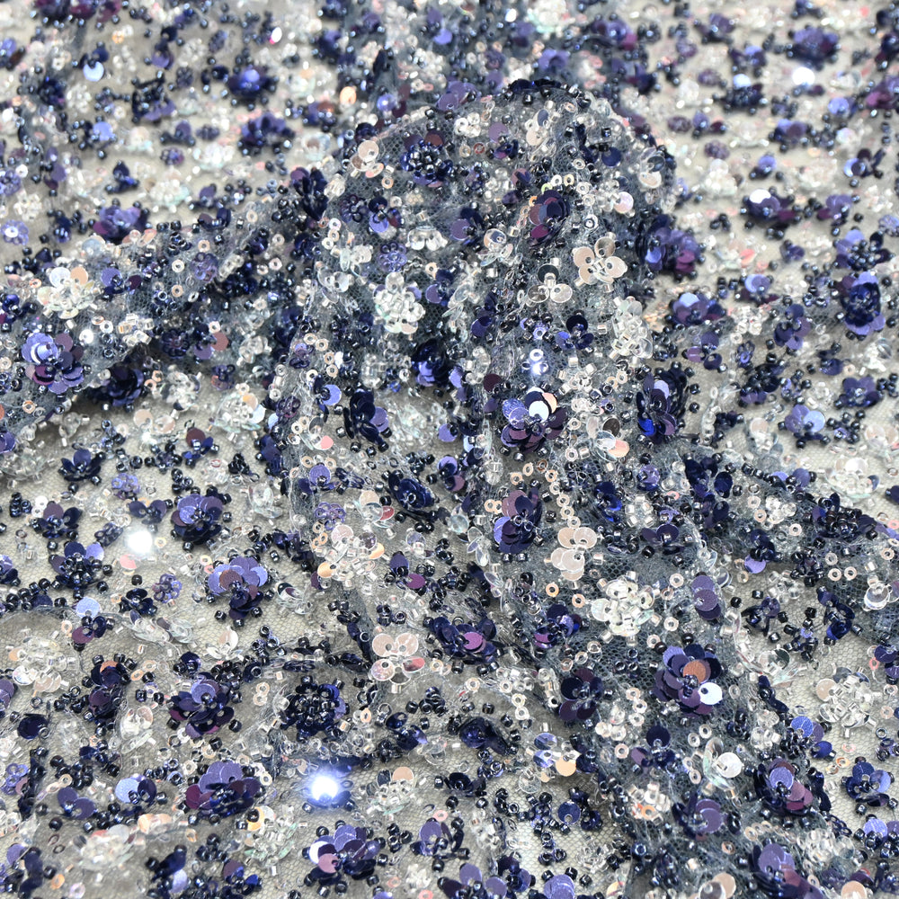 Royal Purple Net Embroidery Fabric with Cutdana, Sequins & Threadwork Embroidery.