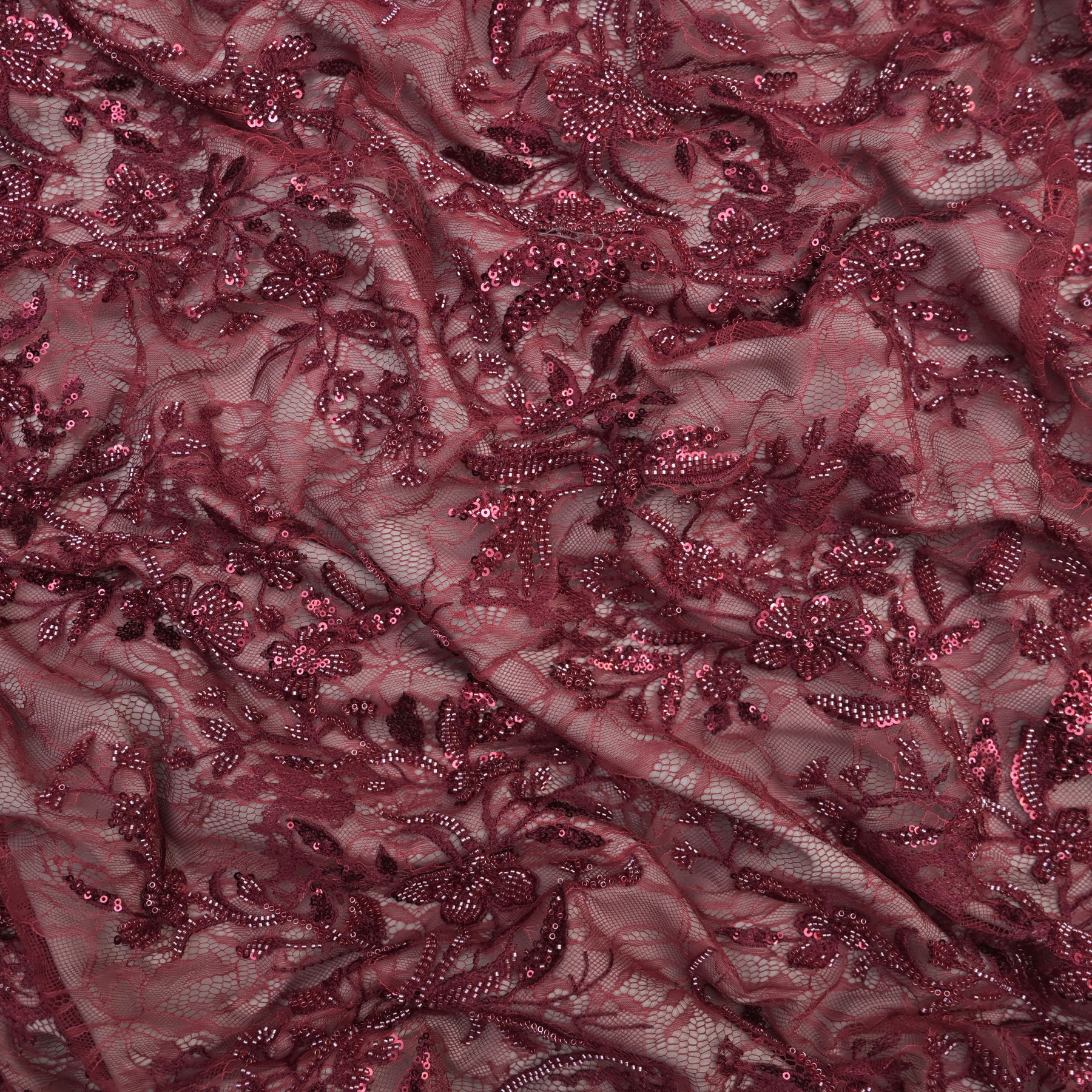 Dark Red Floral Sequin Net Embroidered Lace Fabric