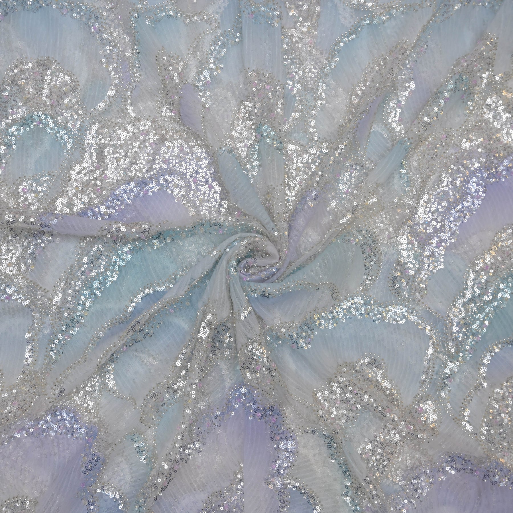 Crafted on a delicate sheer net base, the fabric is beautifully adorned with intricate sequin embroidery and textured abstract motifs that add depth, shimmer, and movement.