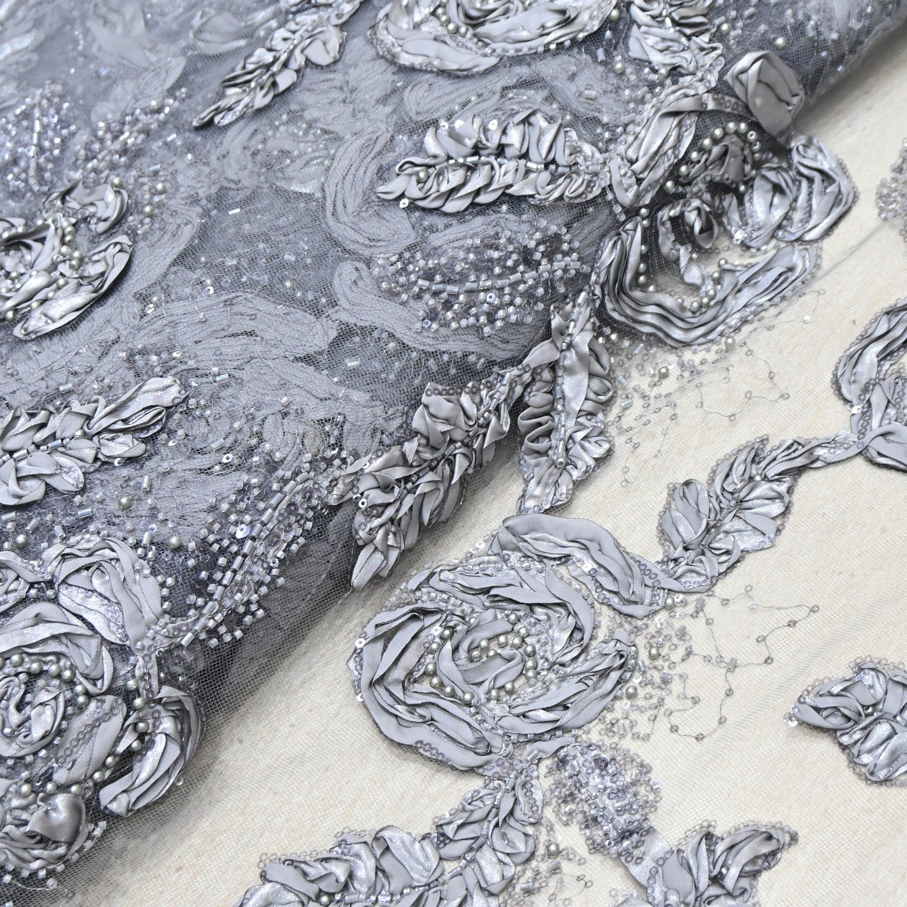 The highlight of this fabric is its beautiful 3D floral design, created using layered fabric petals and enhanced with intricate cut dana and sequins work, adding shine and depth to the overall look. The imported quality ensures fine finishing, superior detailing, and a high-end designer appeal.