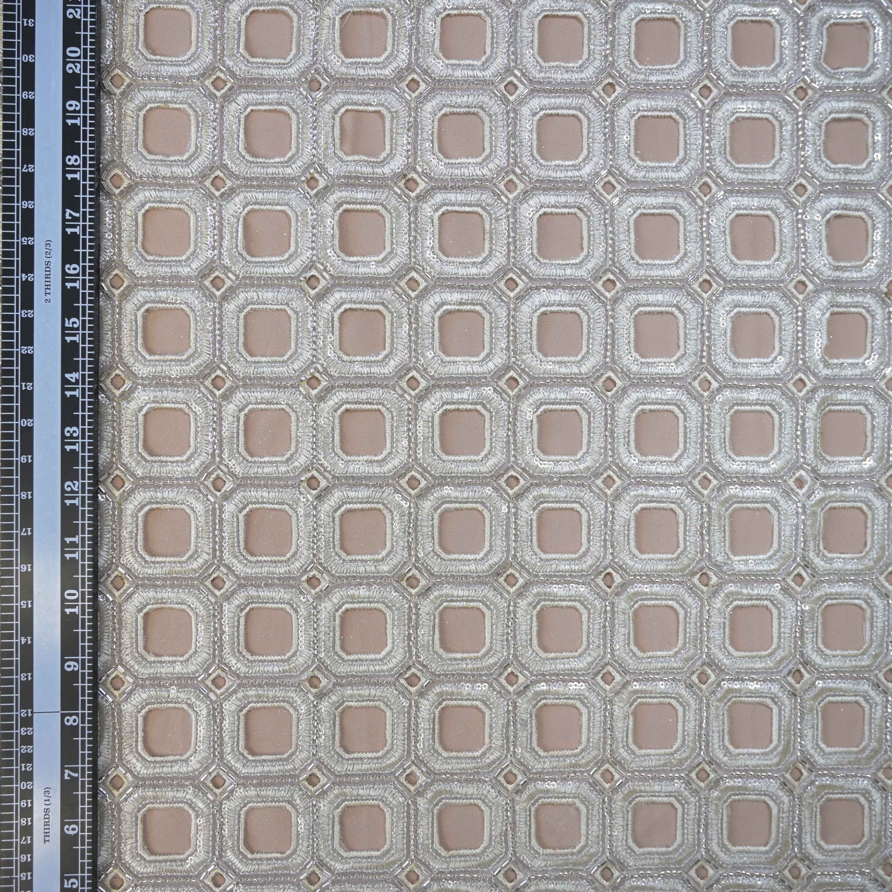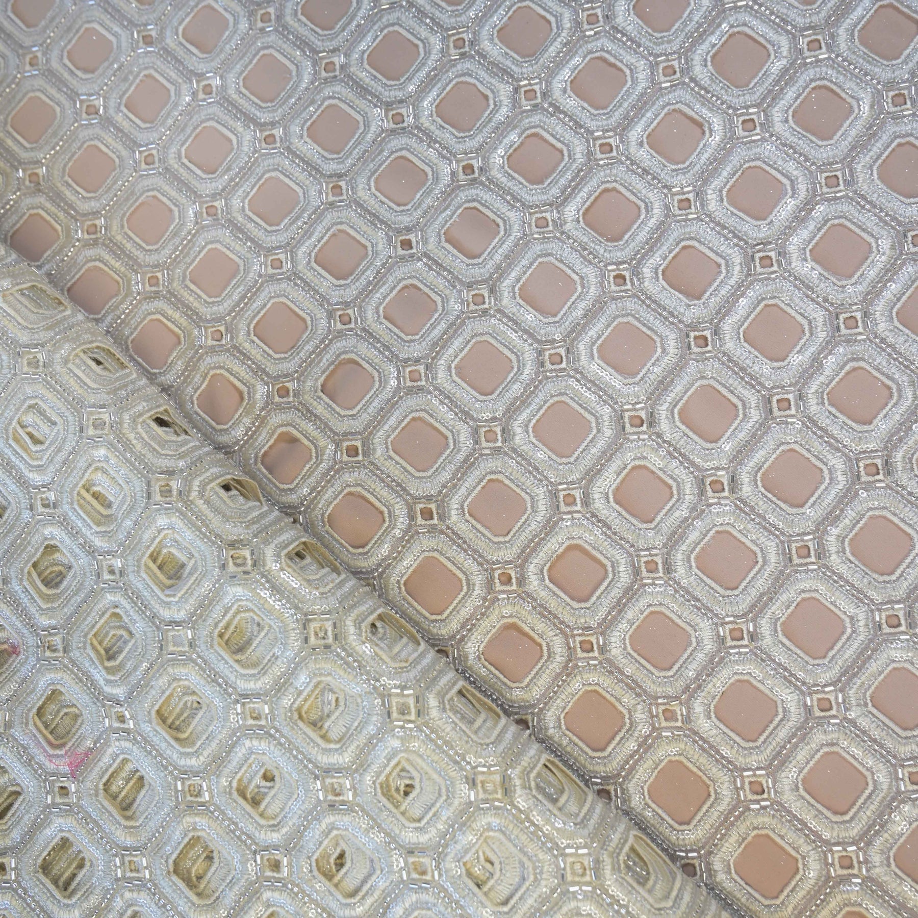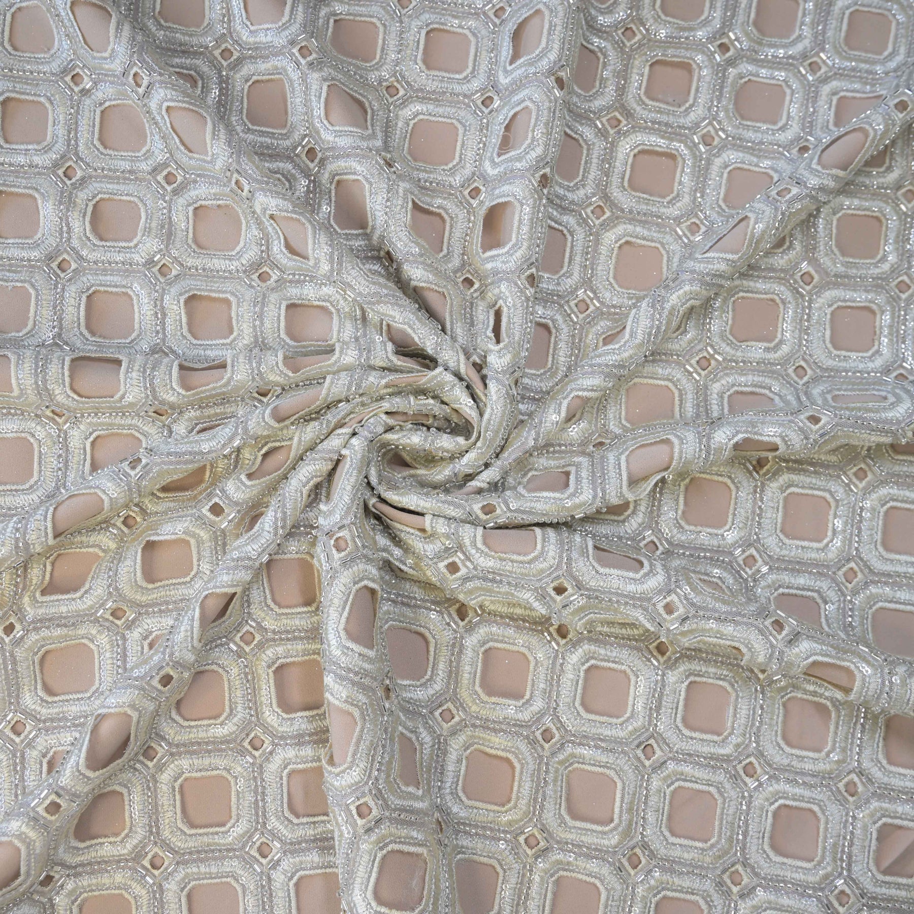 This striking Ivory Geometric Net Cutwork adorned with intricate geometric cutwork embroidery, highlighted by tonal sequins and delicate bead detailing.