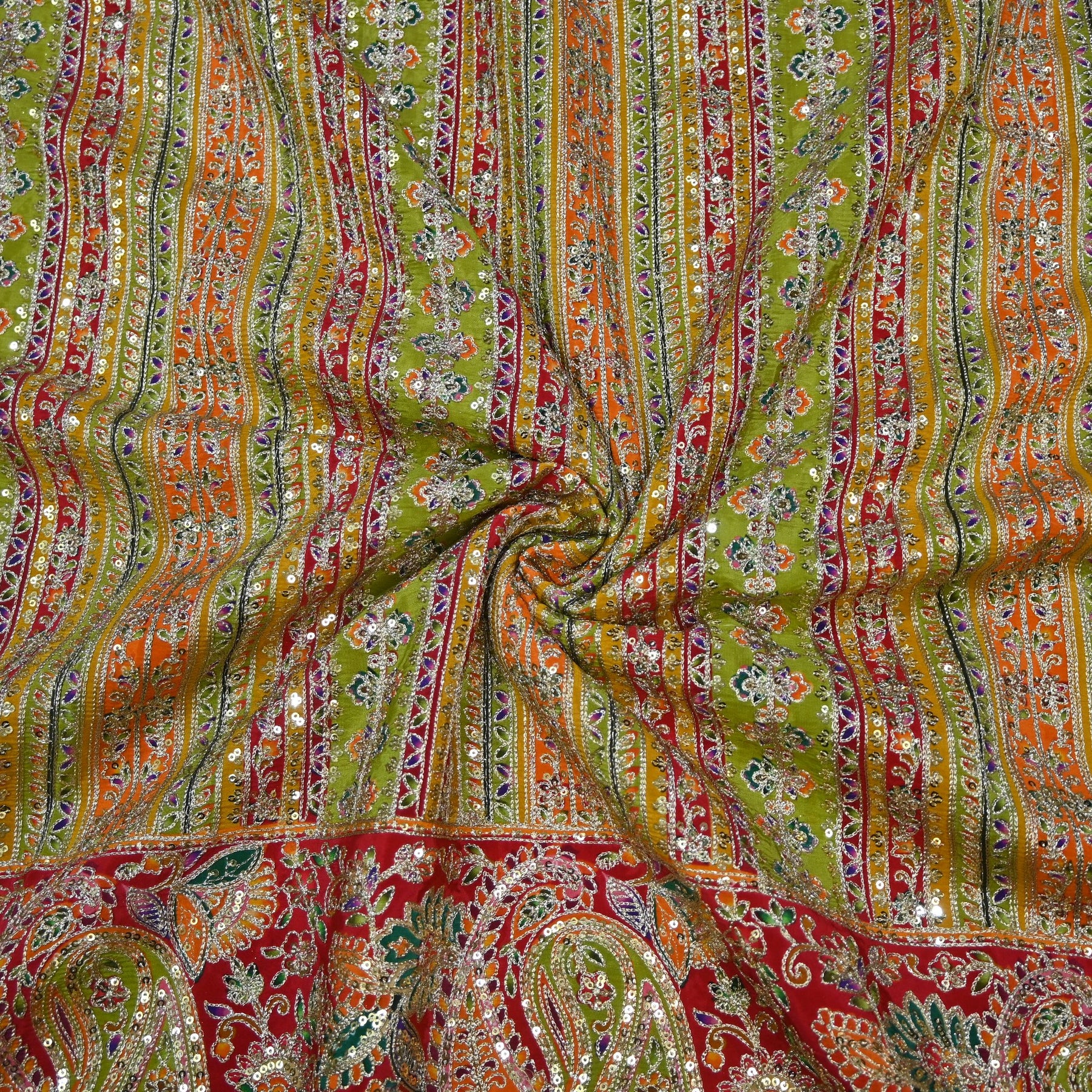 The highlight of this fabric is its elegant one-side embroidered border, which enhances the beauty of hemlines, dupattas, gowns, and ethnic silhouettes, giving every outfit a royal appeal. Ideal for high-end festive, party, and wedding wear creations.