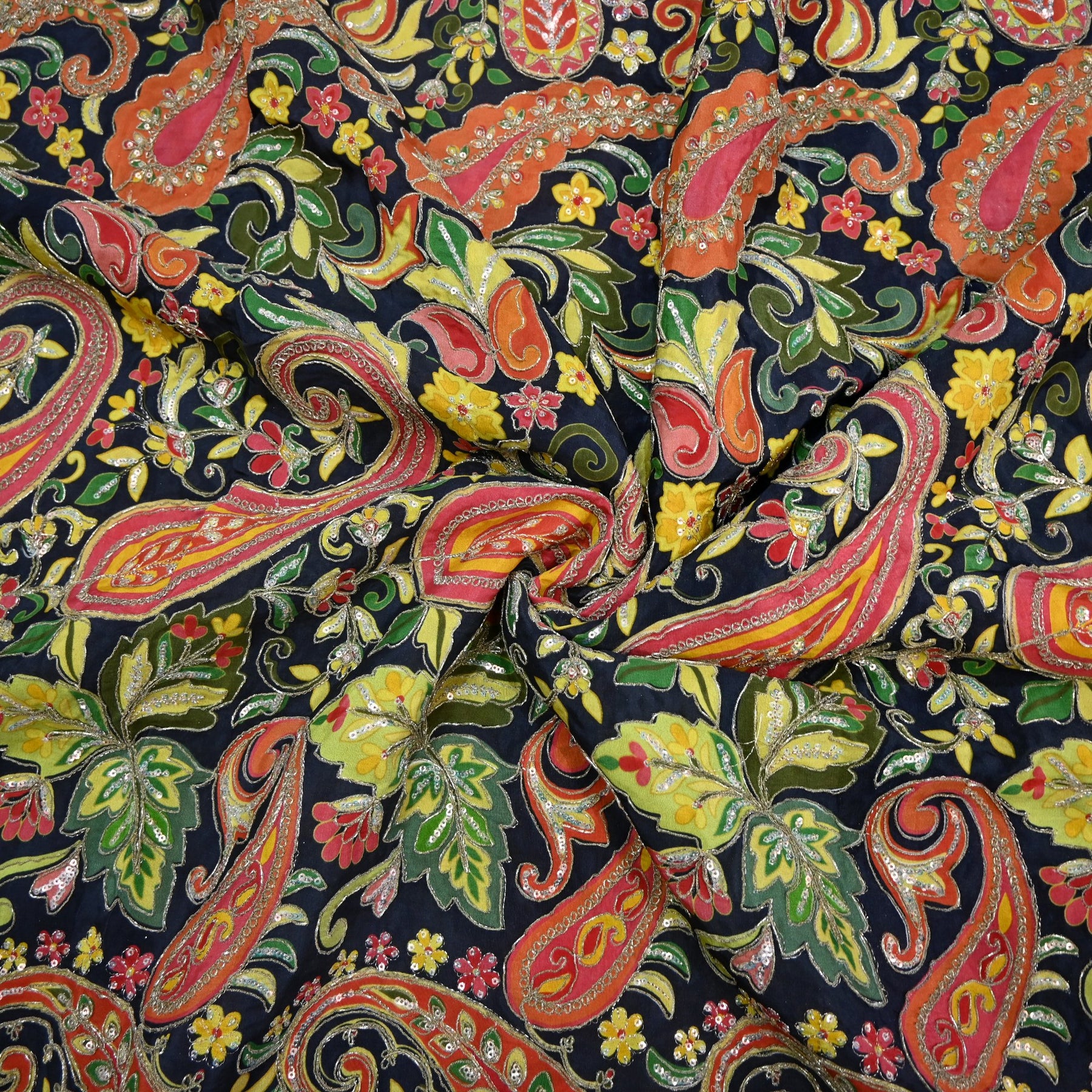 Product Name: Royal Crepe Floral Position Print Zari & Sequins Embellished Fabric