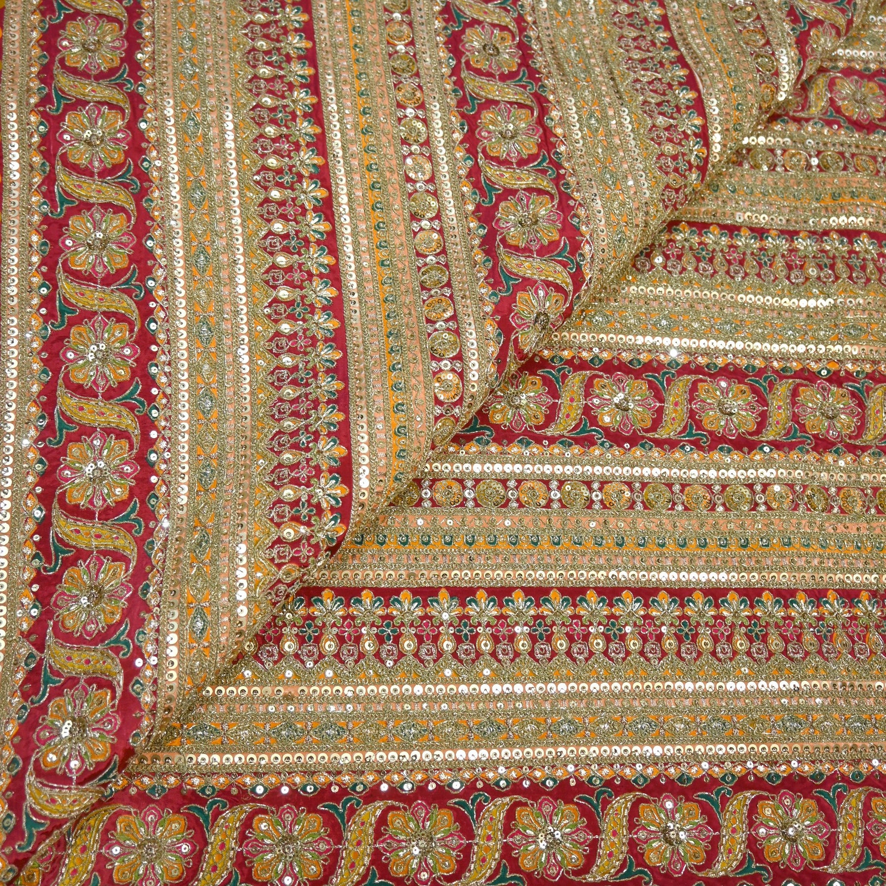 This fabric features elegant floral position printing, ensuring perfectly aligned motifs placed exactly for kurti panels, suits, dupattas, and lehenga patterns. The artistry is elevated with delicate Zari & Sequins hand-embellishment, adding a subtle festive sparkle and premium designer finish.
