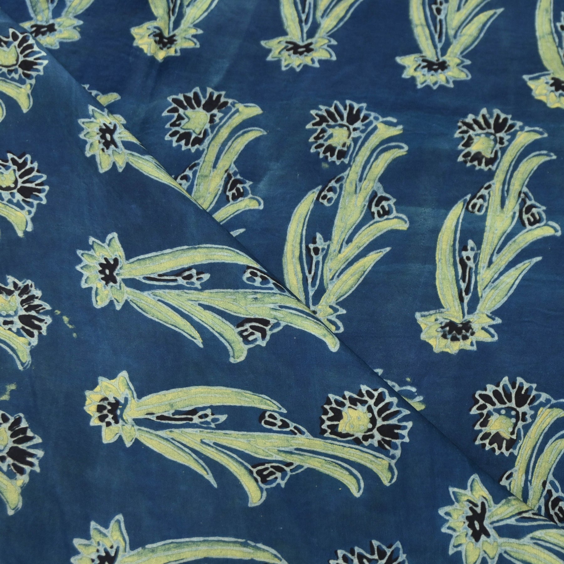 Elegant and artistic, this fabric features a rich deep indigo blue base adorned with delicate lotus and botanical motifs in refreshing shades of lime green and soft mint, highlighted with subtle dark outlines. The scattered floral pattern gives it a serene, nature-inspired appeal reminiscent of traditional hand-block prints.