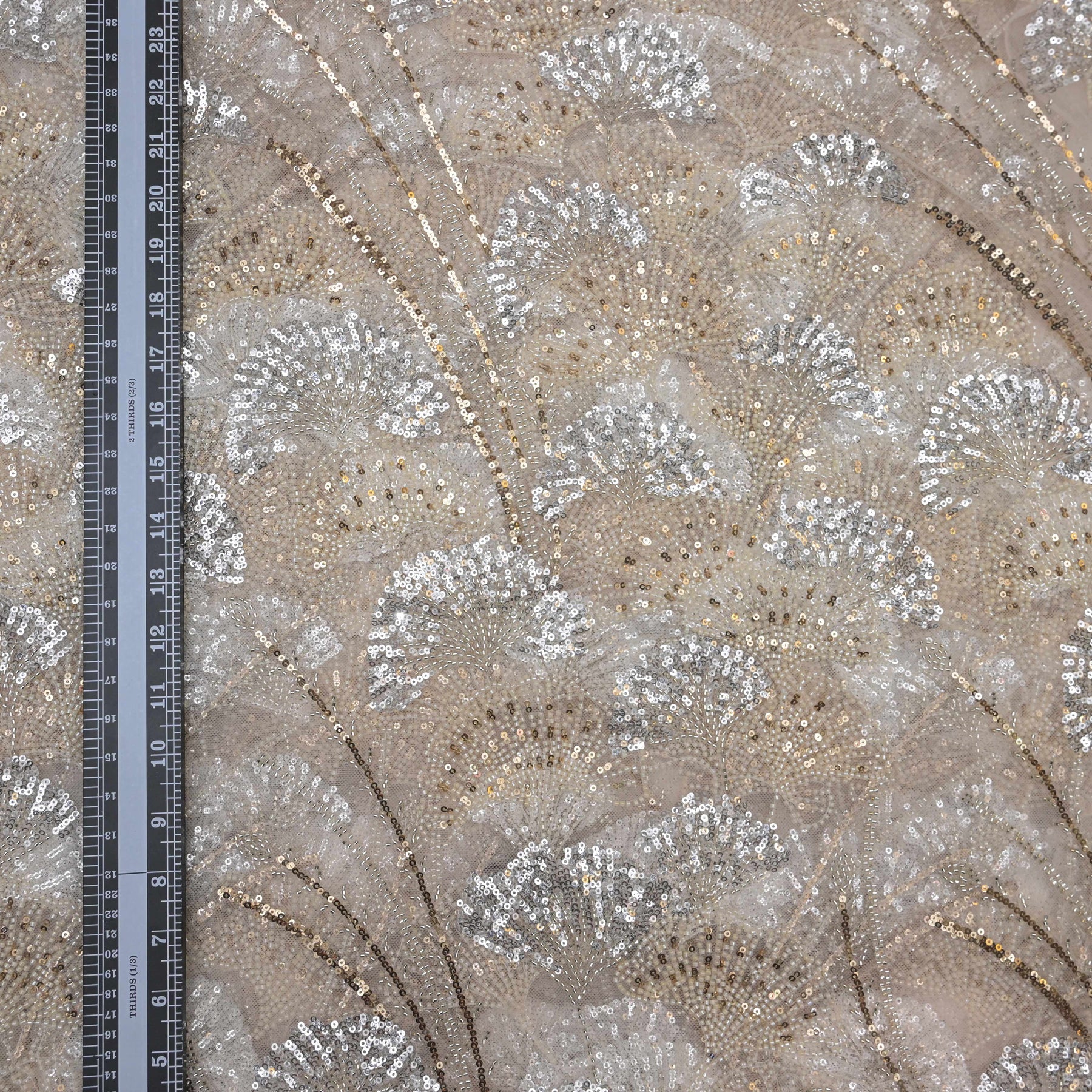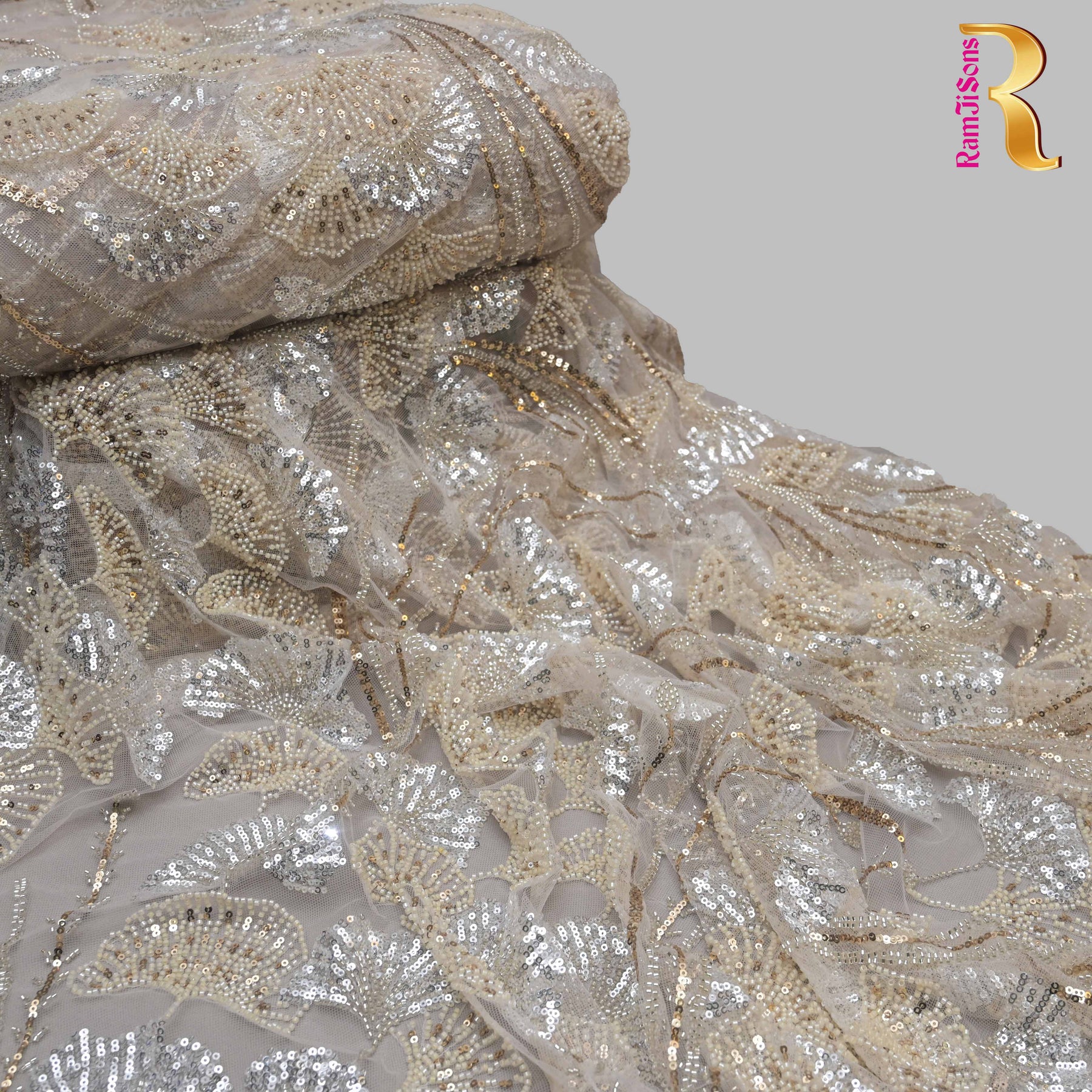 This exquisite fabric features rich cutdana, beads, and sequins embroidery crafted in an elegant Art Deco–inspired geometric pattern. Set on a deep, dark base, the shimmering metallic tones create a striking contrast, delivering a bold yet sophisticated look. The dense hand-embroidered detailing adds texture, depth, and high-end appeal, making this fabric a true statement choice.