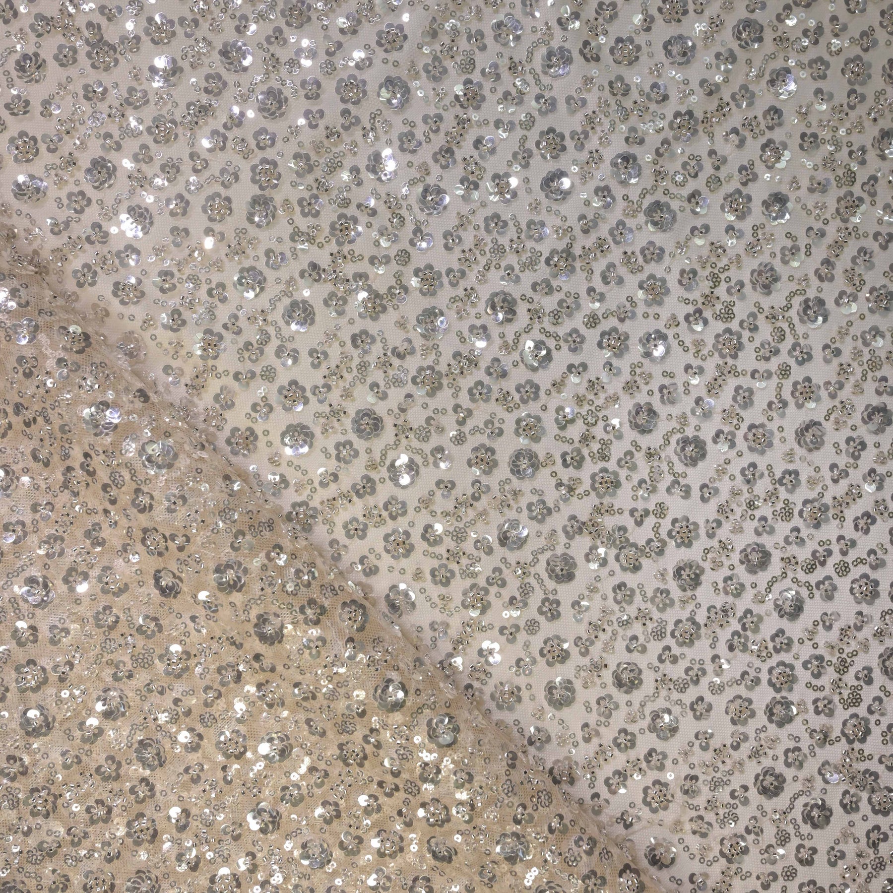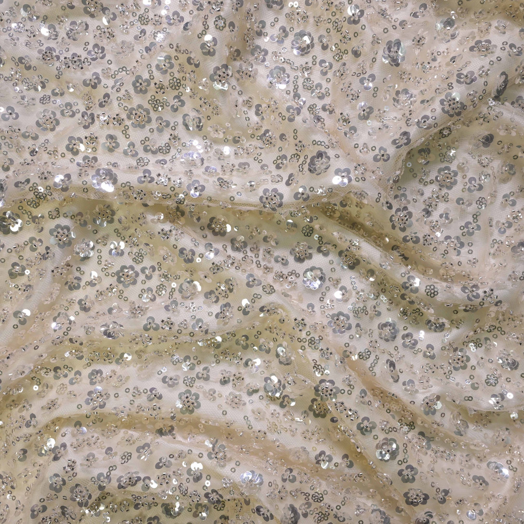 Exuding understated glamour, this champagne beige net fabric is intricately embellished with all-over floral sequin embroidery in shimmering silver tones. The warm neutral base enhances the sparkle of the sequins, creating a refined, luminous effect perfect for occasionwear.