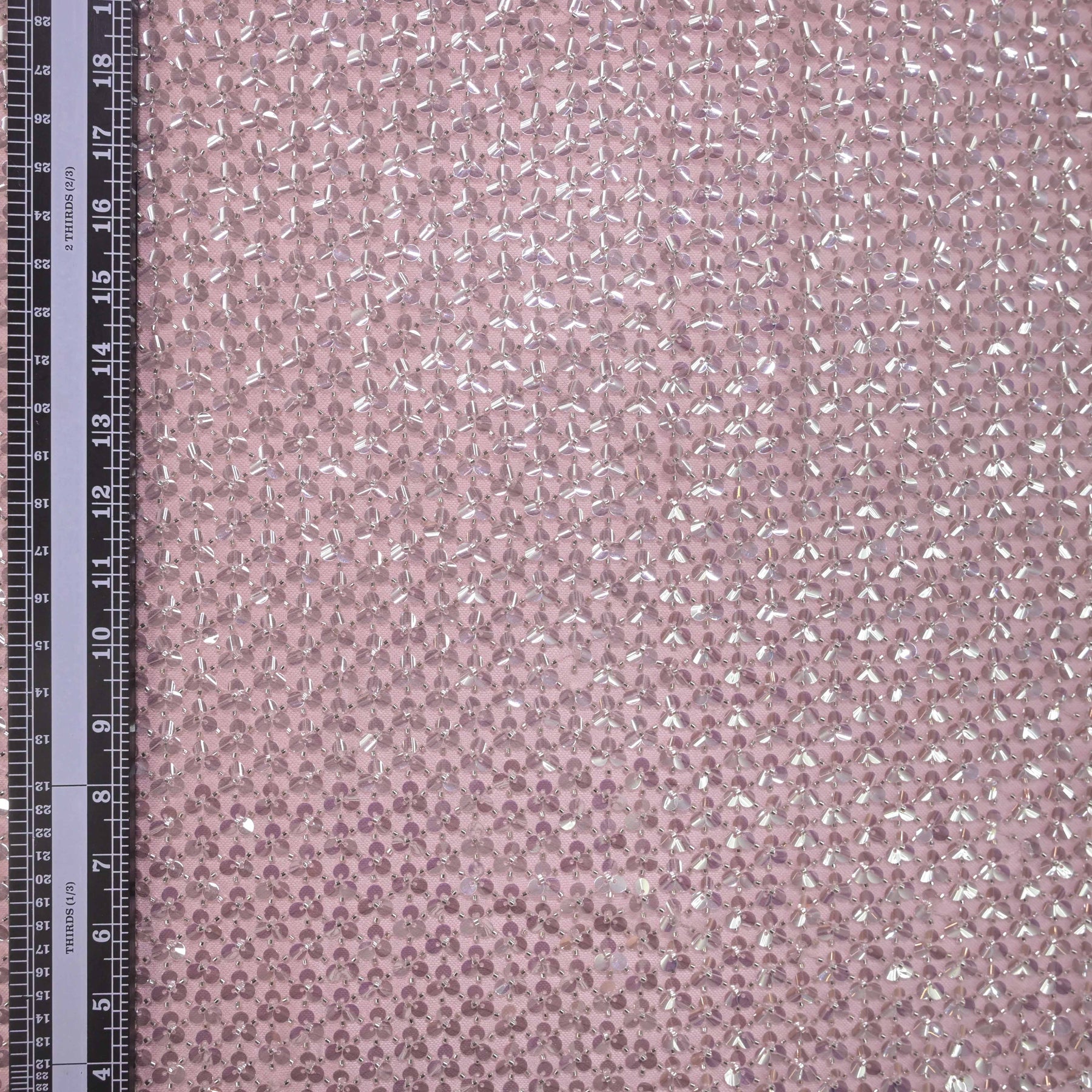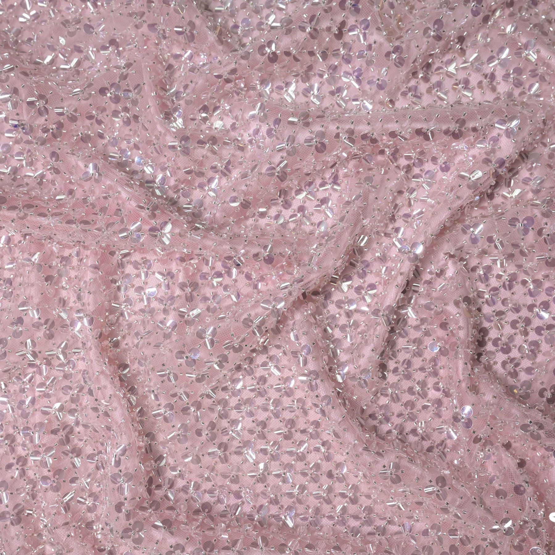 This fabric features a delicate blush pink mesh base adorned with densely scattered clear sequins and subtle bead accents, creating a soft yet radiant shimmer. The light-catching embellishments add dimension and sparkle while the sheer foundation keeps the fabric airy and fluid. Romantic and elegant, this fabric is ideal for evening gowns, cocktail dresses, overlays, bridal or bridesmaid designs, costumes, and statement accessories where a gentle pink glow and refined glamour are desired.