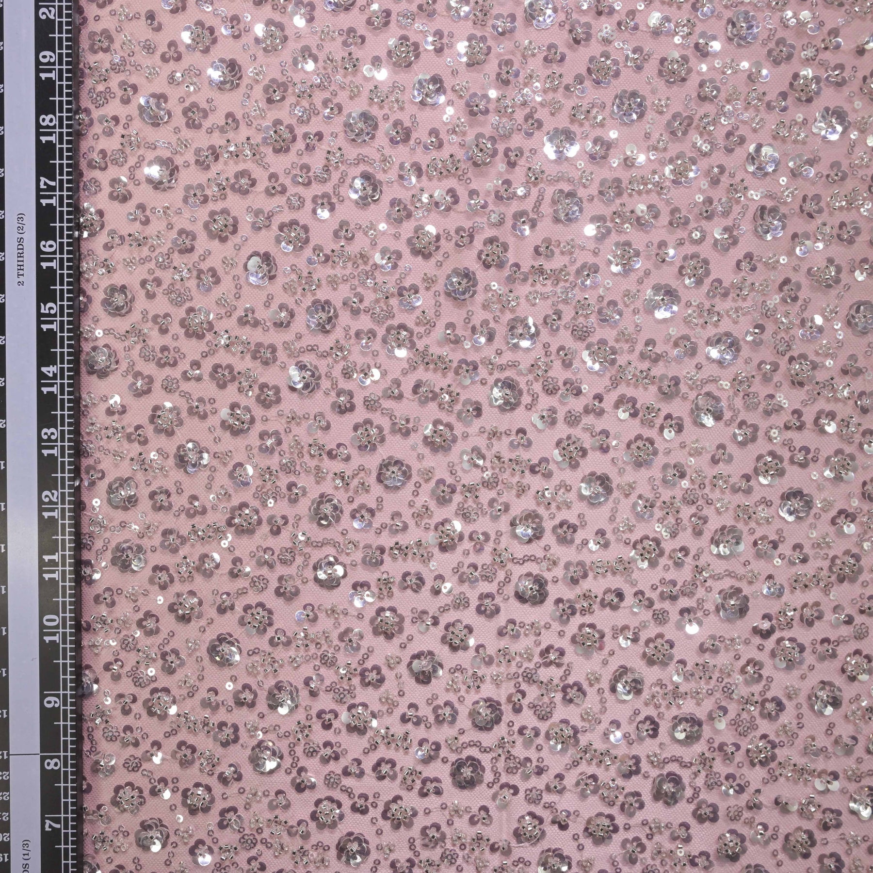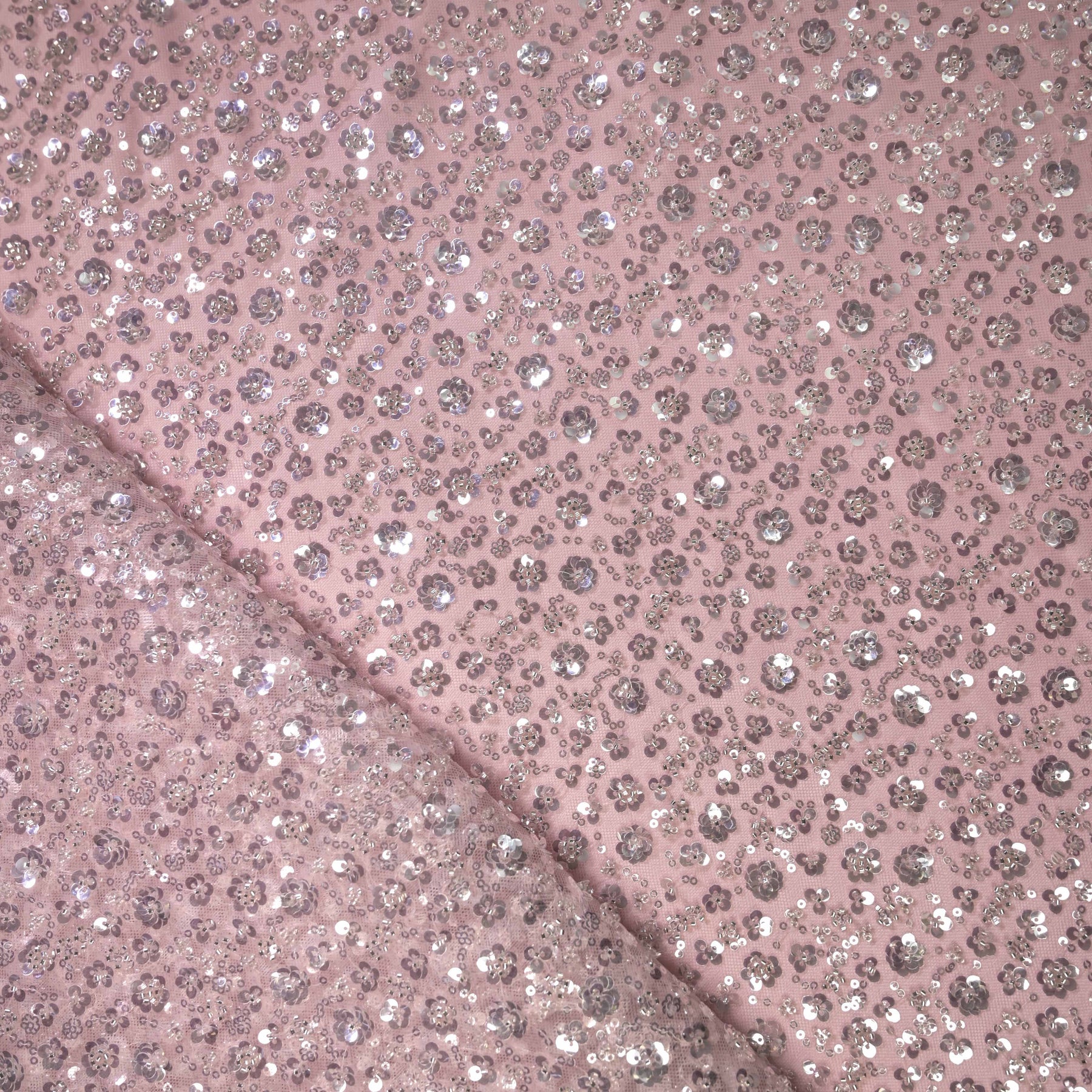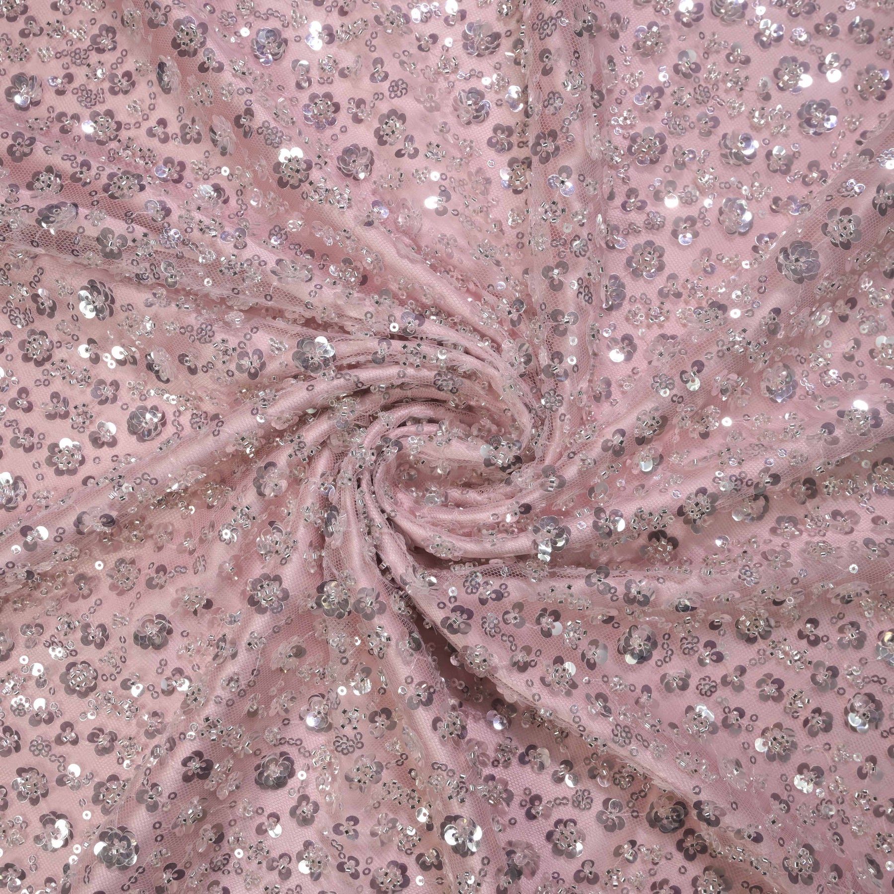 Graceful and feminine, this dusty rose net fabric is adorned with delicate all-over floral sequin embroidery in shimmering silver tones. The soft pink base paired with reflective sequins creates a refined sparkle that feels sophisticated yet dreamy.