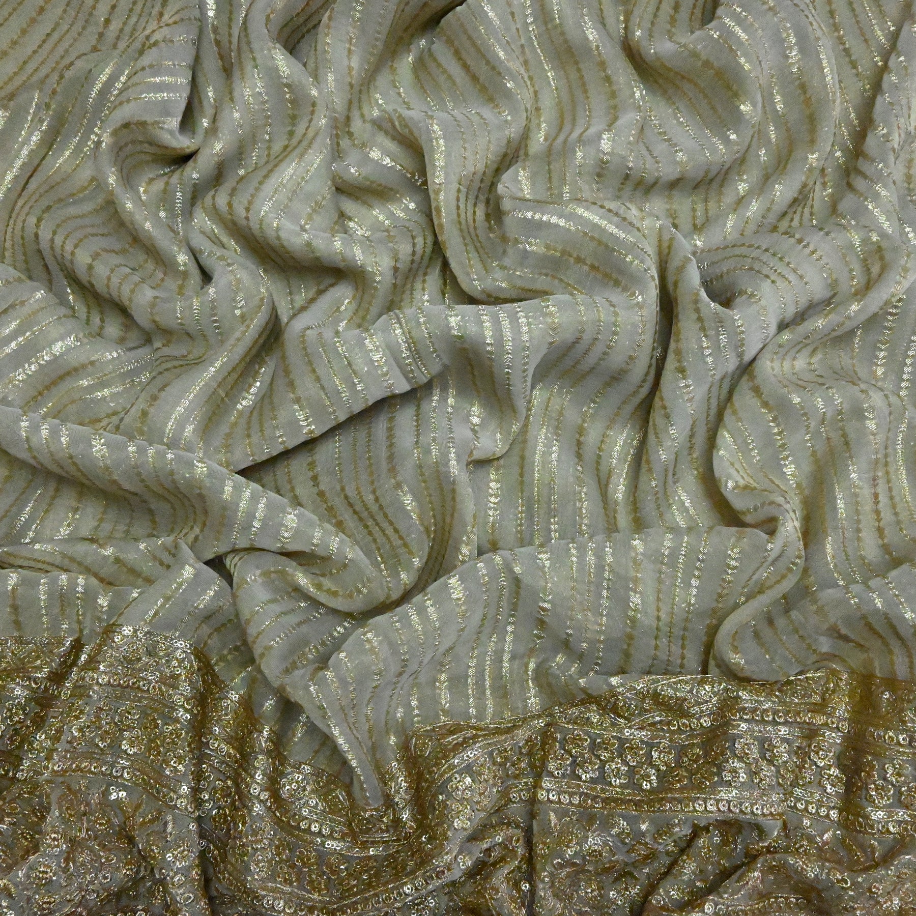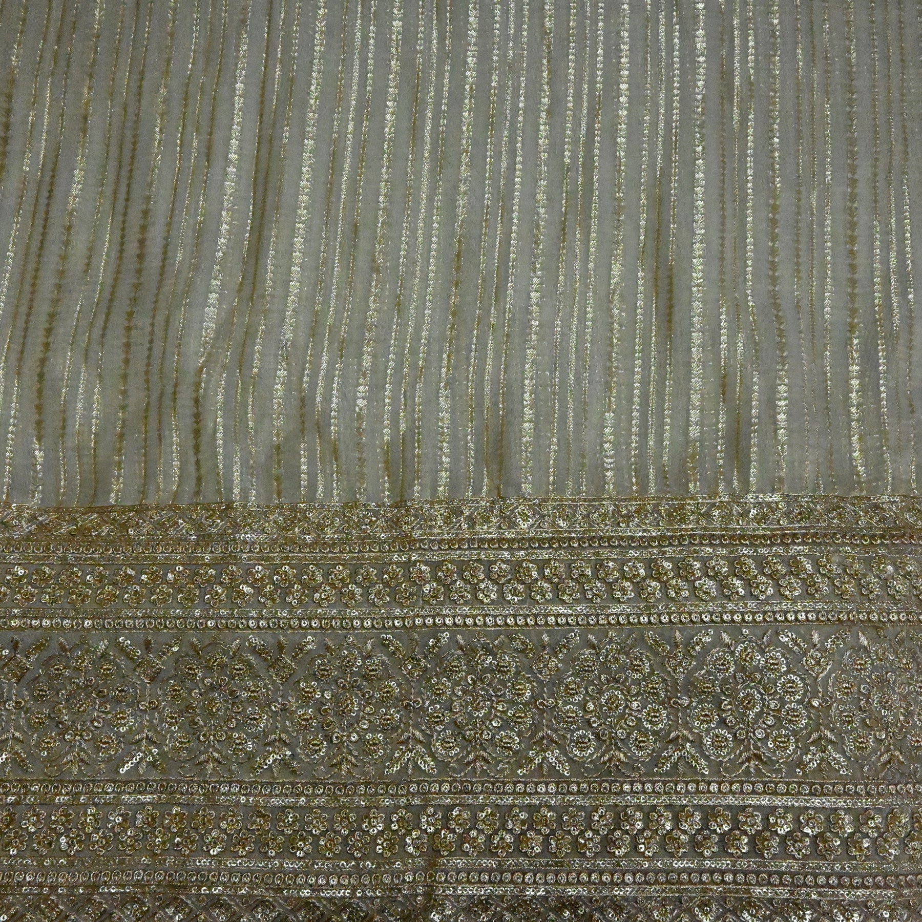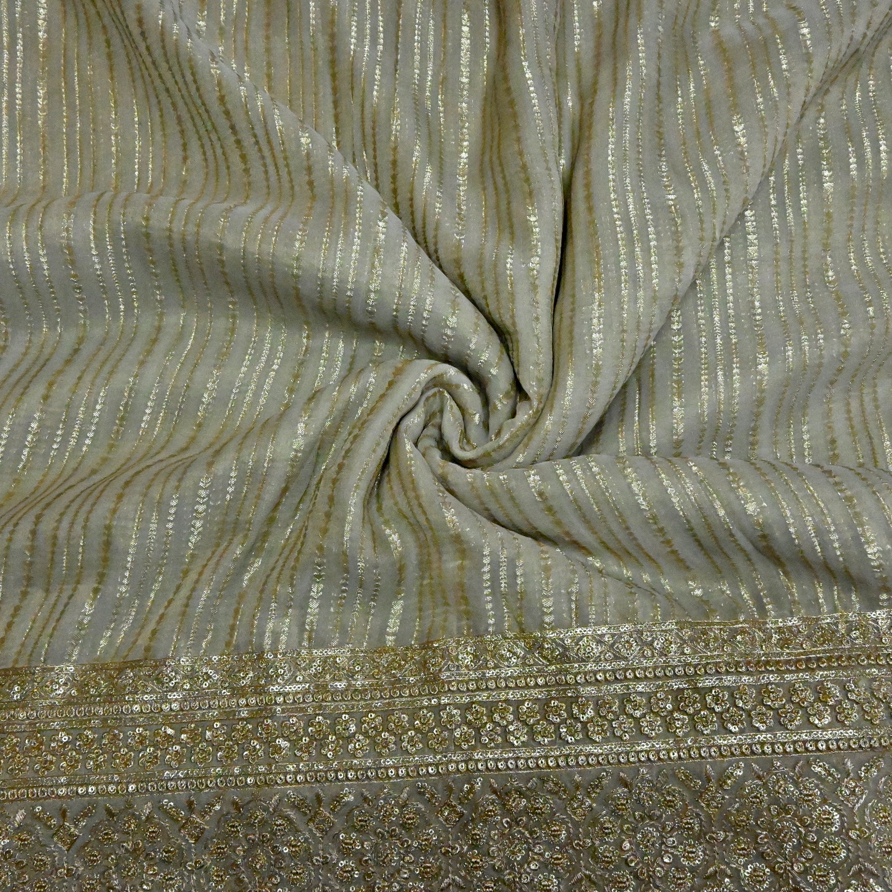 This exquisite Organza Tissue Zari Jacquard Fabric is designed with a rich tissue base and elegant zari weave. The highlight of this fabric is its heavy sequins embroidered border at the bottom, adding a glamorous and royal finish to every outfit. Lightweight yet luxurious, it is a perfect choice for creating lehengas, sarees, gowns, and other designer wear. A true designer’s favorite, this fabric brings grace, beauty, and sophistication to any occasion.