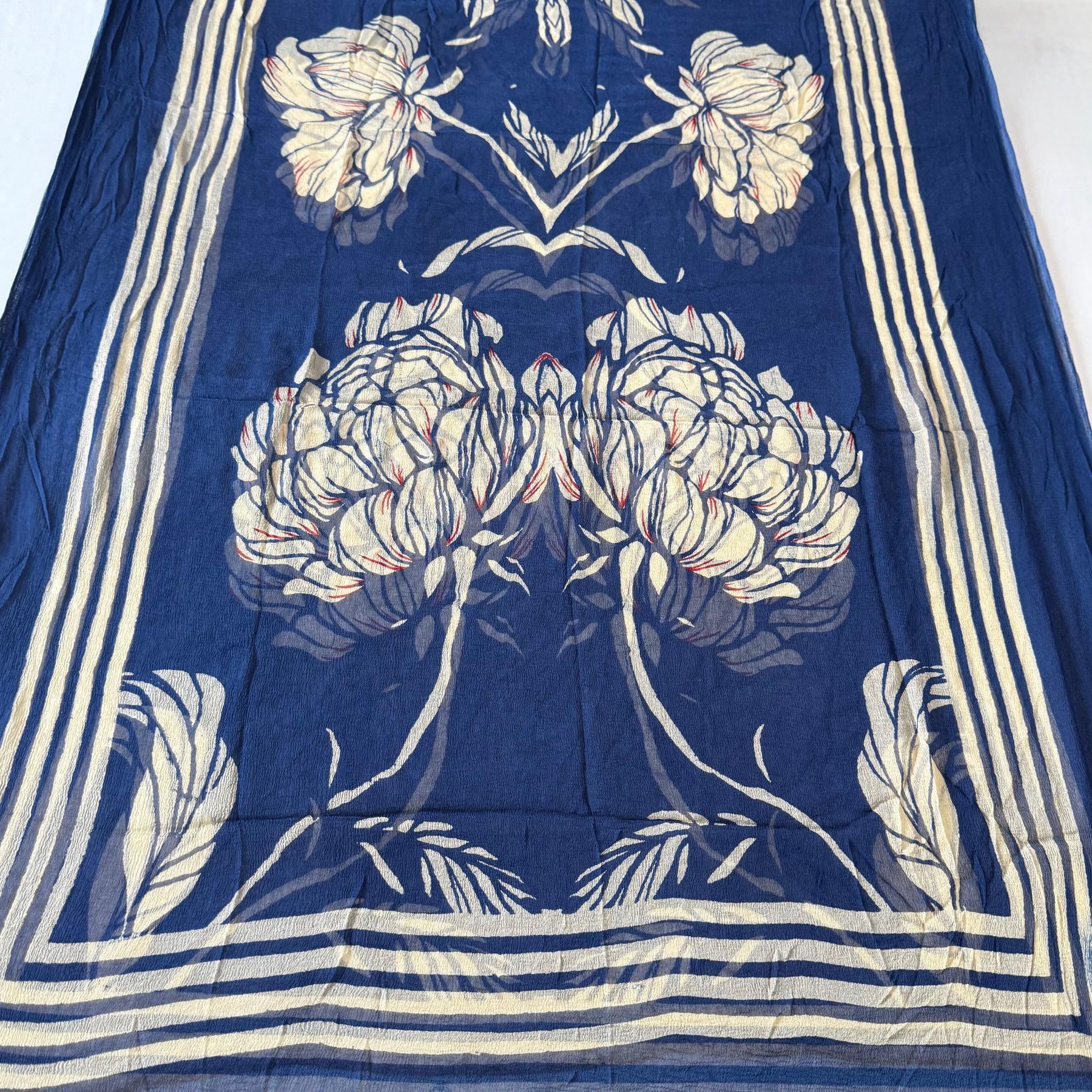 Make a statement in timeless blue with this Royal Indigo Stripe Unstitched Suit Set. Designed in breathable cotton, the kurta features classic ivory stripes enhanced with a beautifully detailed embroidered panel, adorned with delicate mirror work.