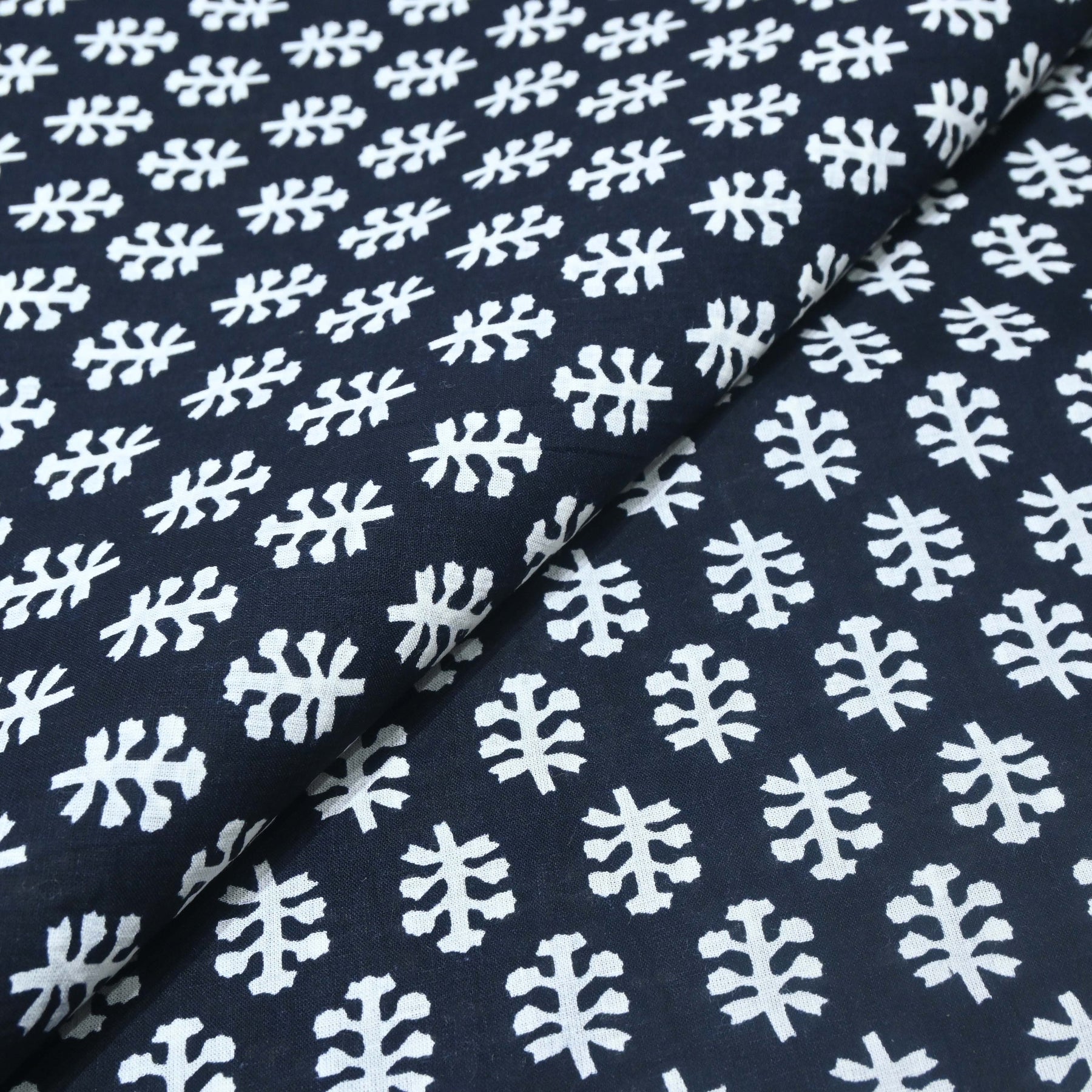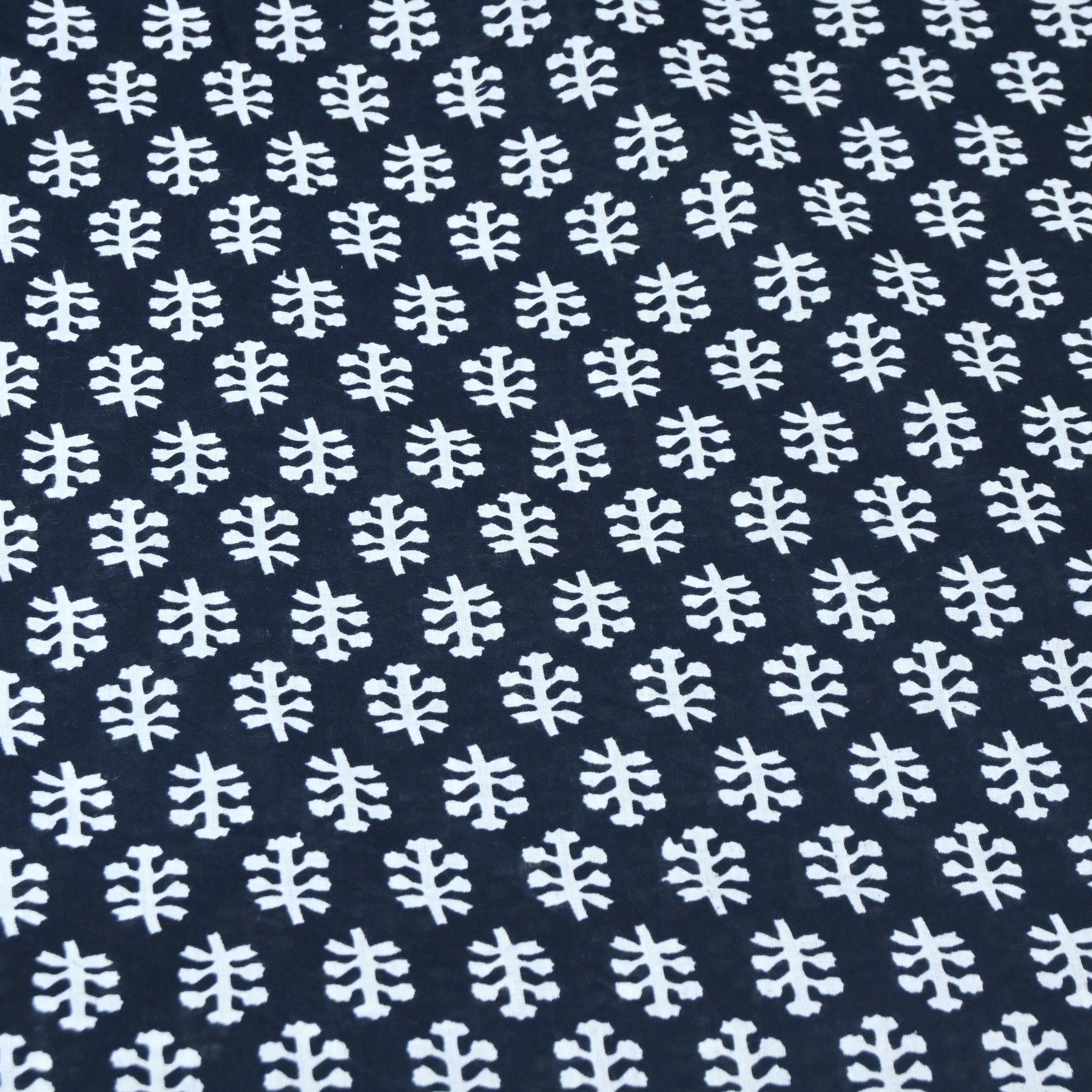 Bright and refreshing, this Printed Cotton Fabric features delicate white leafy motifs arranged in a neat, repeating pattern over a vibrant base.