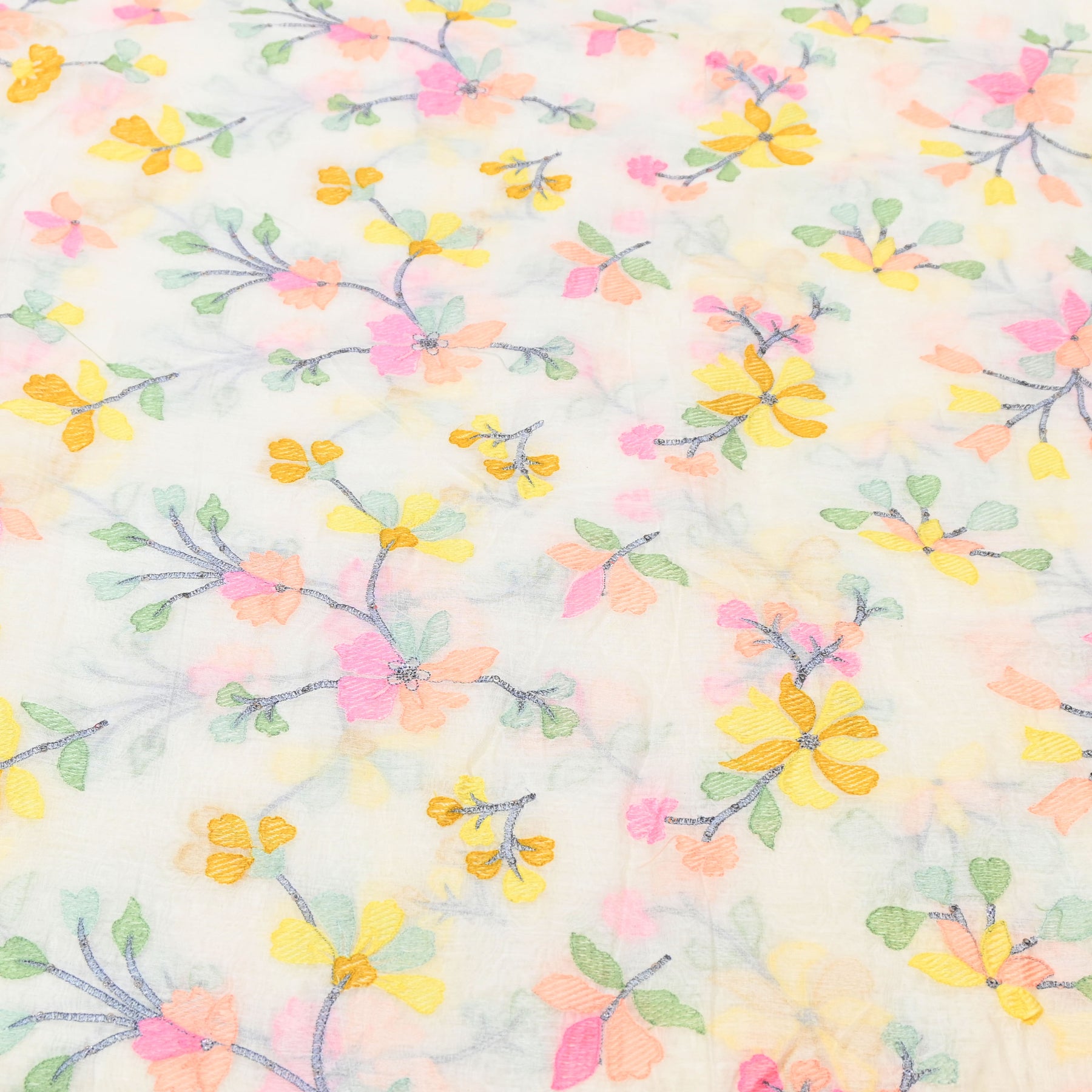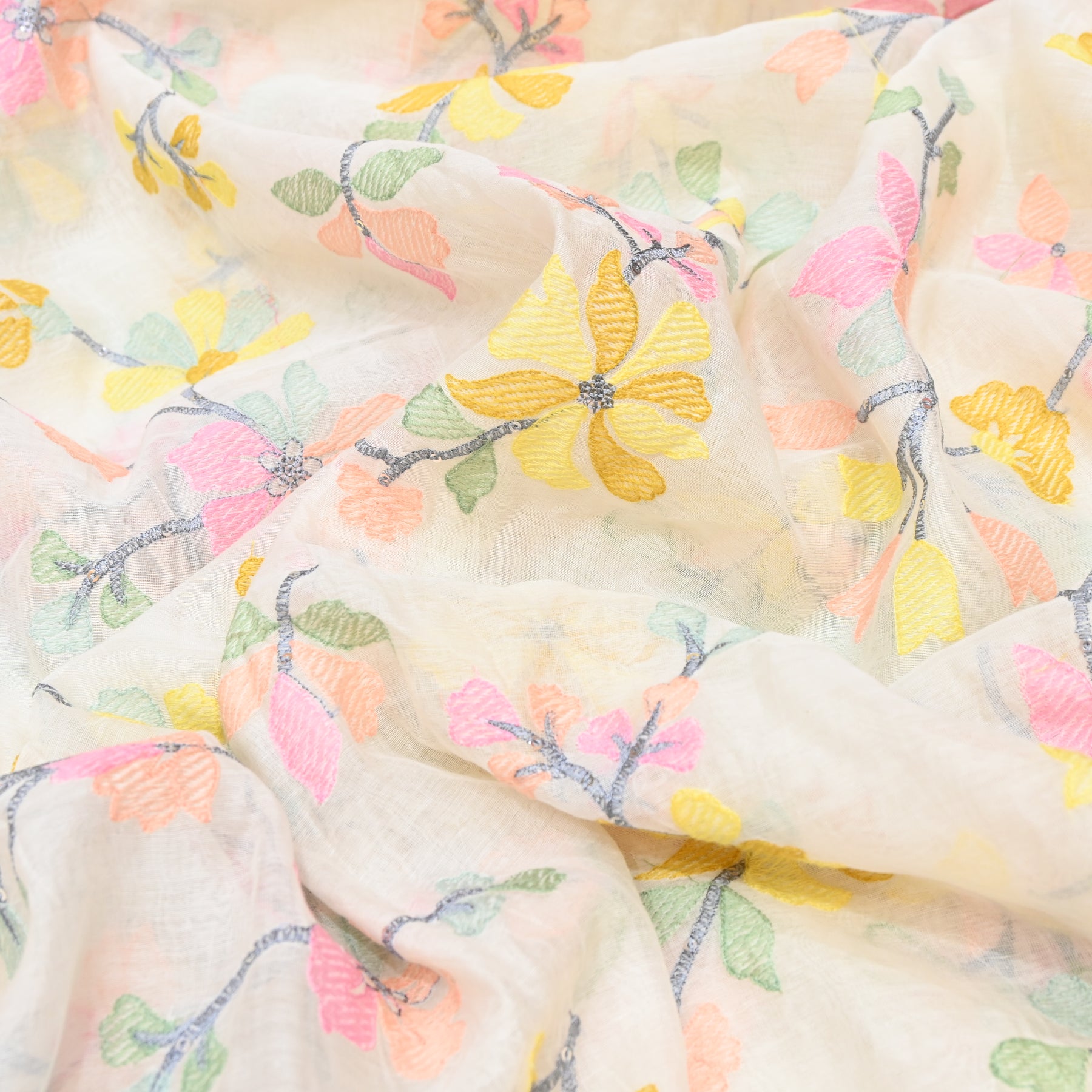 Bright, cheerful, and effortlessly elegant, this Mul Chanderi fabric features a off white base that radiates warmth and positivity. The fabric is beautifully adorned with delicate embroidered flying bird motifs, each outlined in fine white thread and filled with soft pastel hues such as pink, yellow and olive green. Subtle shadow-style impressions behind the birds add a graceful sense of motion, giving the design a playful yet artistic appeal.