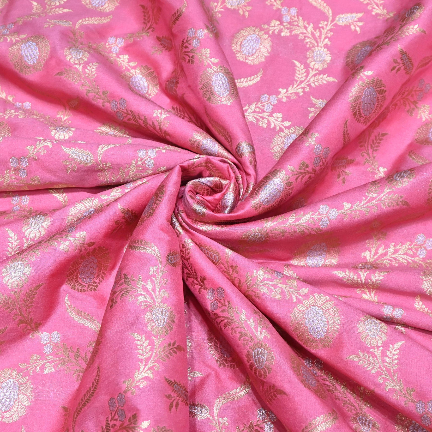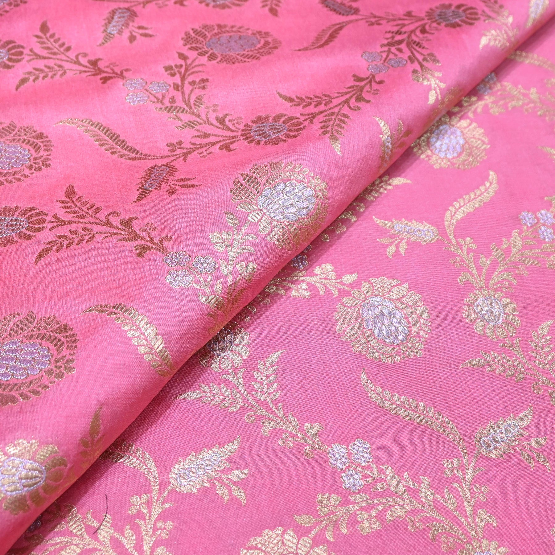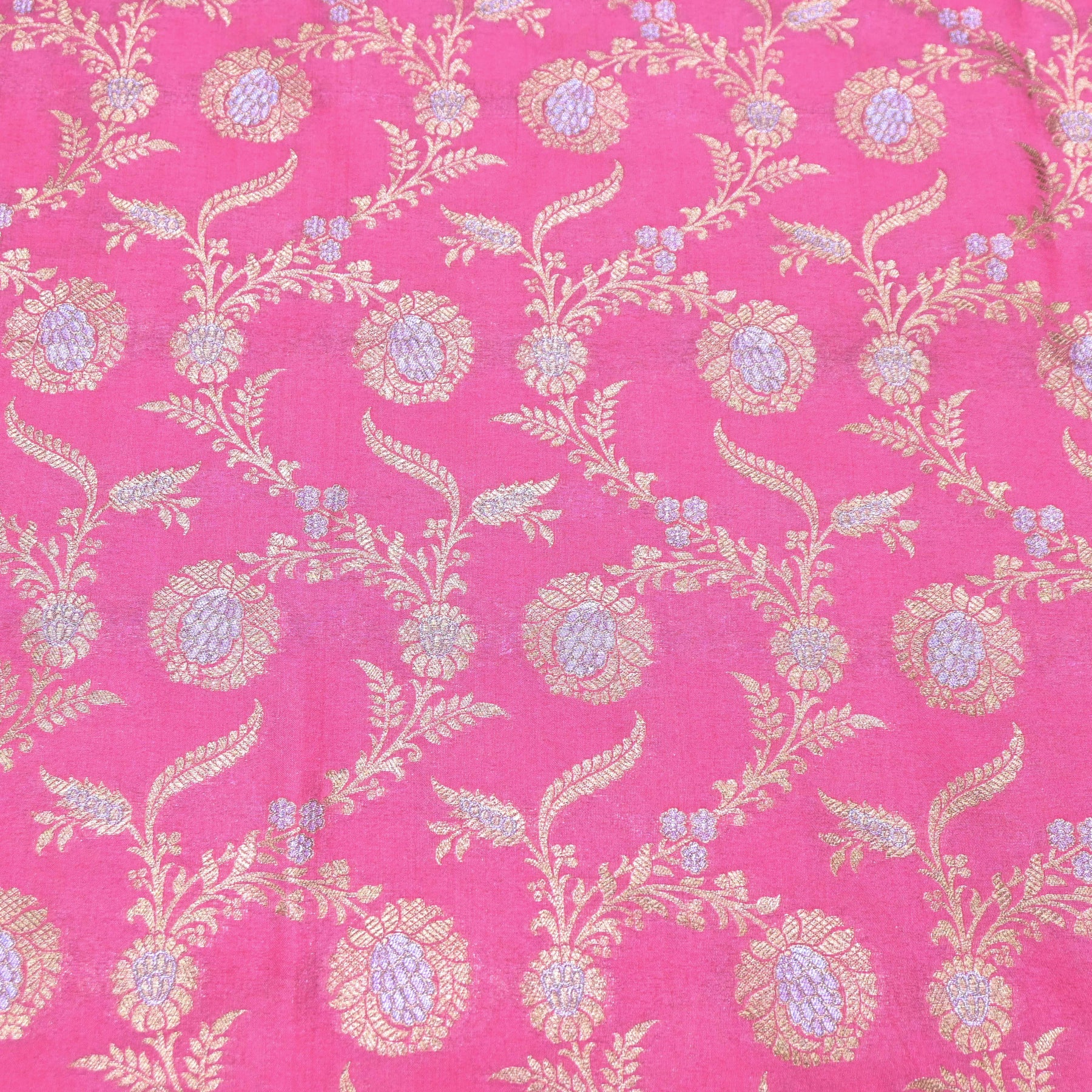 Vibrant and elegant, this coral Pink Brocade Fabric is intricately woven with antique gold zari floral motifs in a graceful diagonal vine pattern. The rich rani pink base adds a festive brightness, while the shimmering gold detailing enhances its royal appeal.
